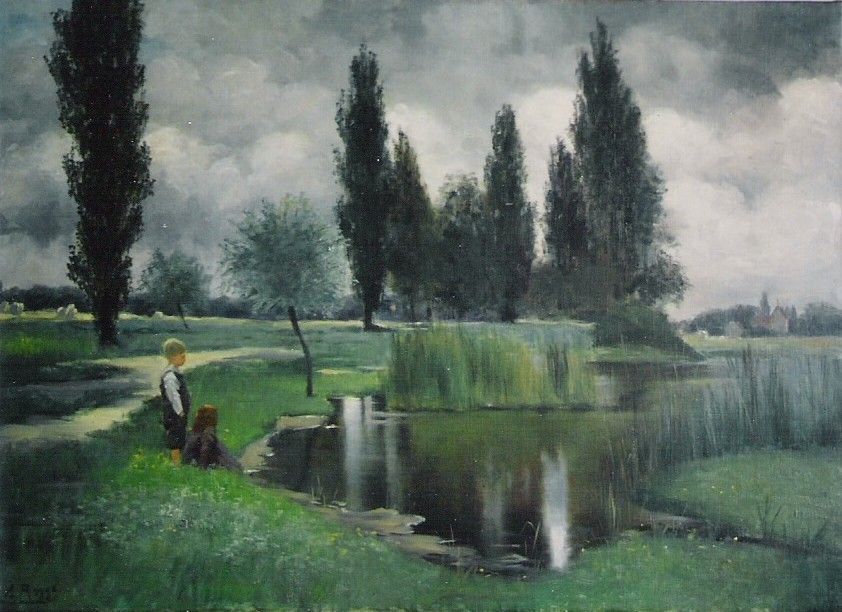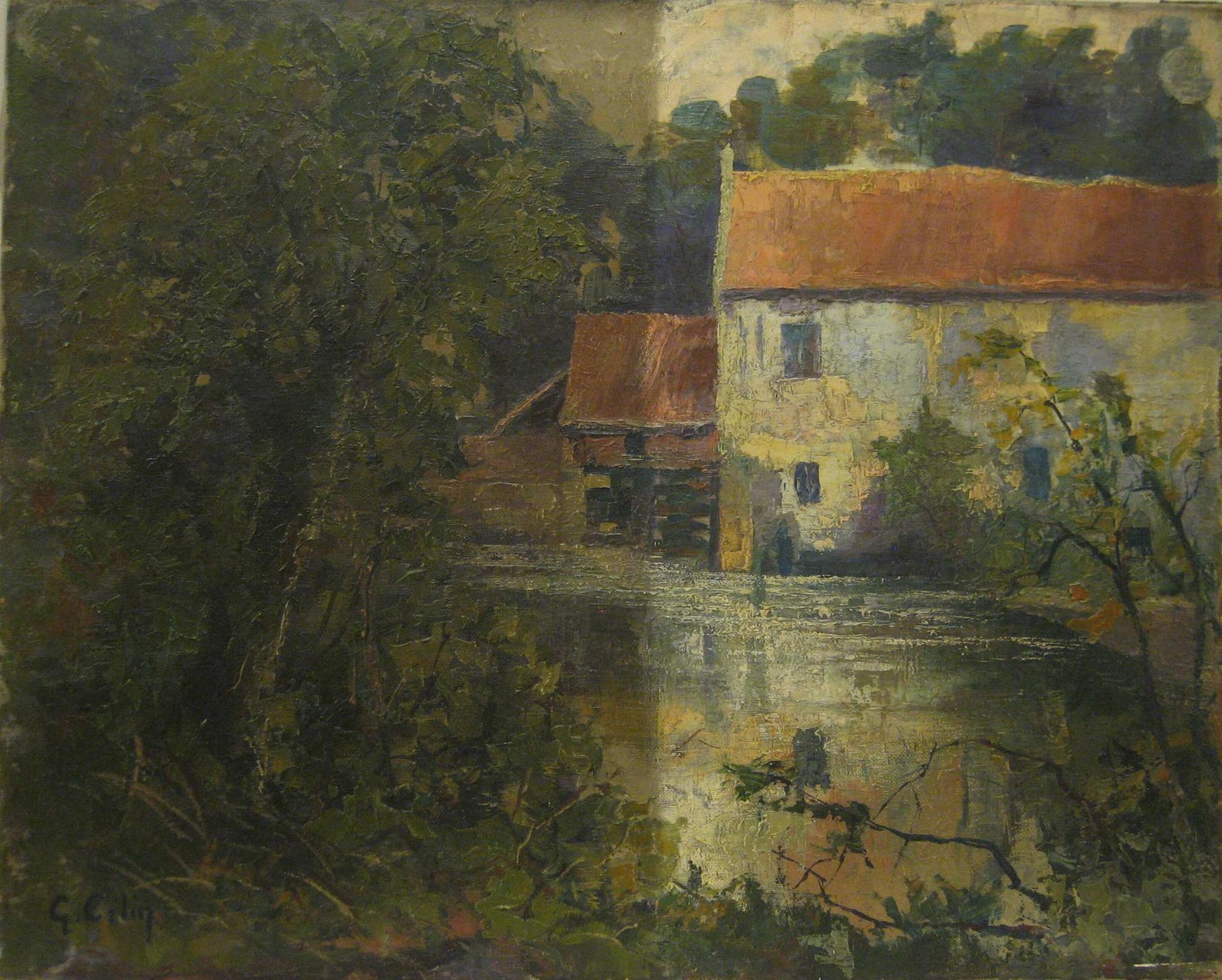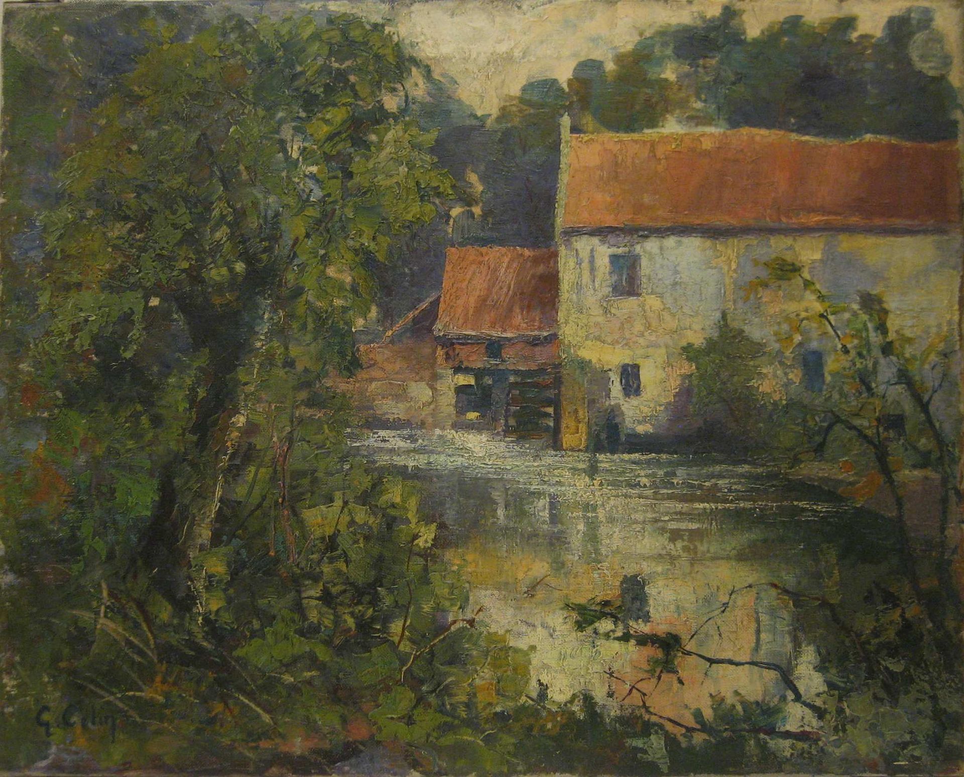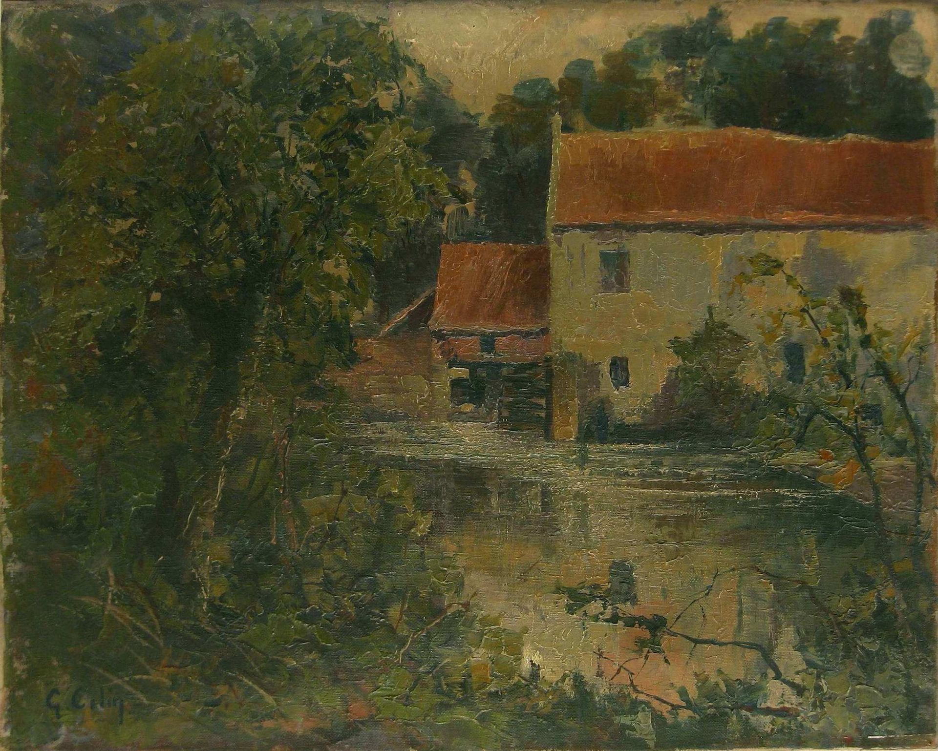 Gustave Colin (1828-1910), um 1890 "Landschaft mit Wassermühle". Öl auf Leinwand. Zustand nach der Restaurierung.