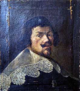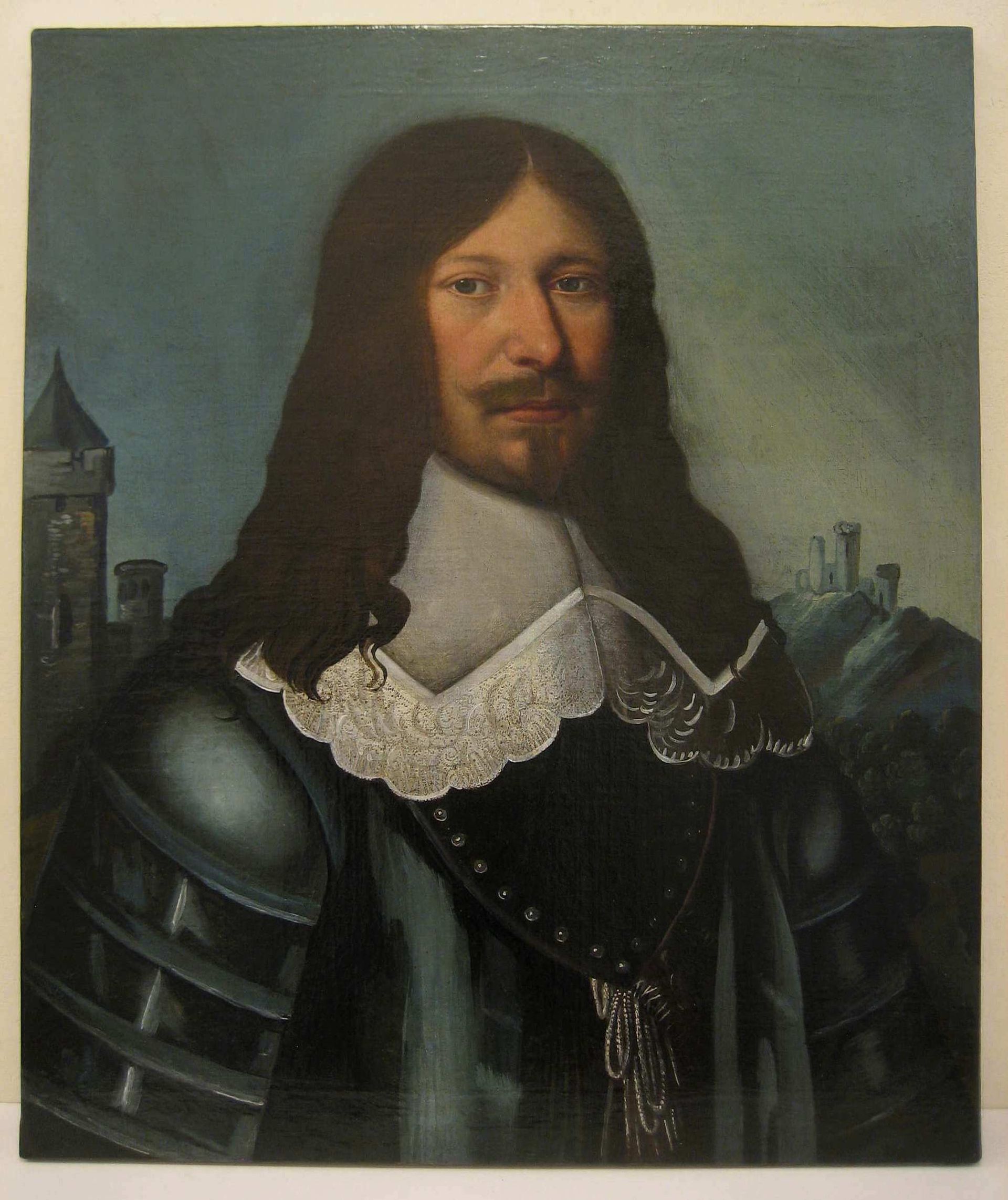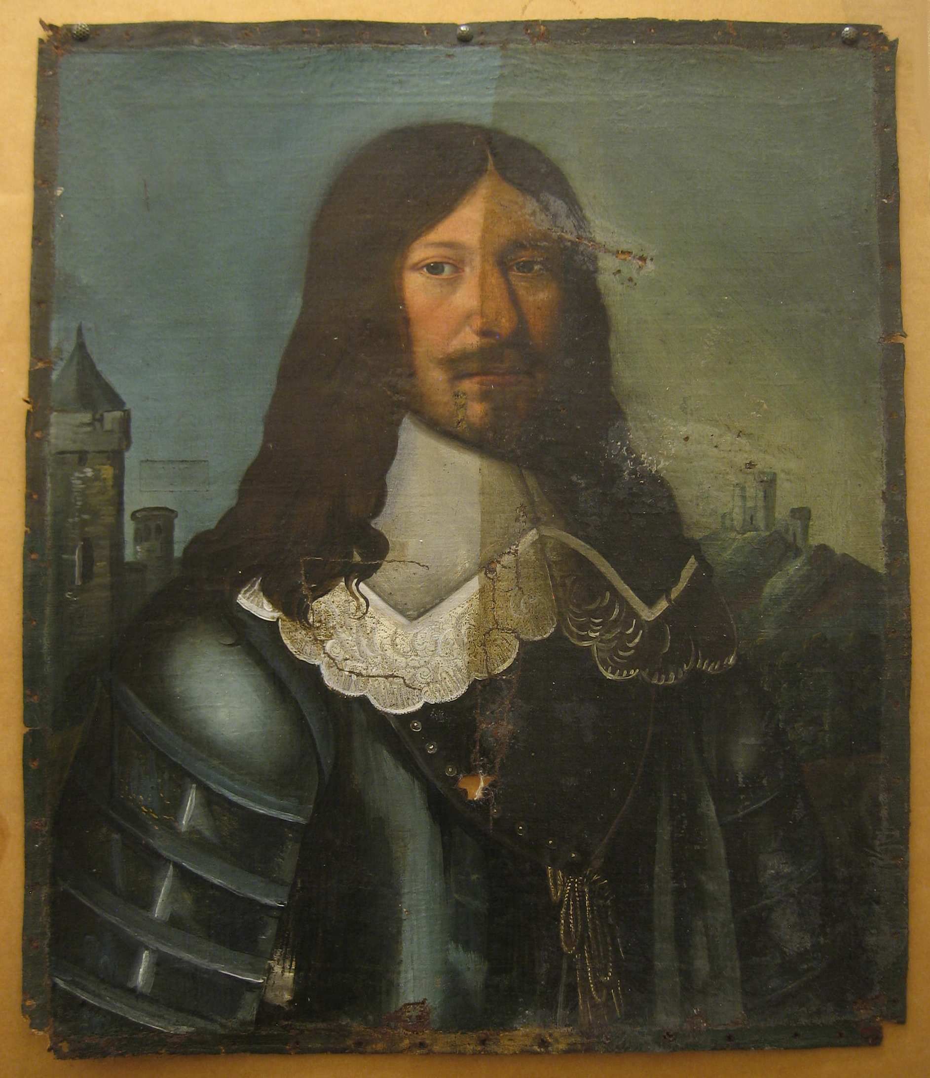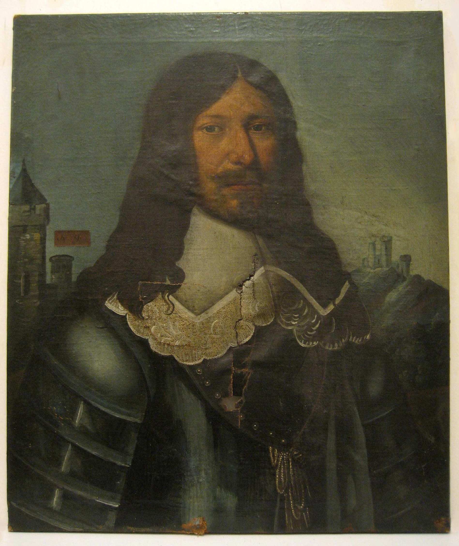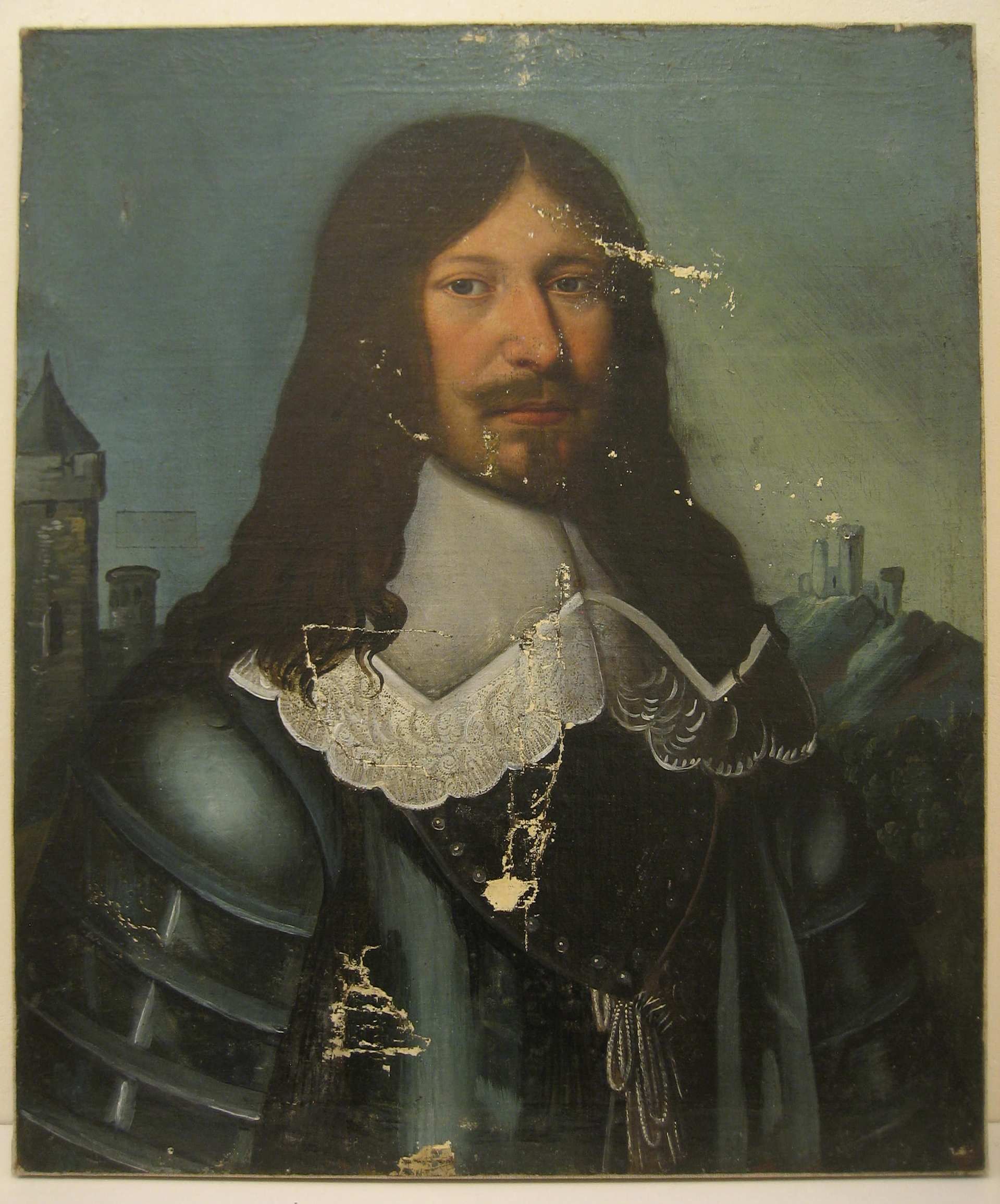 Bildnismaler, 17. Jh. "Robert I. Baron von Signau". Öl auf Leinwand. Zustand vor der Restaurierung (Bildoberfläche verschmutzt, Firnis stark nachgedunkelt; mehrere provisorisch reparierte Leinwandrisse und Leinwandlöcher; mehrere Übermalungen und Retuschen).