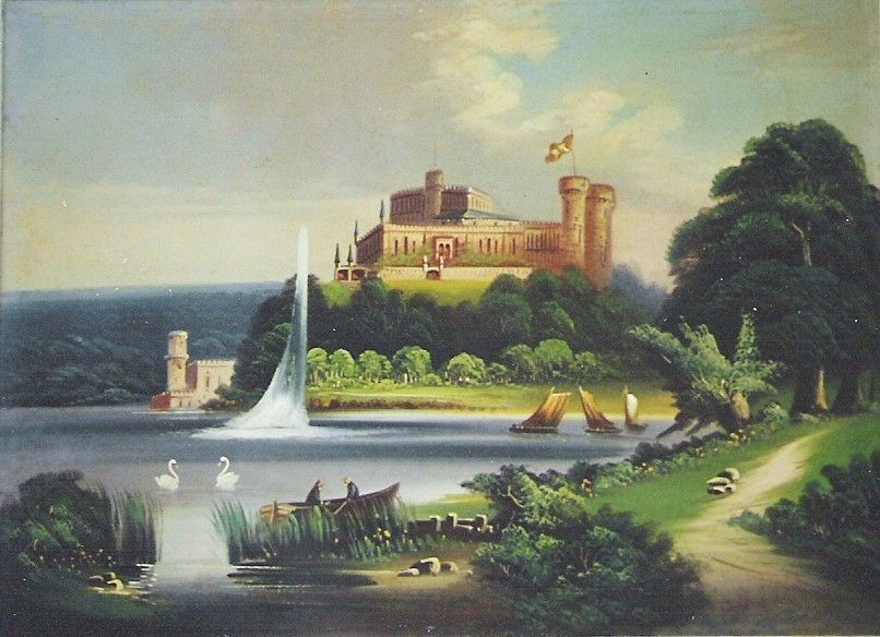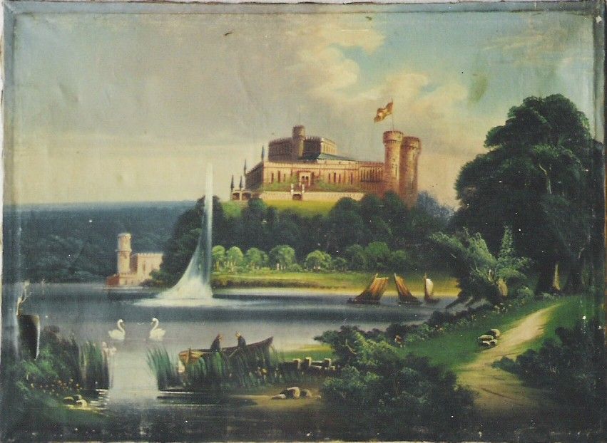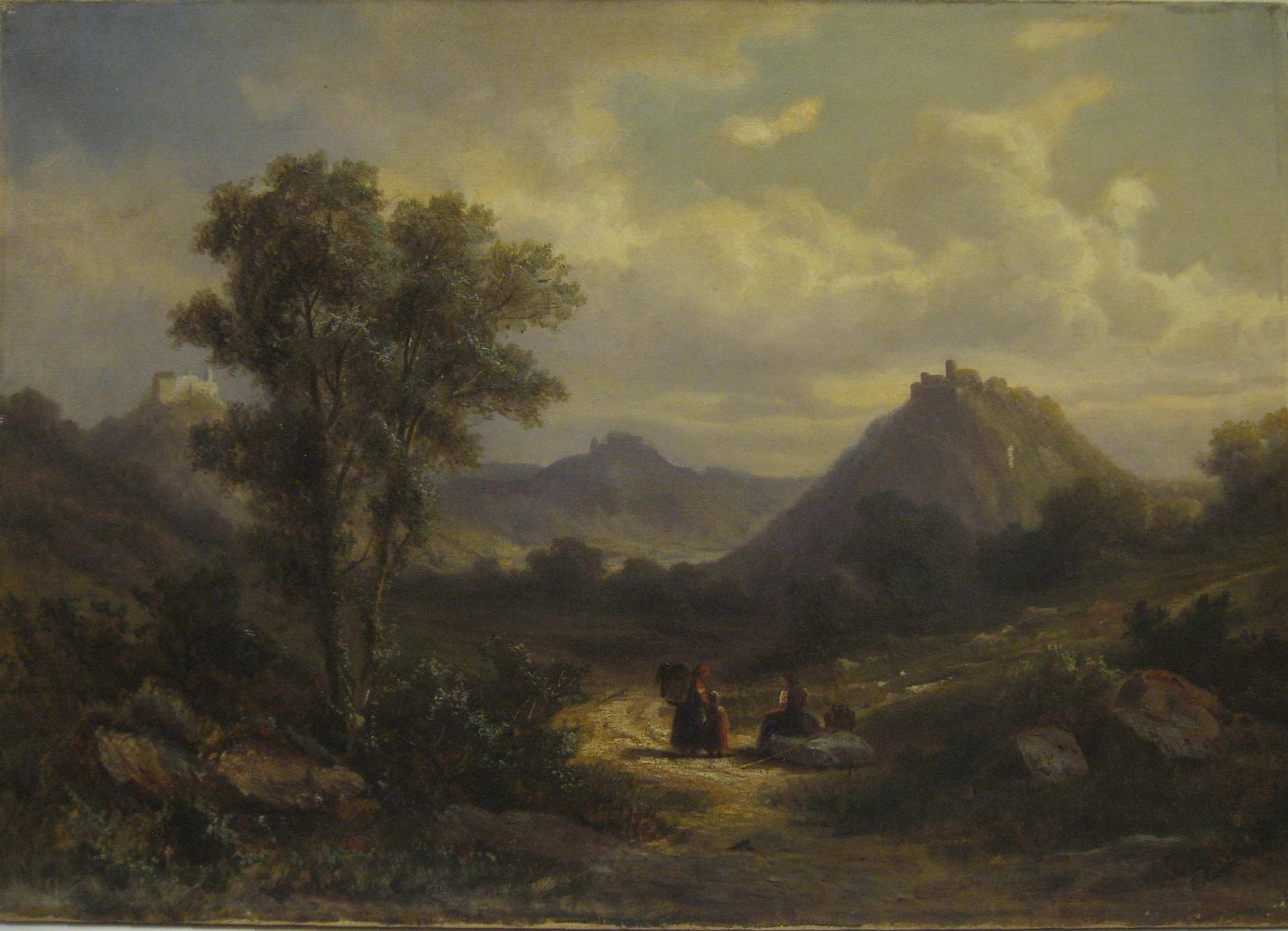Emil Harke (1837-1881), 1863 "Die drei Gleichen in Thüringen". Öl auf Leinwand. Zustand vor der Restaurierung (Bildoberfläche verschmutzt, Firnis vergilbt).