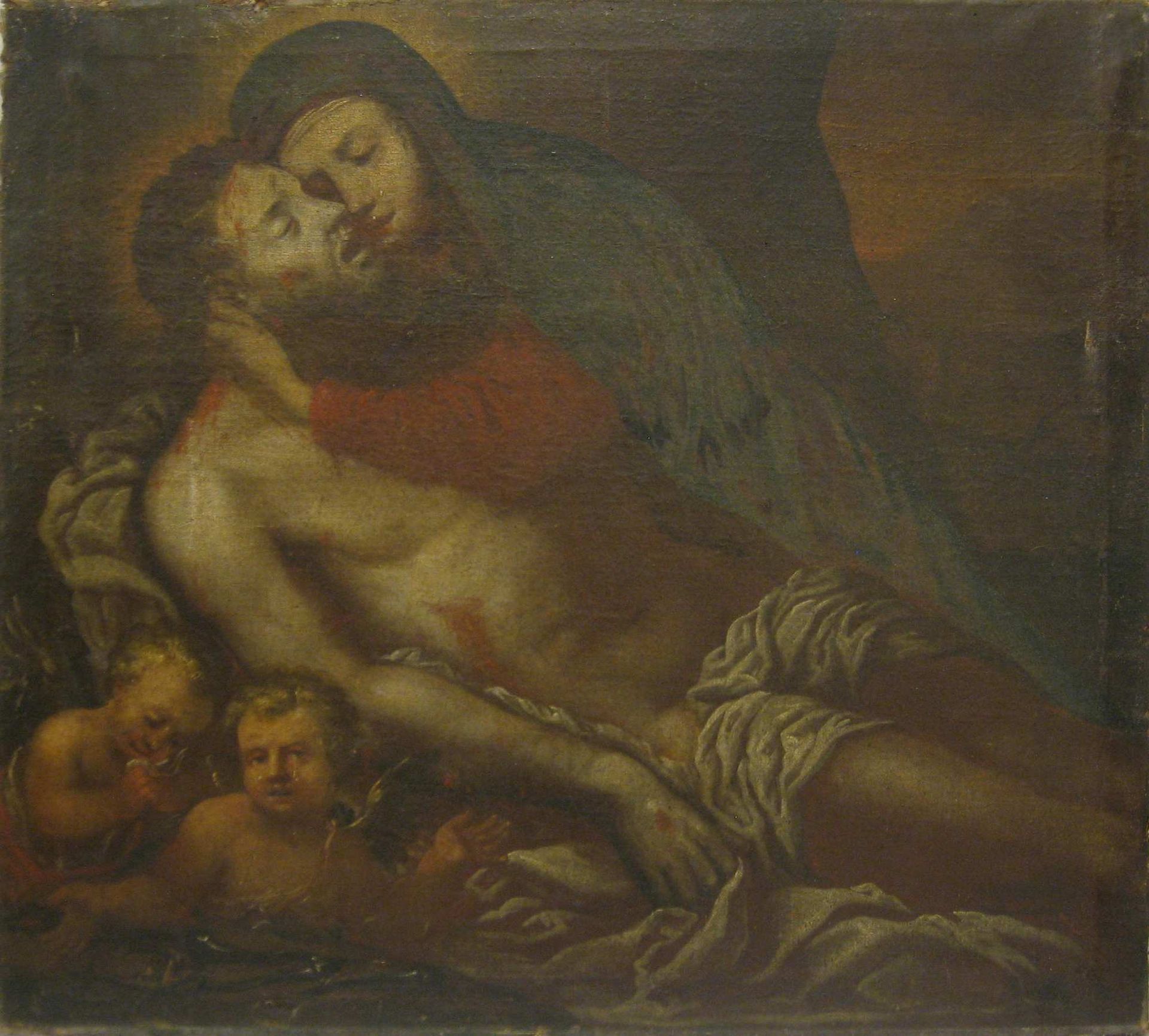 Kirchenmaler Elias Schyz, 1714 "Die Beweinung Christi". Öl auf Leinwand. Zustand vor der Restaurierung (Malschicht verschmutzt, Firnis stark vergilbt).