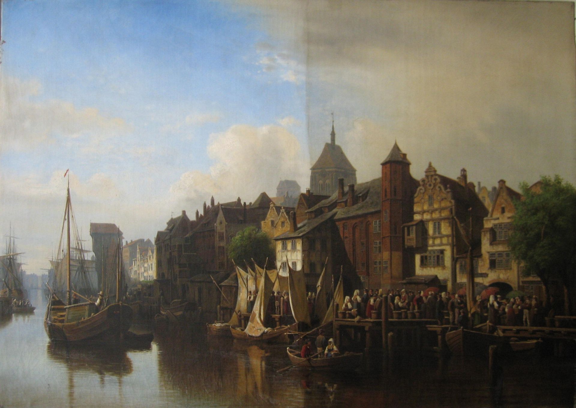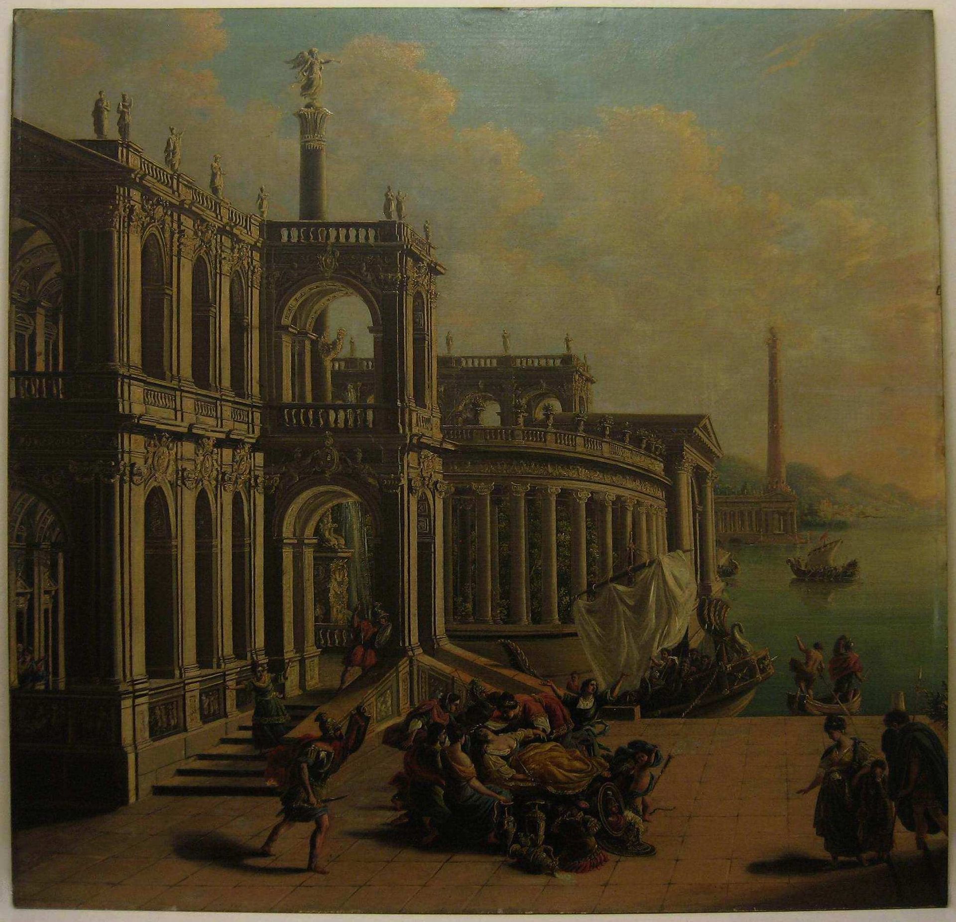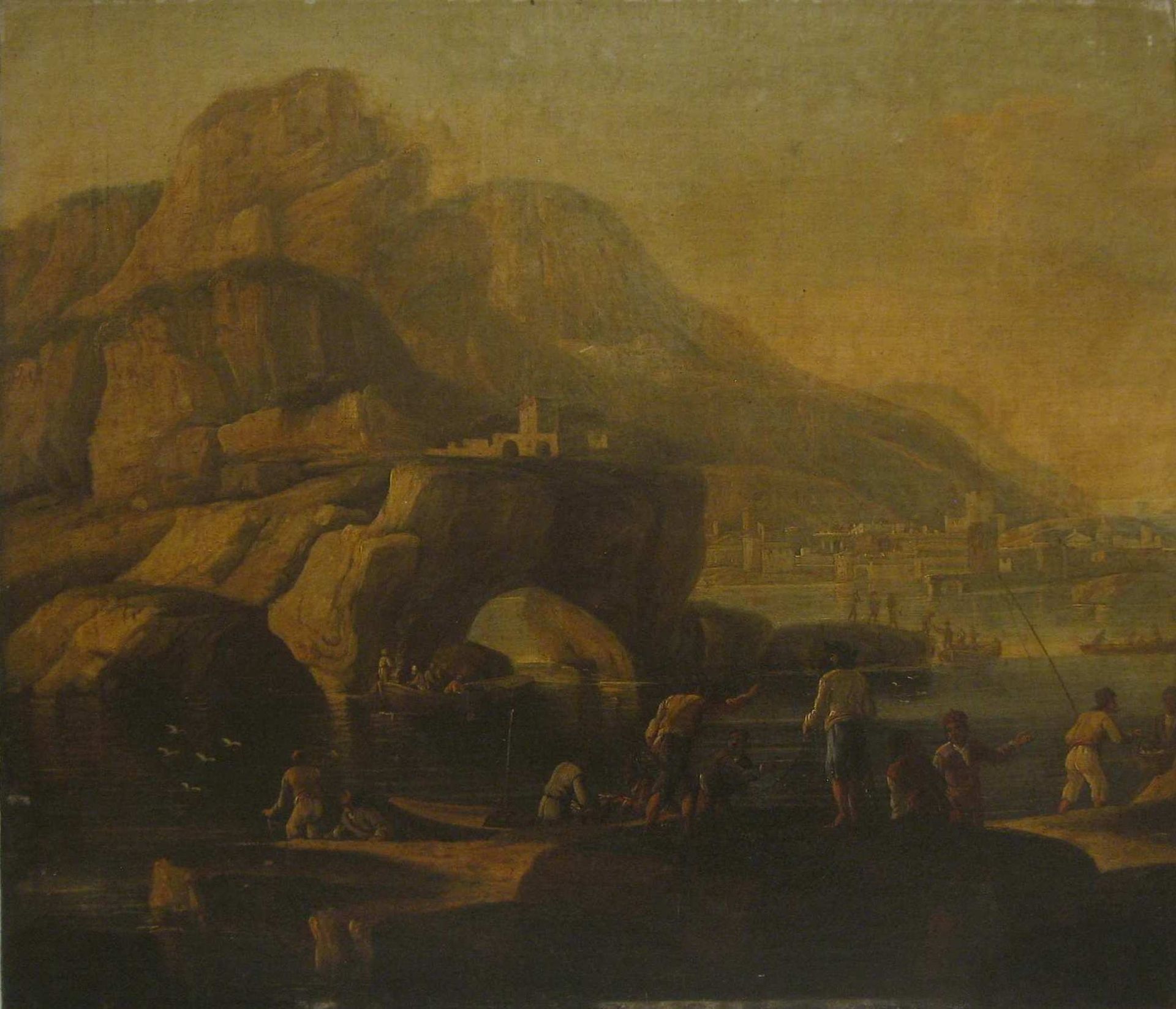 Johannes Lingelbach (1622-1674) zugeschr., um 1650 “Hafenszene”. Öl auf Leinwand. Zustand vor der Restaurierung (Firnis stark nachgedunkelt, mehrere Übermalungen und Retuschen, Malschicht im Himmelbereich stark berieben, Malschichtausbrüche).