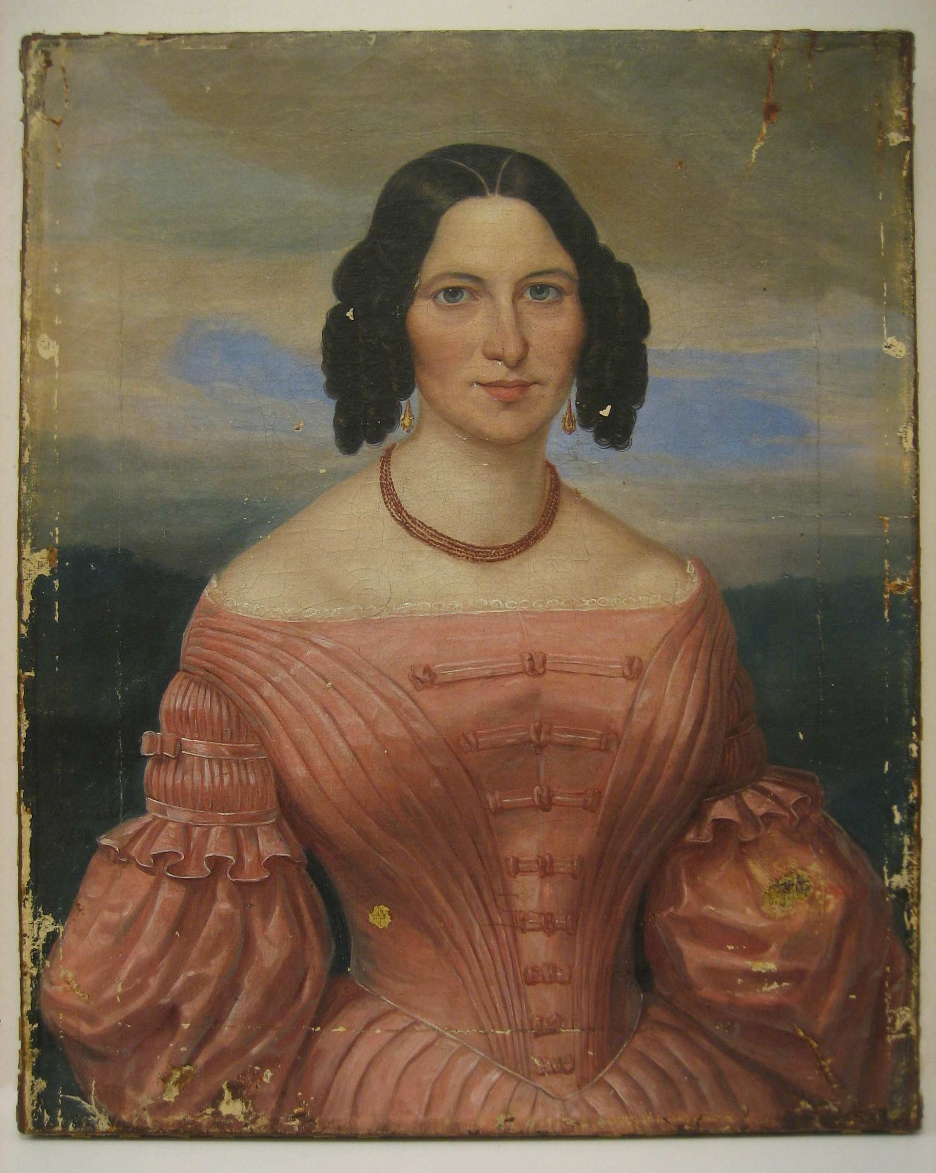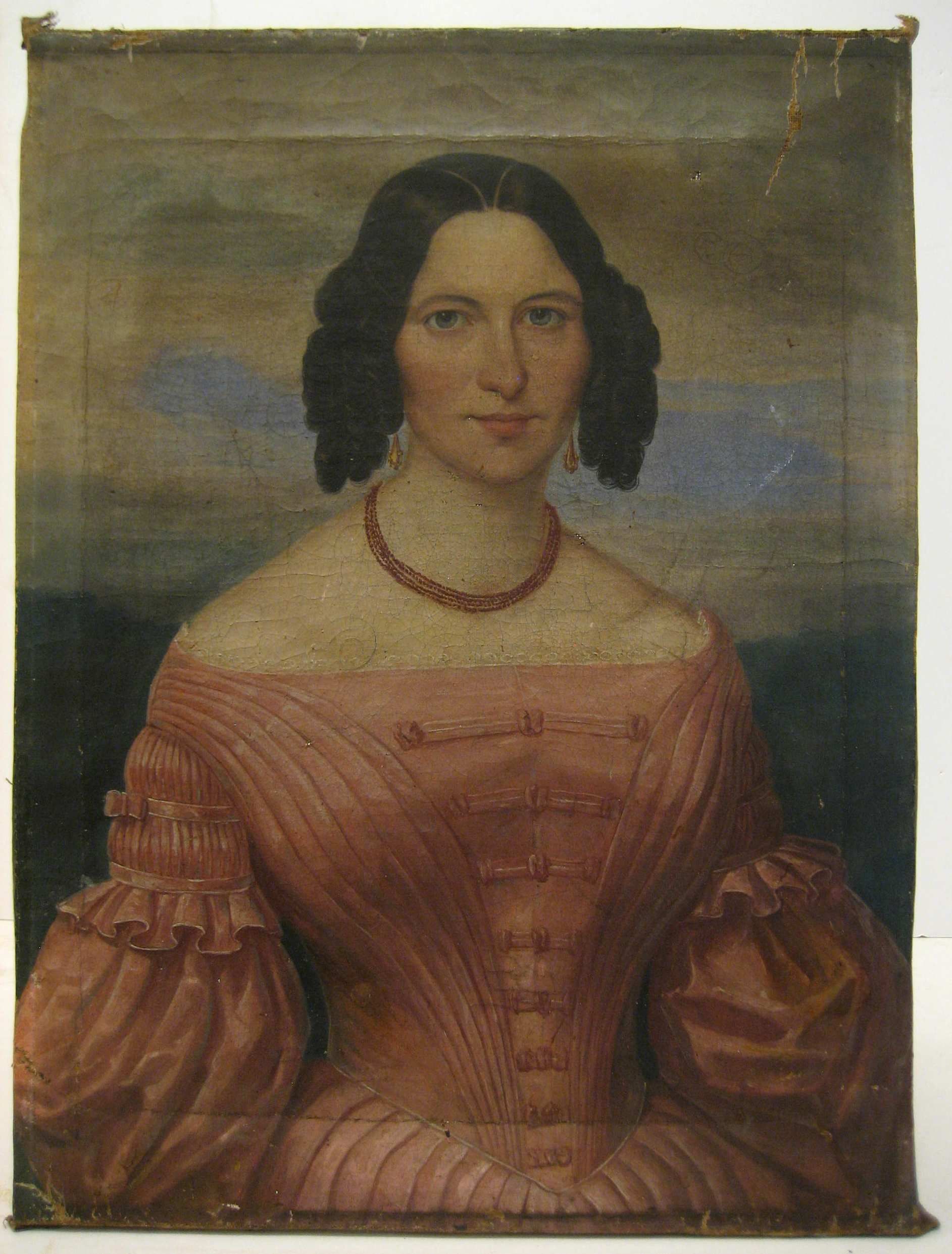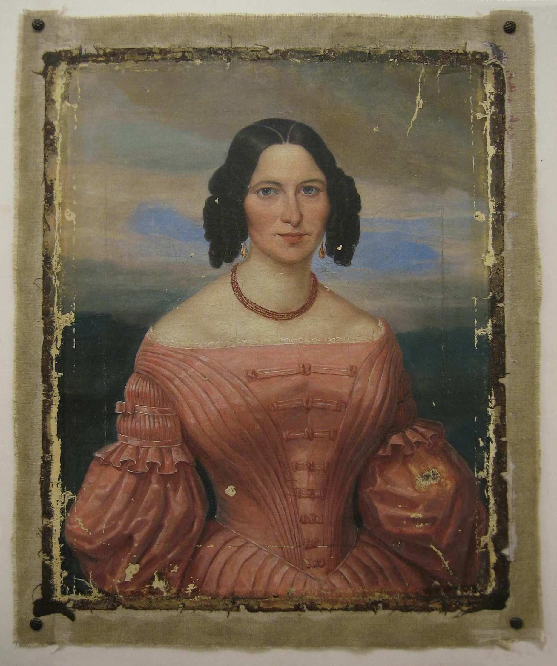 Matthias Rademacher (1804-1890), 1838 "Bildnis einer Adeligen". Öl auf Leinwand. Zustand vor der Restaurierung (Bild in der Breite durch Abknicken verkleinert; Malschicht stark verschmutzt, mehrere Malschichtausbrüche, Übermalungen, Retuschen).