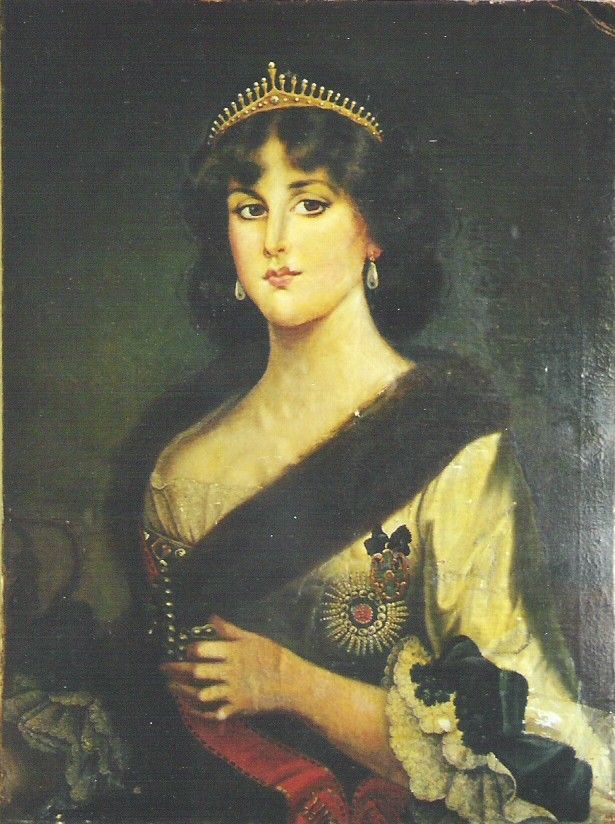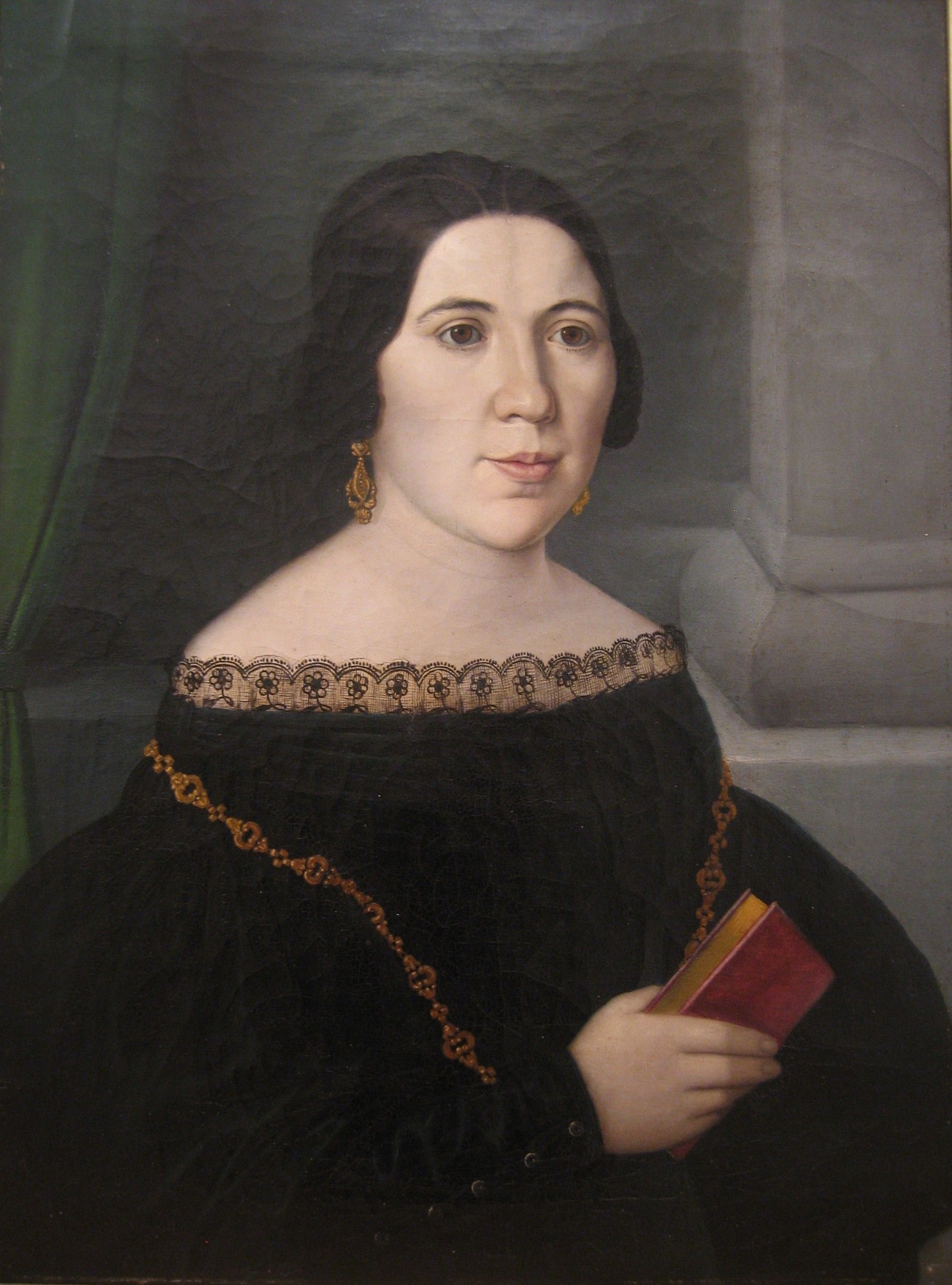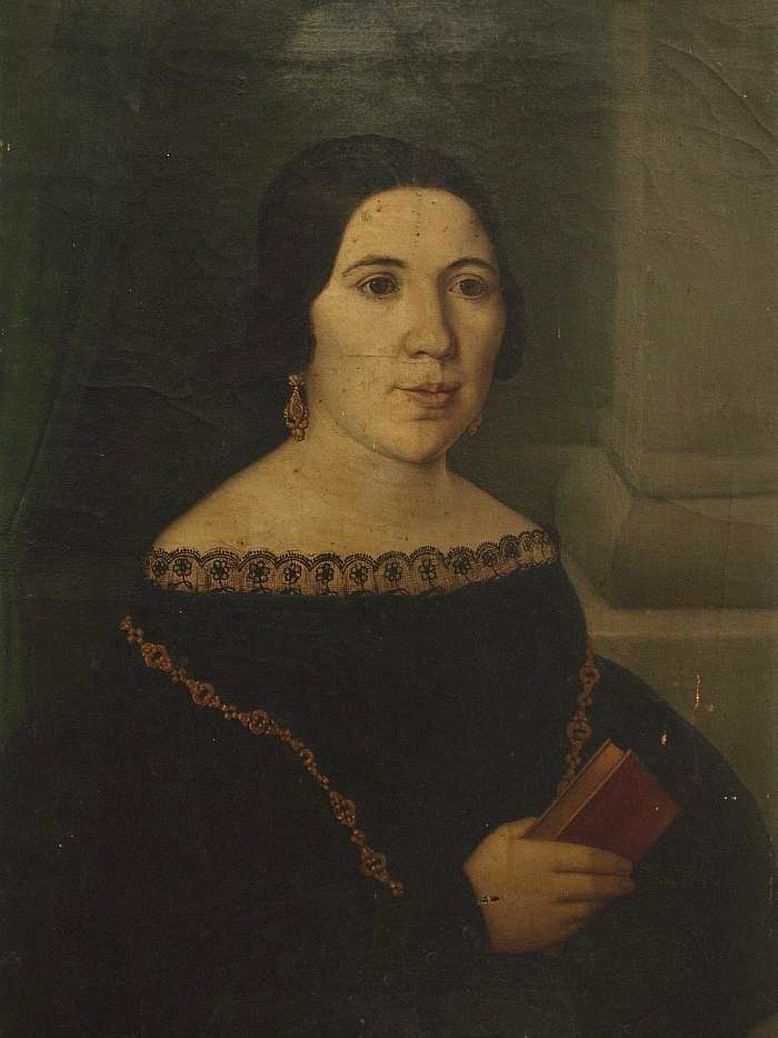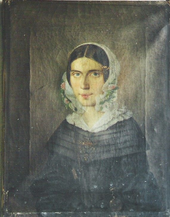 Matthias Rademacher (1804-1890), 1838 "Bildnis einer Adeligen". Öl auf Leinwand. Zustand vor der Restaurierung (Bild in der Breite durch Abknicken verkleinert; Malschicht stark verschmutzt, mehrere Malschichtausbrüche, Übermalungen, Retuschen).