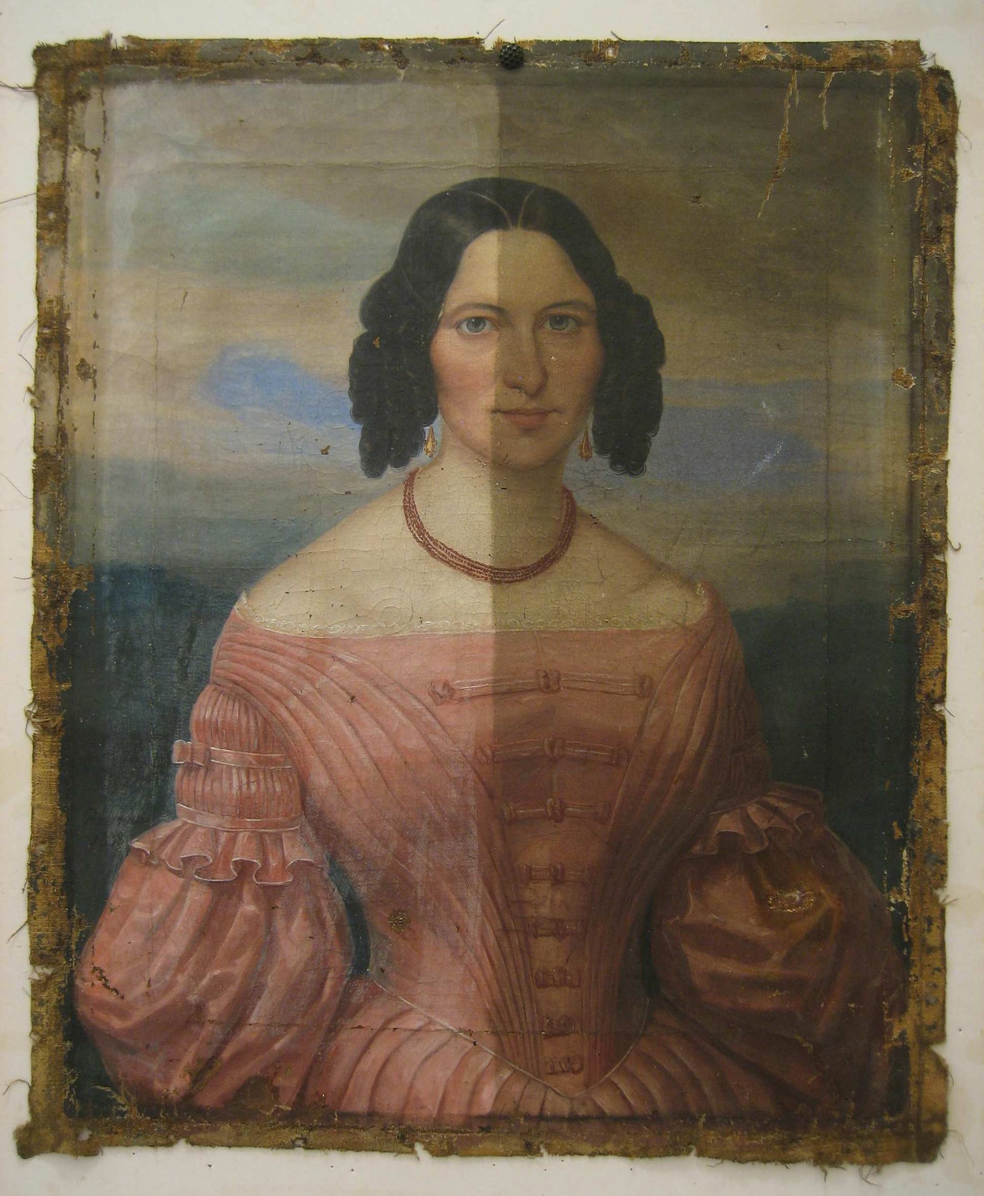 Matthias Rademacher (1804-1890), 1838 "Bildnis einer Adeligen". Öl auf Leinwand. Zustand während der Restaurierung (nach Reinigung, Festigung der Malschicht und Kittung; Spannränder doubliert).