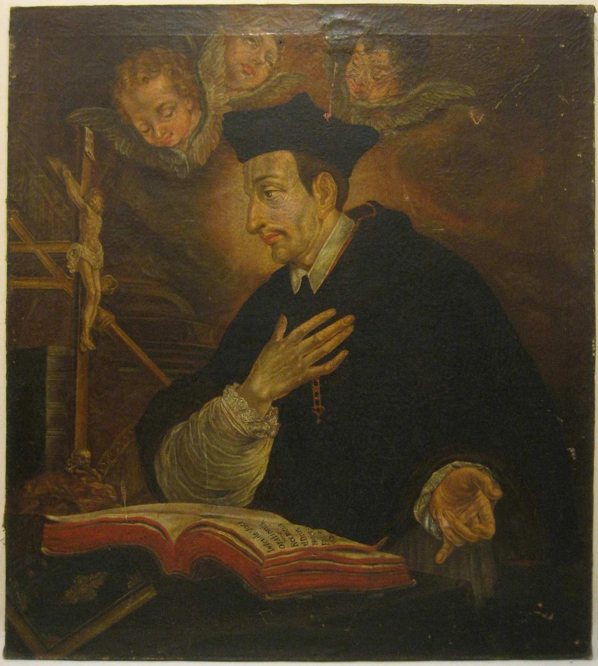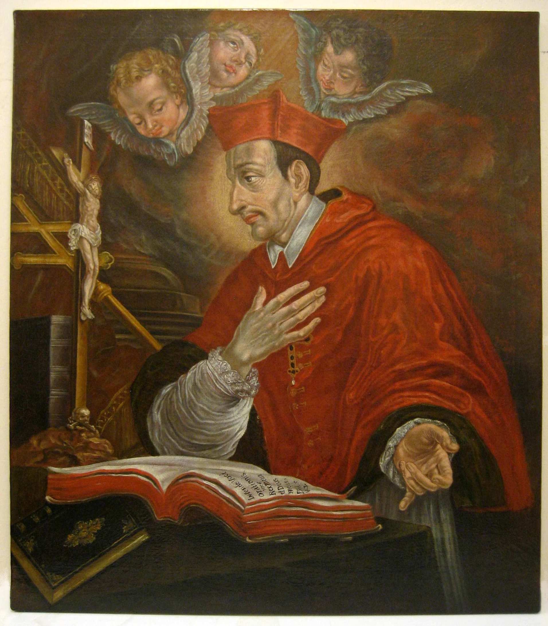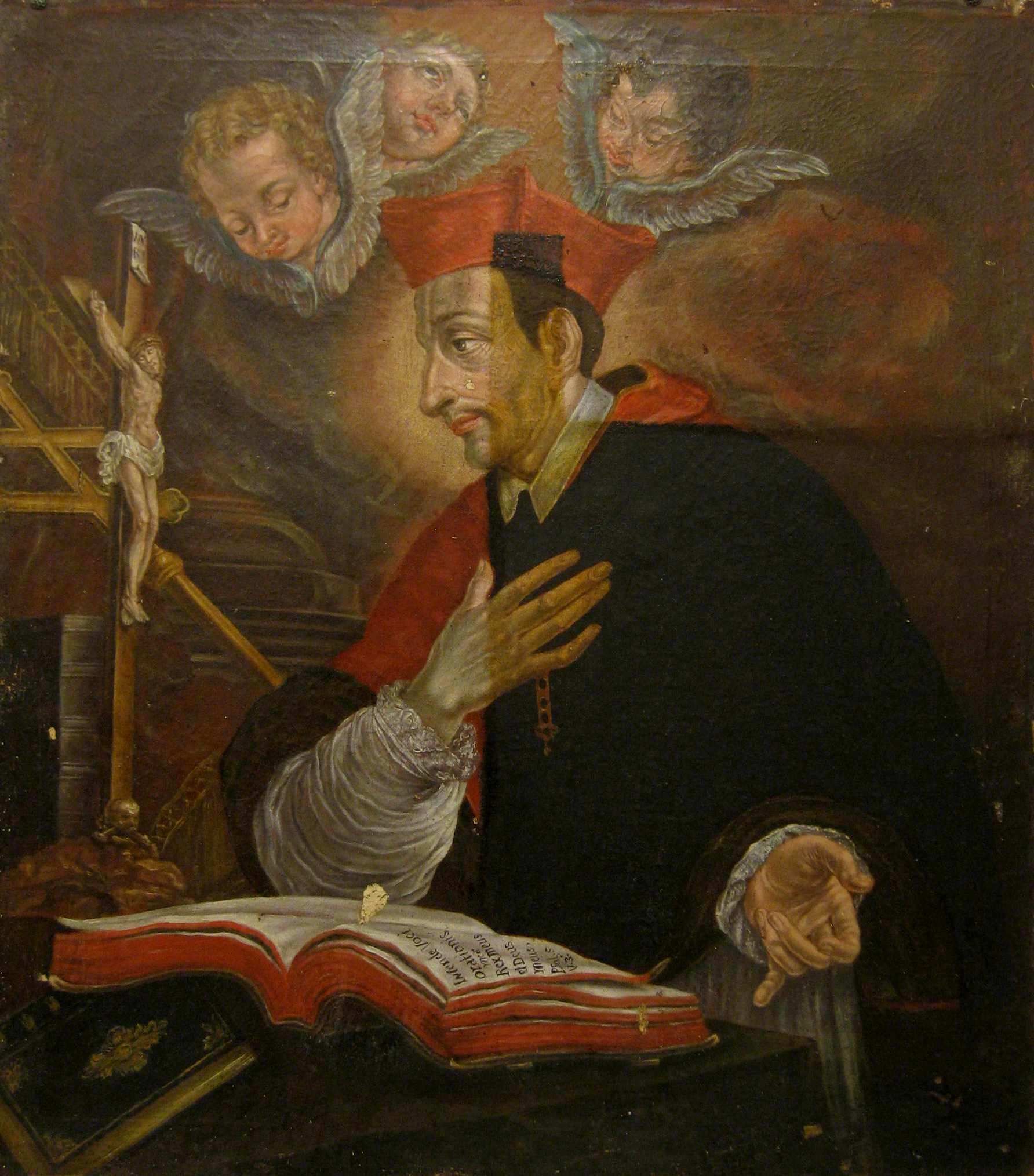 Süddeutscher Maler, 18. Jh. “Hl. Karl Borromäus”. Öl auf Leinwand. Zustand nach der Restaurierung (nach Retuschen und Aufspannen des Gemäldes auf einen neuen Keilrahmen).