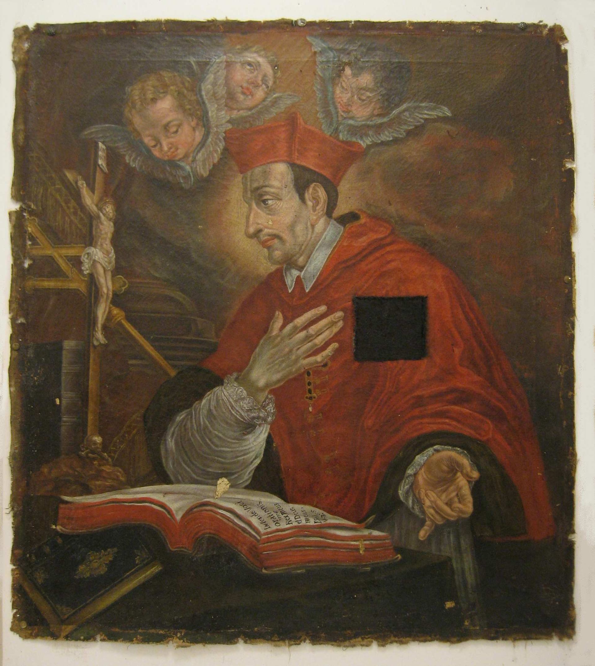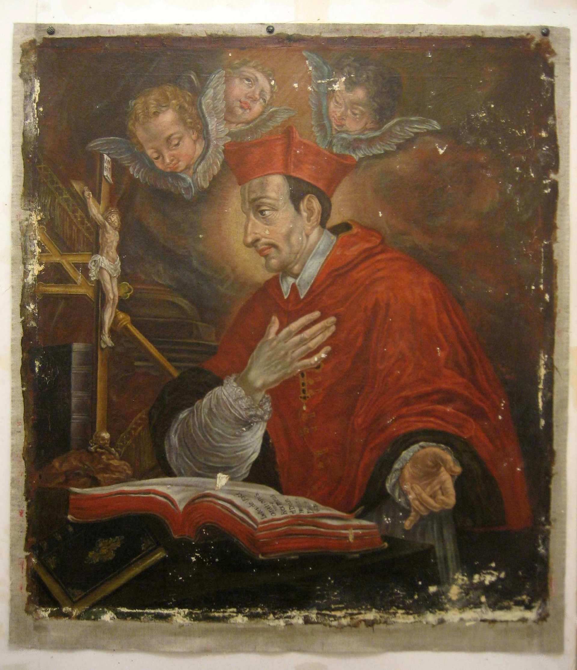 Süddeutscher Maler, 18. Jh. “Hl. Karl Borromäus”. Öl auf Leinwand. Zustand während der Restaurierung (Reinigung abgeschlossen, Malschicht gefestigt; Leinwand planiert, Spannränder doubliert und teilweise ergänzt; Ausbruchstellen gekittet).