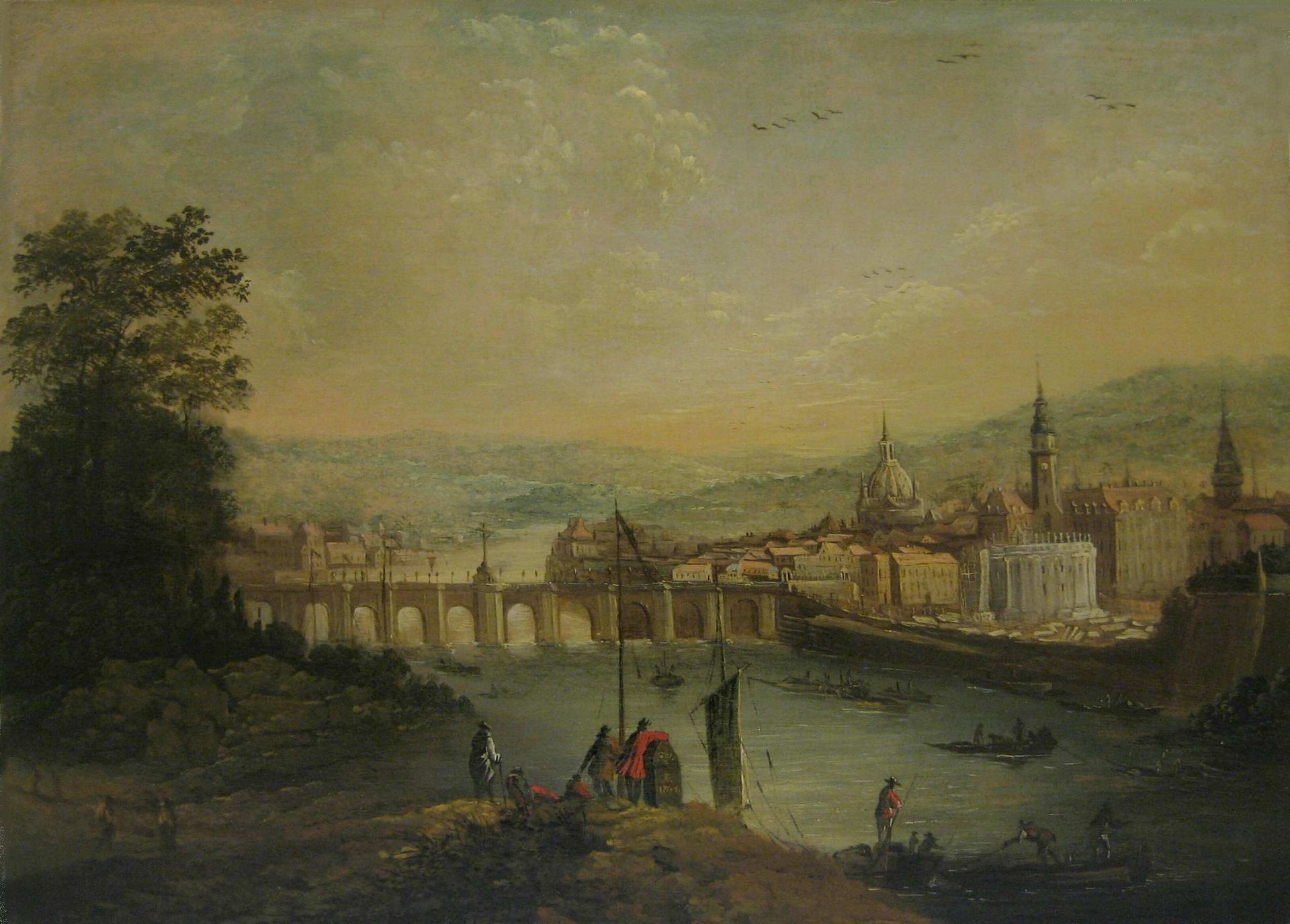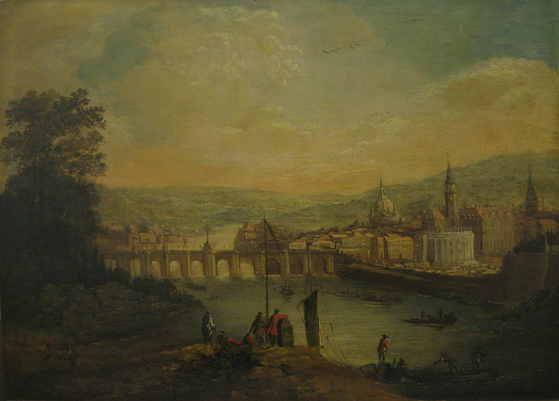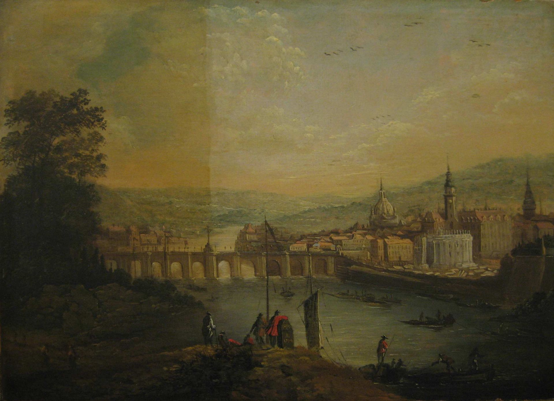 Johann Alexander Thiele (1685-1752), 1744 "Elbblick auf Dresden". Zustand vor der Restaurierung (Bildoberfläche verschmutzt, Firnis vergilbt; einzelne Übermalungen im Himmelbereich).