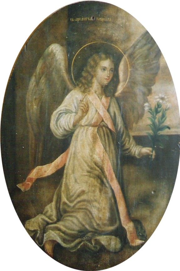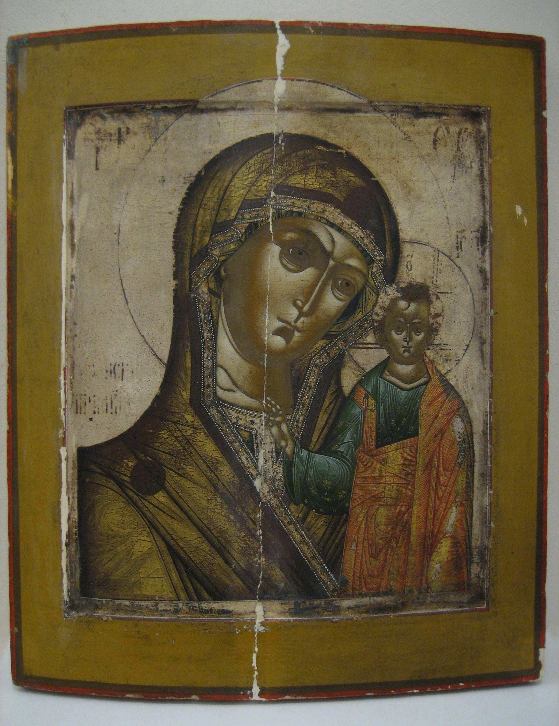 Russischer Ikonenmaler, 19. Jh. "Gottesmutter Kazanskaja". Eitempera auf Holz. Zustand vor der Restaurierung (Holztafel in zwei Teile gebrochen; Malschichtablösungen entlang der Risskanten und des linken Kovceg-Randes; diverse Verschmutzungen).