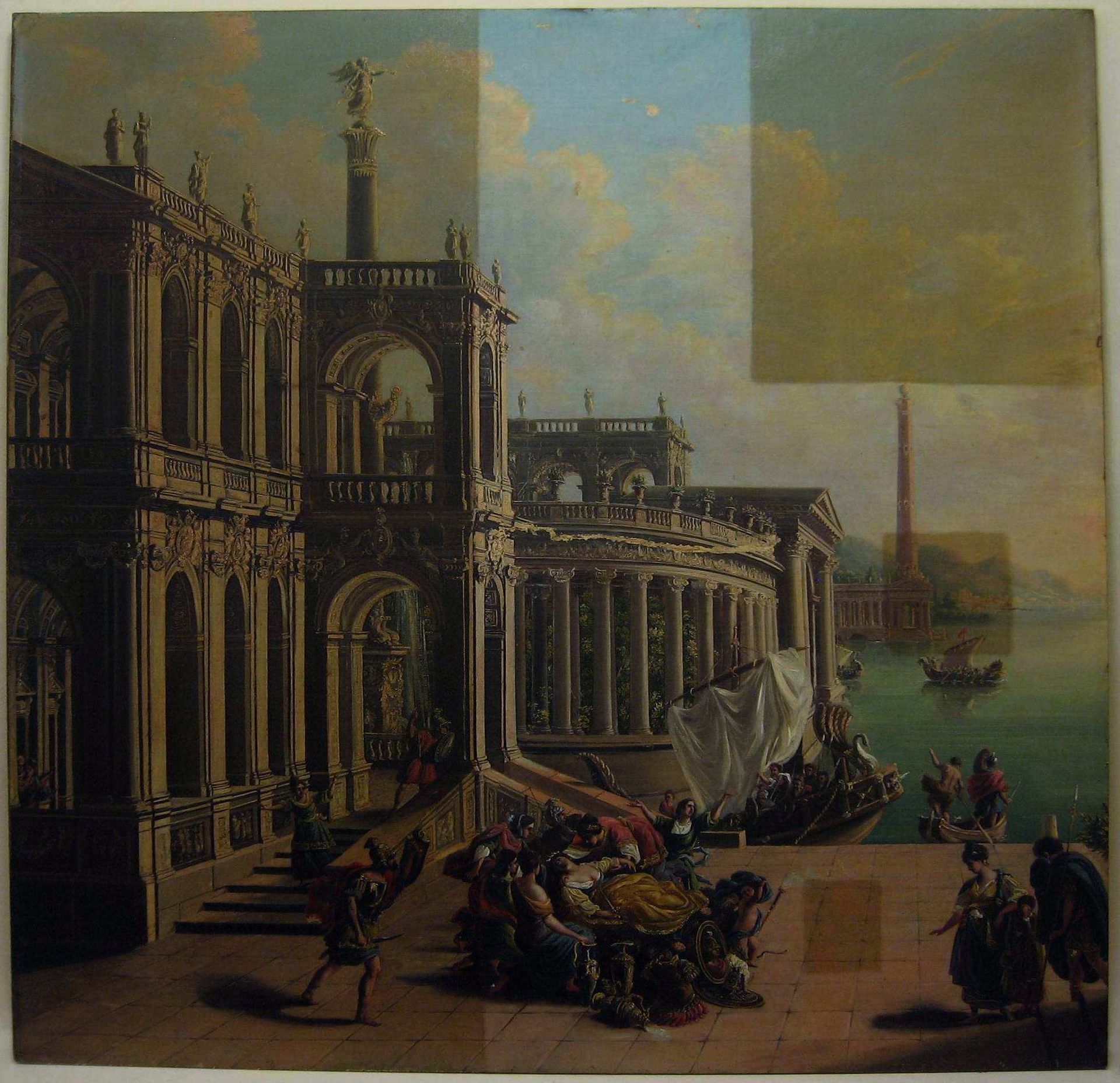 Johannes Lingelbach (1622-1674) zugeschr., um 1650 “Hafenszene”. Öl auf Leinwand. Zustand während der Restaurierung (nach Teilreinigung).
