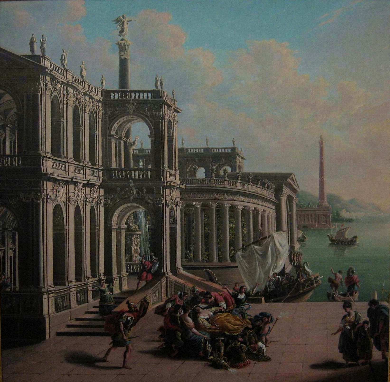 Italienischer Maler, 16. Jh. "Rebekka am Brunnen". Öl auf Leinwand. Zustand vor der Restaurierung (Leinwand deformiert und mehrfach beschädigt, mittig ein langer altrestaurierter Leinwandriss; starke Verschmutzungen und diverse alte Übermalungen).