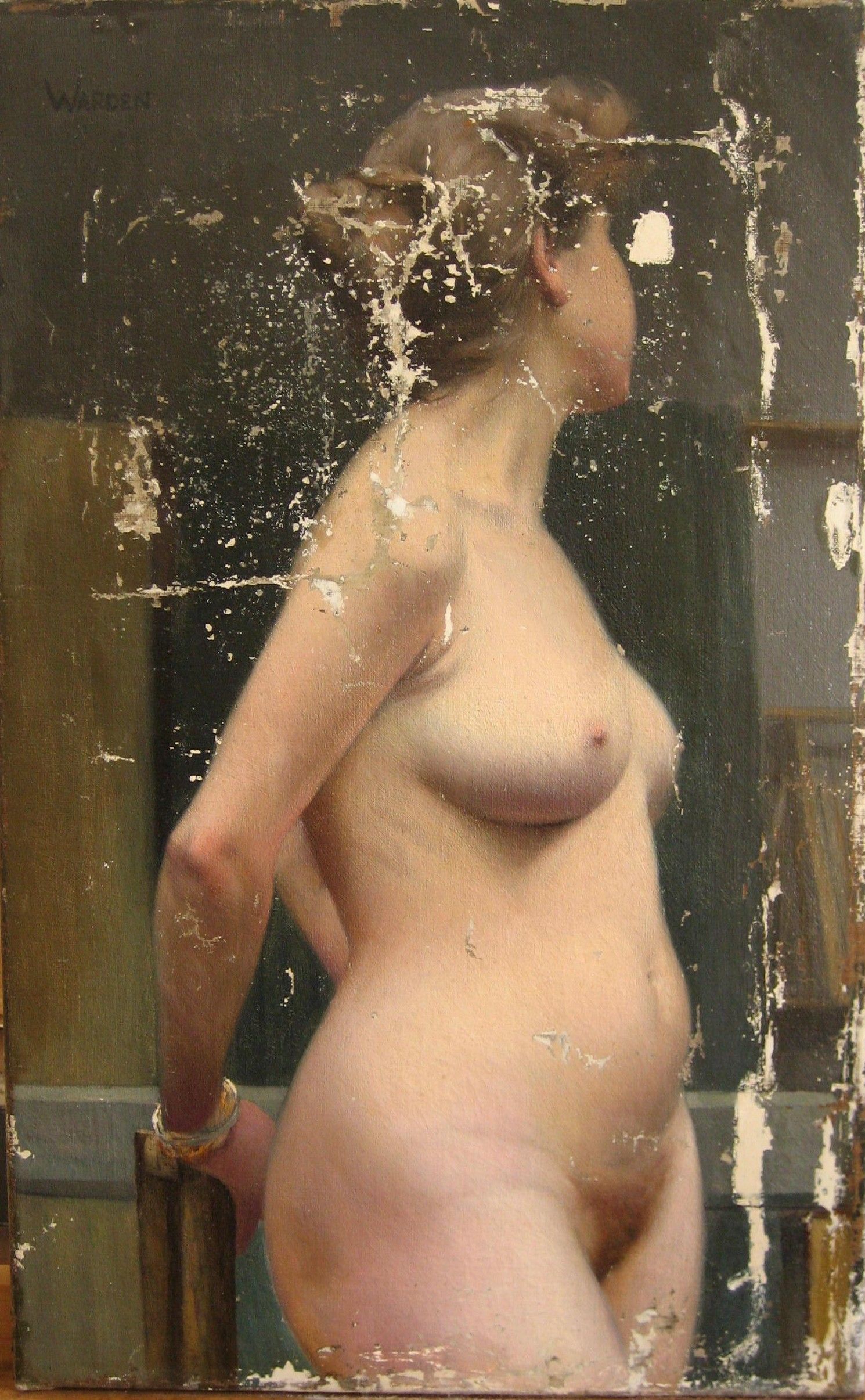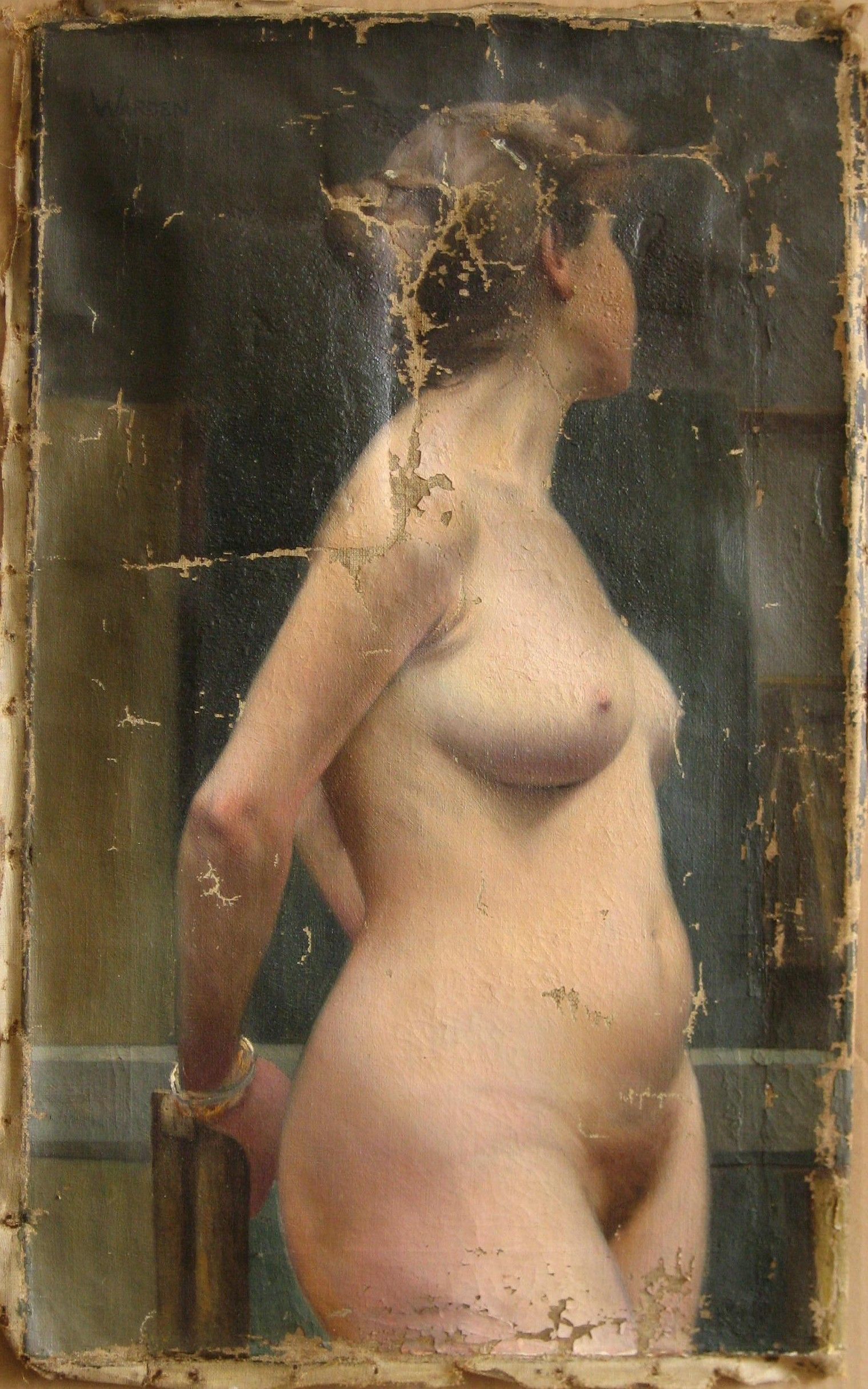 Russischer Maler, um 1860-80 "Stehender weiblicher Akt". Öl auf Leinwand. Zustand während der Restaurierung (Leinwand planiert, Spannränder doubliert, Leinwandrisse geschlossen; Malschicht konsolidiert, gereinigt und gekittet; neuer Keilrahmen).