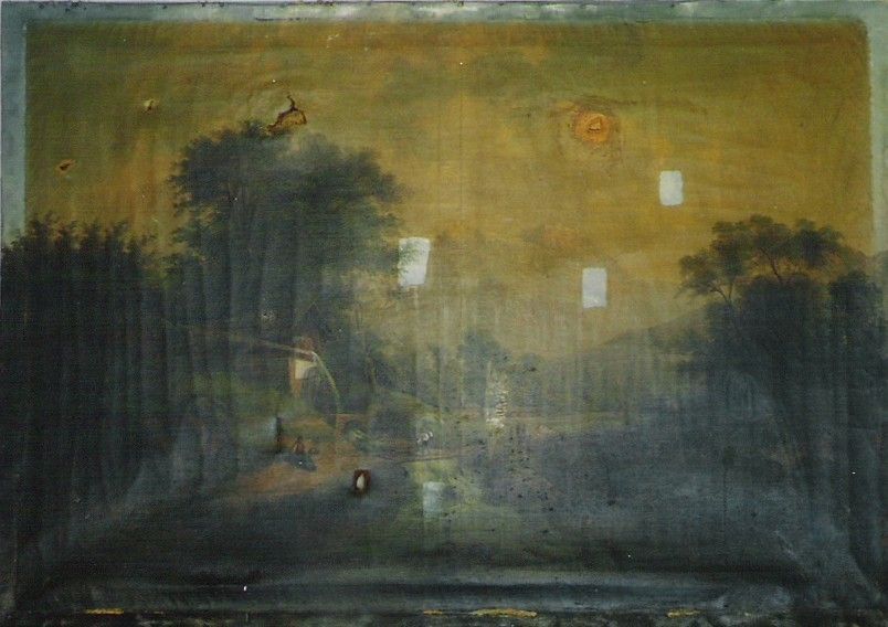 Ludwig Sckell (1833-1912) "Landschaft mit Schäfer und Schafherde". Öl auf Leinwand. Zustand vor der Restaurierung (Brandschaden - starke Malschichtverluste, besonders im unteren Bildbereich).