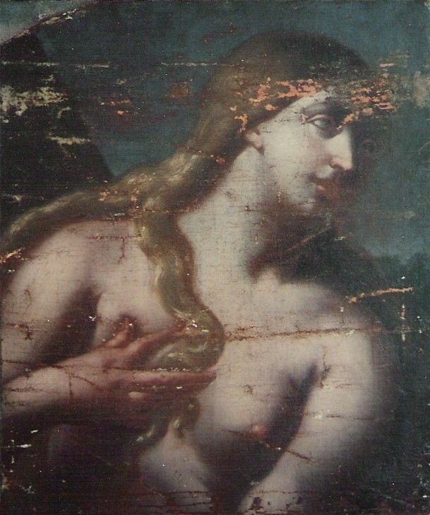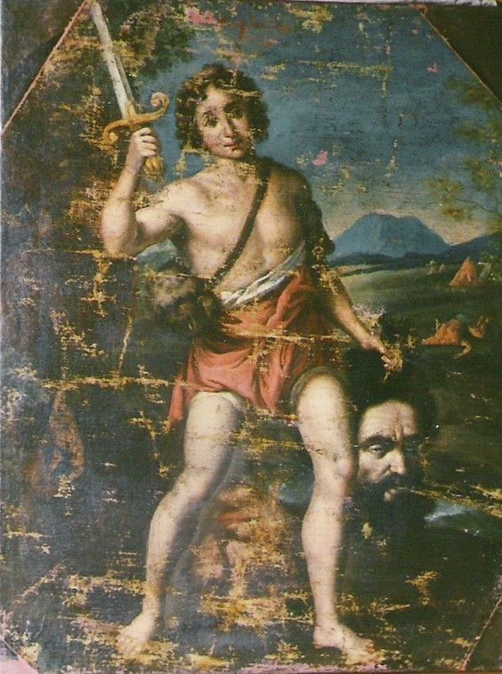 Flämischer Maler, 17. Jh. "David mit Kopf des Goliath". Öl auf Leinwand. Zustand während der Restaurierung (nach Entfernung aller Übermalungen, Ergänzung der Leinwand an allen vier Bildecken und nach Kittungen).