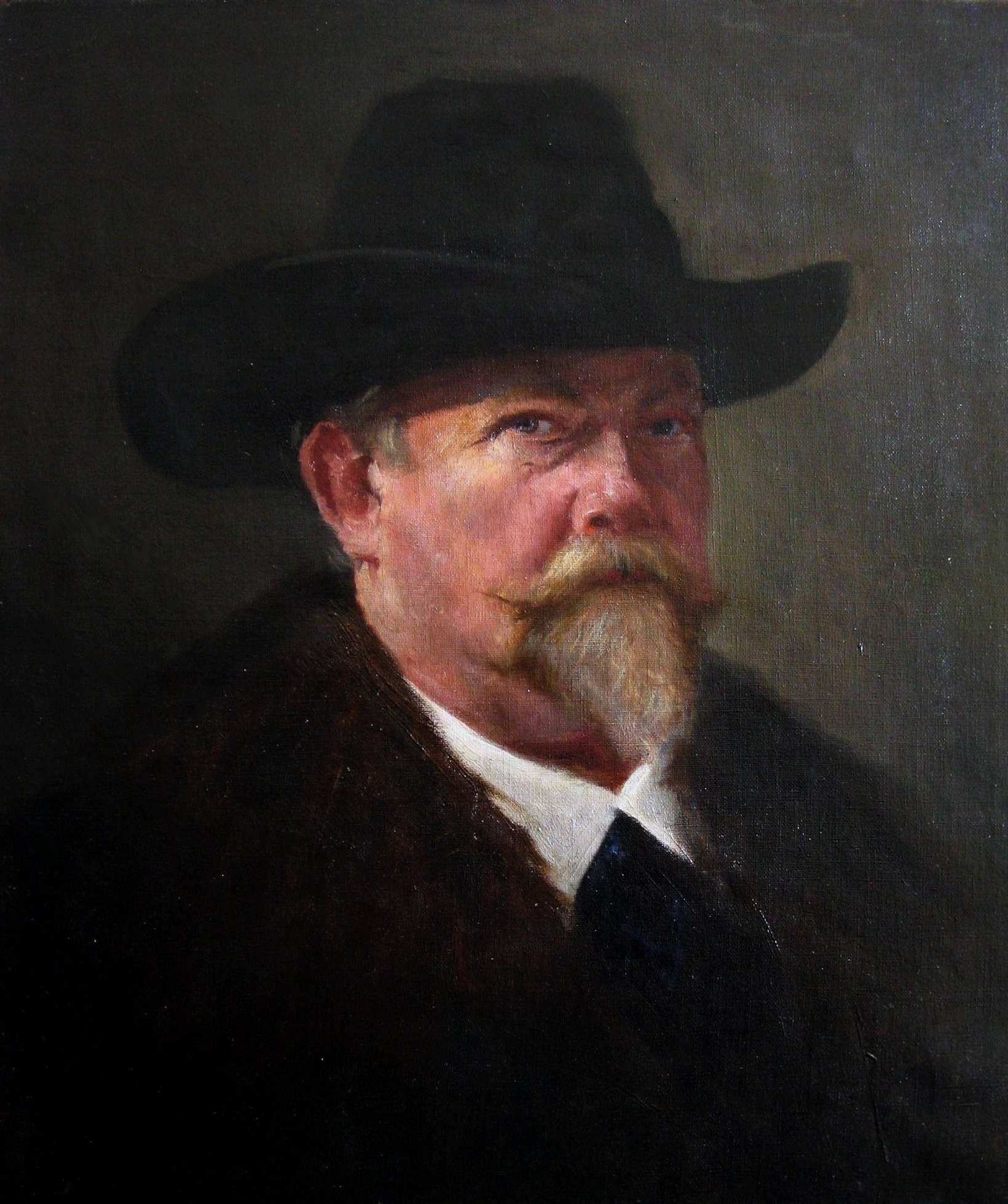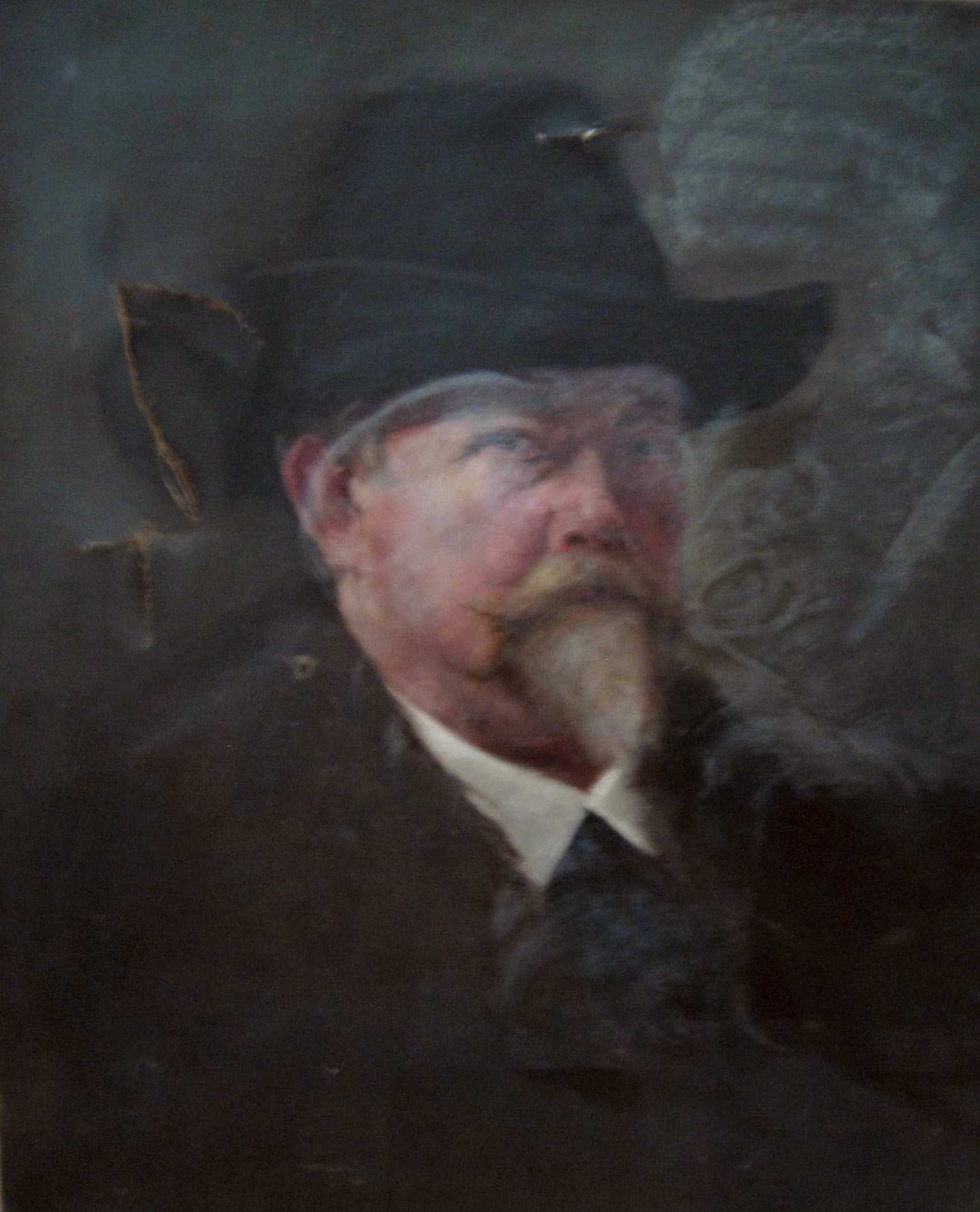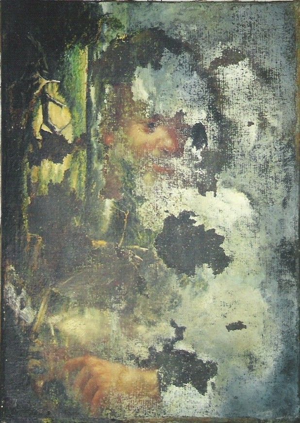 Curt Gitschmann (1876-1933), nach 1900 "Bildnis eines Herren mit Hut". Öl auf Leinwand. Zustand nach der Restaurierung (Bildoberfläche gereinigt; Leinwandrisse geschlossen, gekittet und retuschiert).
