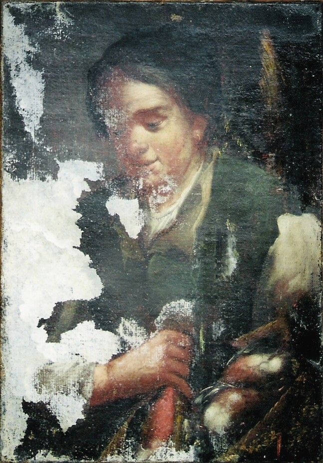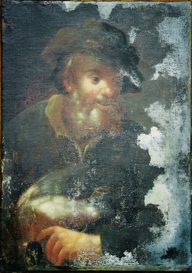 Johann Conrad Seekatz (1719-1768) zugeschr., um 1750 "Bauer mit Ente". Öl auf Leinwand. Zustand während der Restaurierung nach Teilentfernung der Übermalungen.