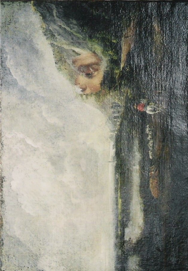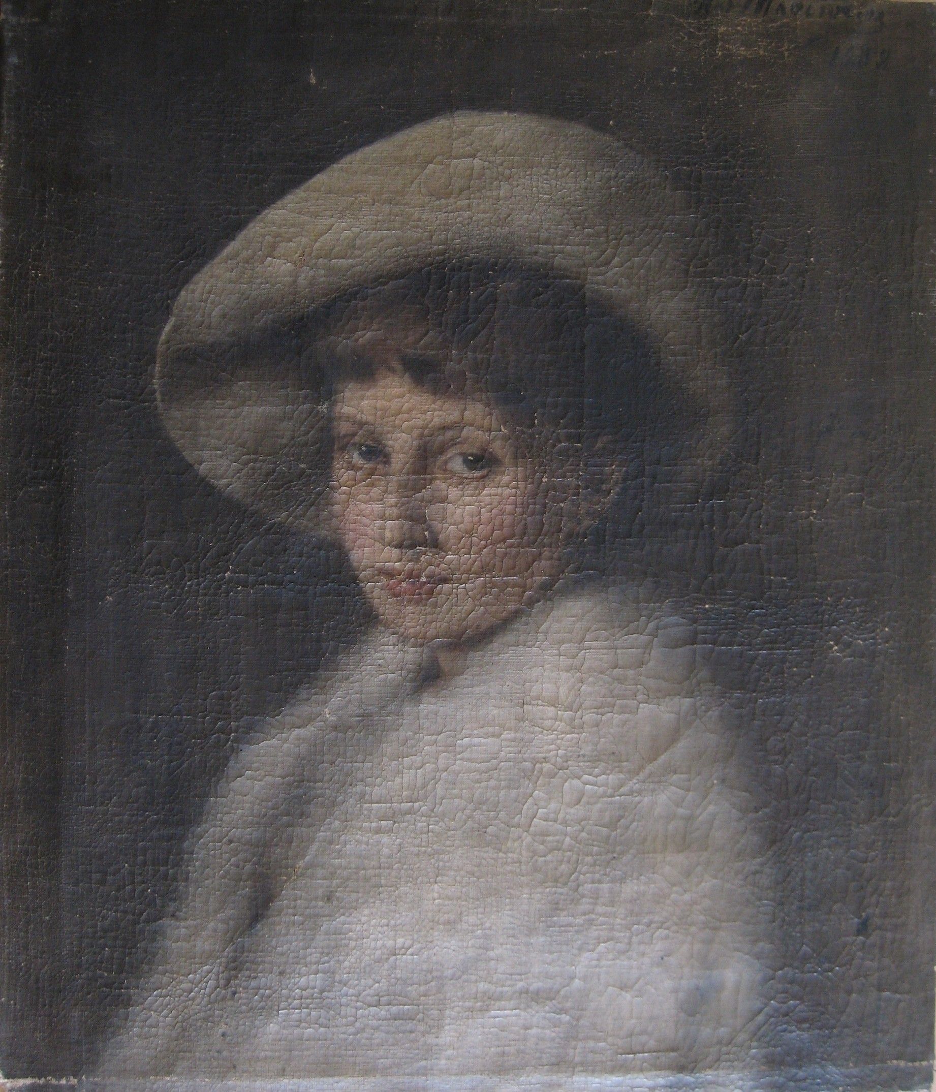 Carl Gussow (1843-1907), letztes Viertel des 19. Jh. "Bildnis eines Mädchens". Öl auf Holztafel. Zustand vor der Restaurierung (Malschichtoberfläche stark verschmutzt, einige Malschichtausbrüche).