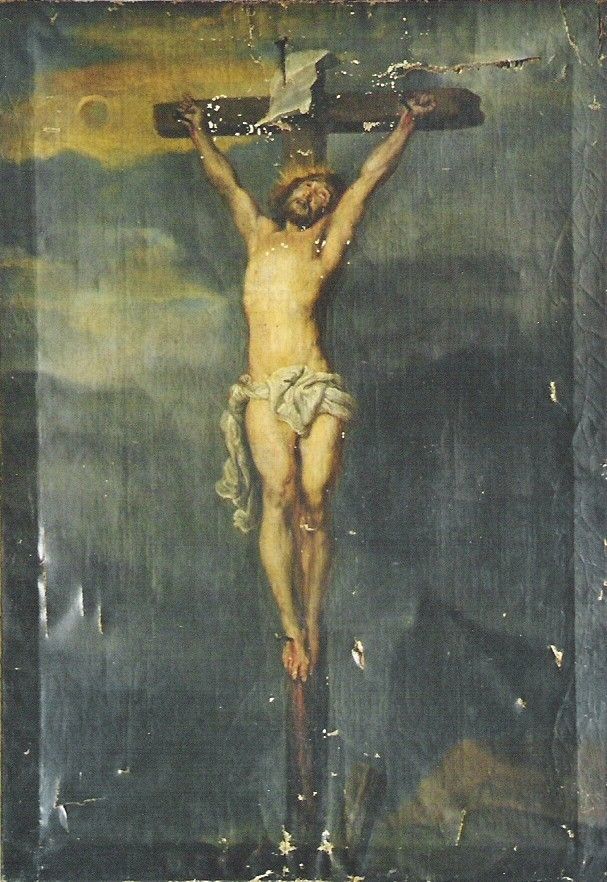 Anthonis van Dyck (1599-1641) Kopie nach, um 1850 "Gekreuzigter Christus". Öl auf Leinwand. Zustand vor der Restaurierung (Leinwanddeformationen, kleine Leinwandrisse, Abdruckstellen des Keilrahmens sichtbar; mehrere Malschichtverluste, Firnis stark vergilbt).