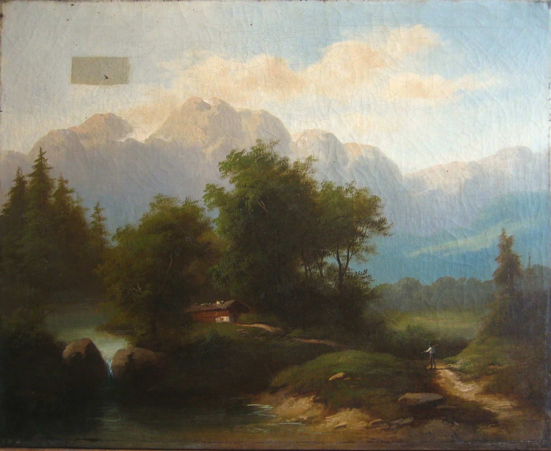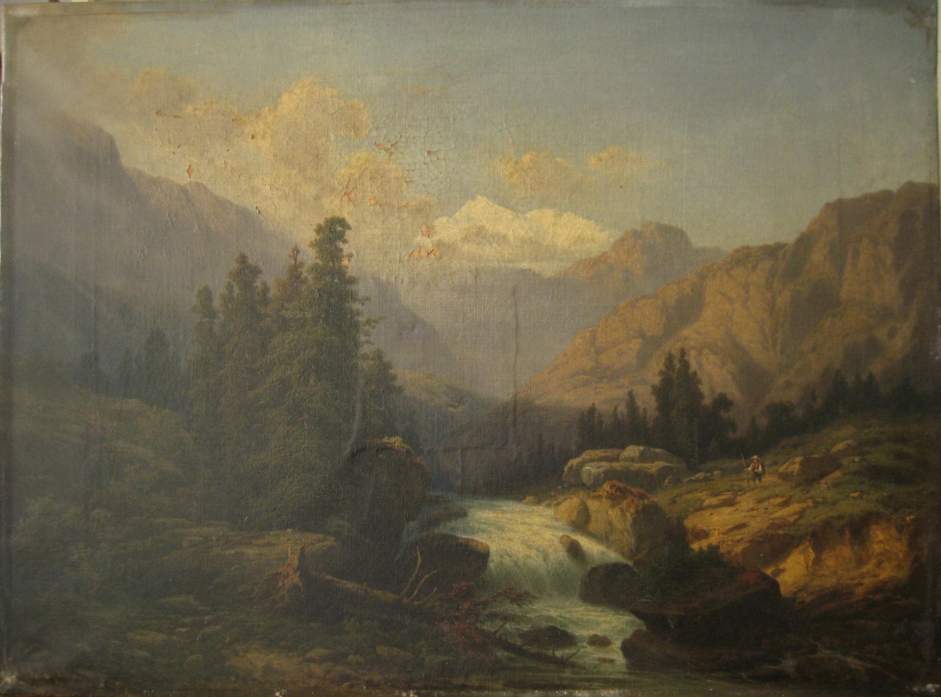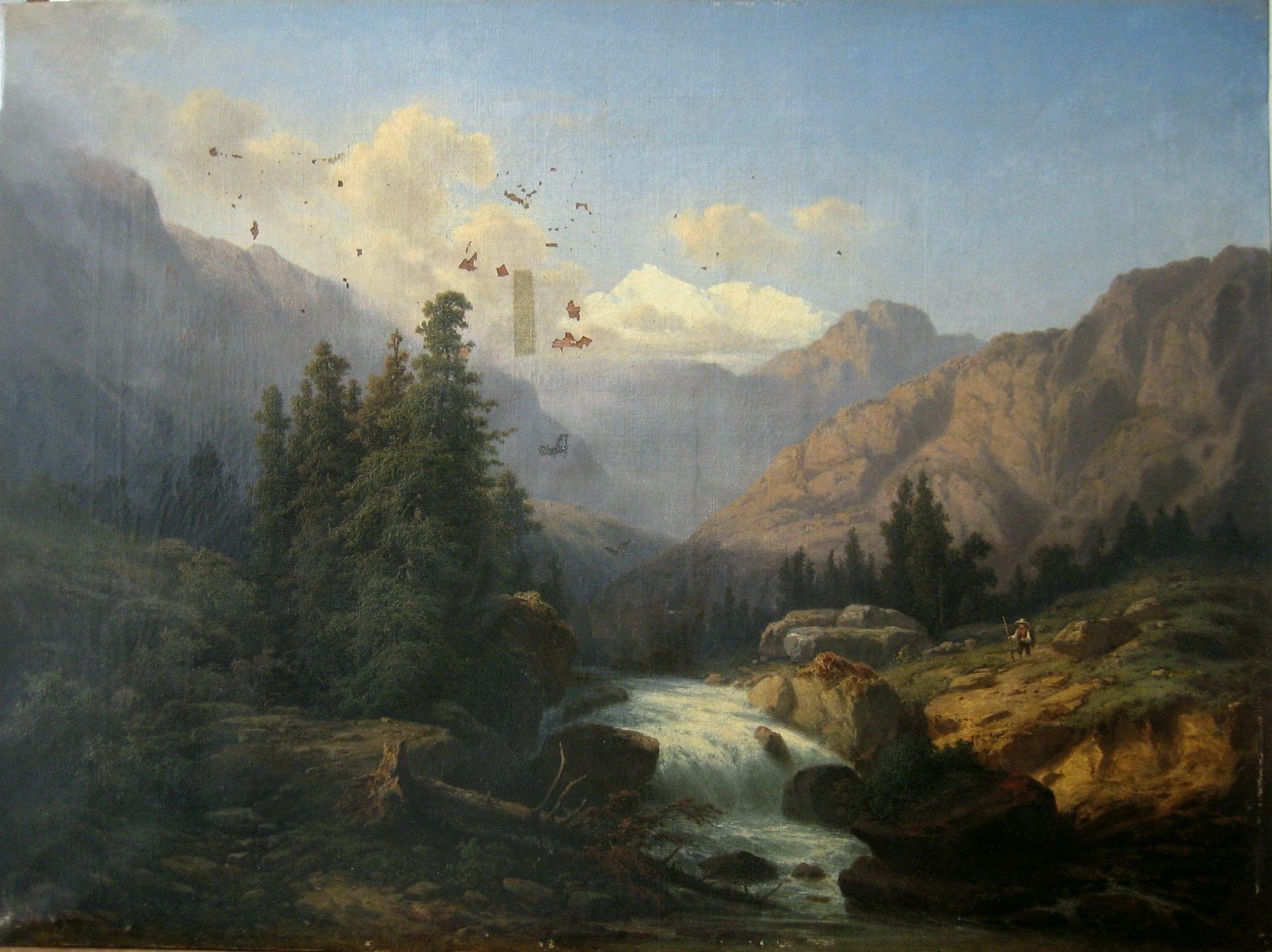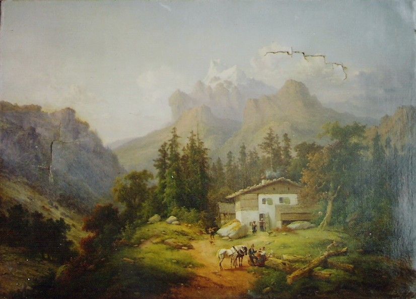 Franz Barbarini (1804-1873), um 1860 "Alpenlandschaft". Öl auf Leinwand. Zustand vor der Restaurierung (Leinwand mit zwei 12 cm bzw. 20 cm langen unregelmäßigen Leinwandrissen).