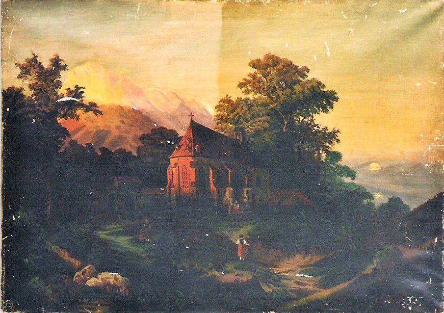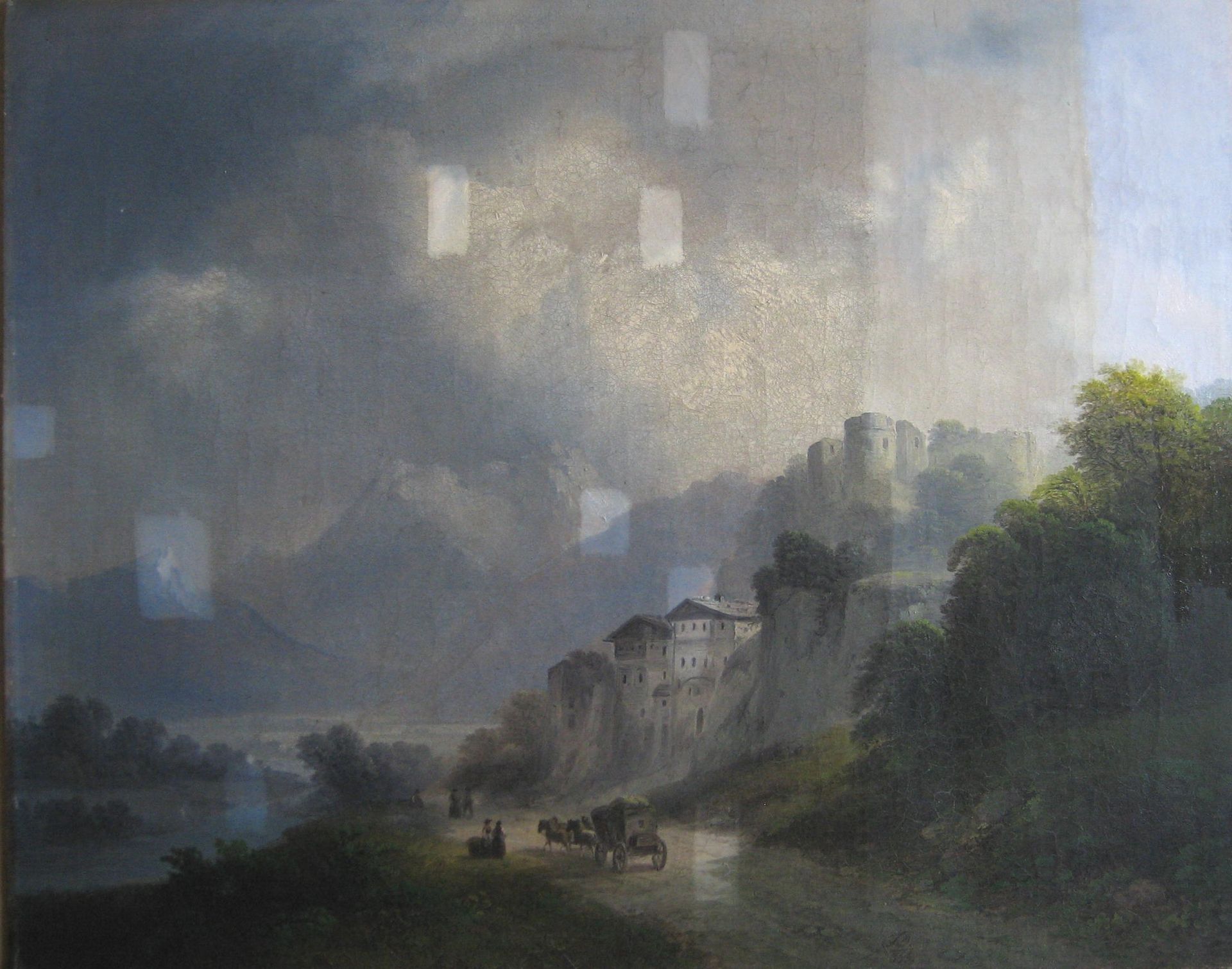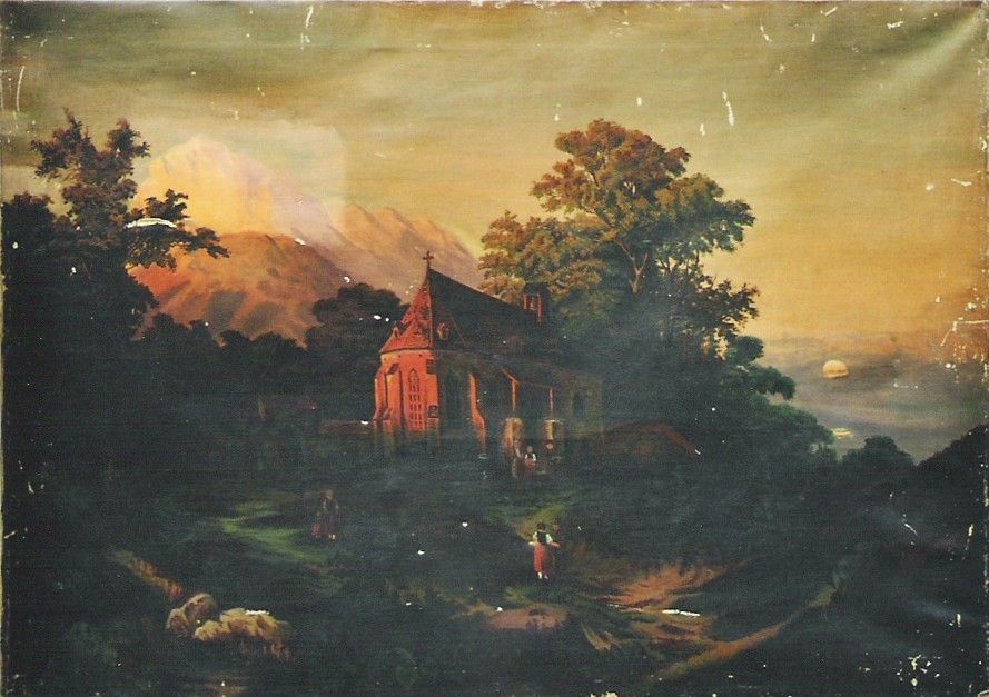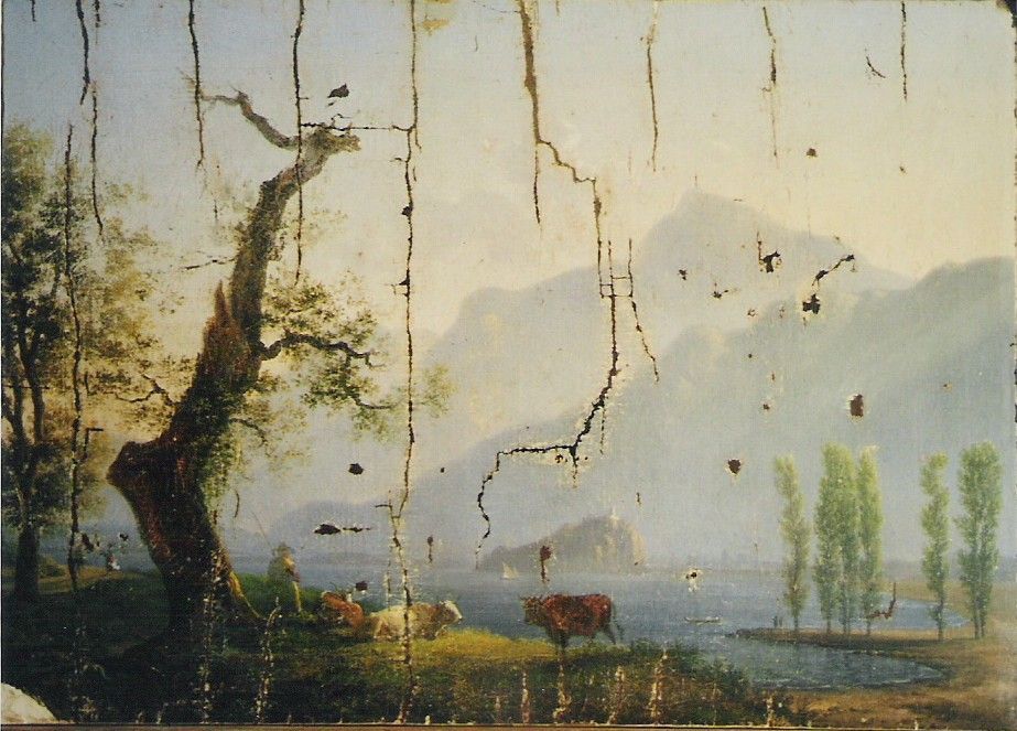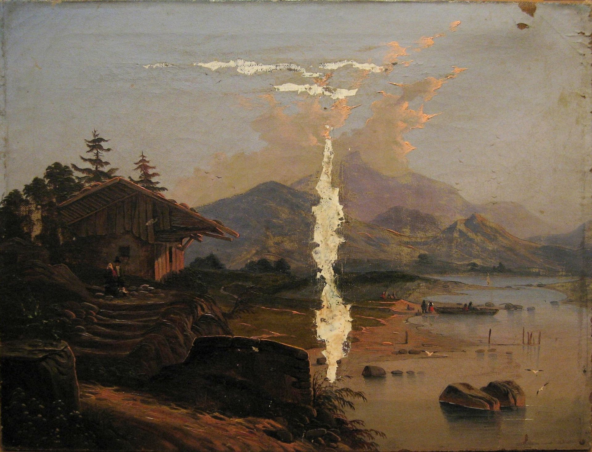 Franz Barbarini (1804-1873), um 1860 "Alpenlandschaft". Öl auf Leinwand. Zustand vor der Restaurierung (Leinwand mit zwei 12 cm bzw. 20 cm langen unregelmäßigen Leinwandrissen).
