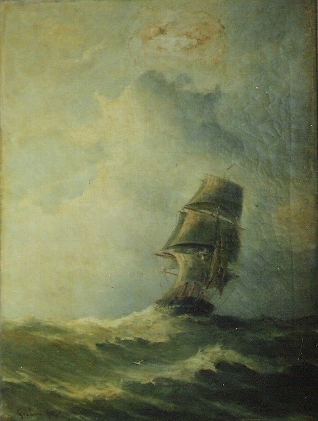 Gerard van der Laan (1844-1915), um 1900 "Zweimaster auf hoher See". Öl auf Leinwand. Zustand vor der Restaurierung (Firnis stark vergilbt; mittig oben ein alter, mit einem Leinwandflicken unterklebter und großflächig übermalter Leinwandriss).