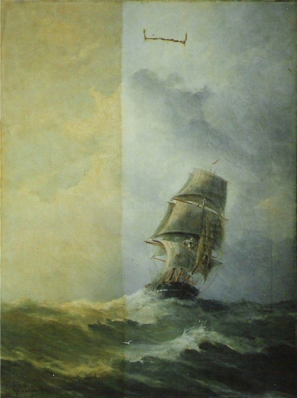 Gerard van der Laan (1844-1915), um 1900 "Zweimaster auf hoher See". Öl auf Leinwand. Zustand während der Restaurierung (nach Teilabnahme des Firnisses und nach Entfernung der Übermalung und alter Kittung).