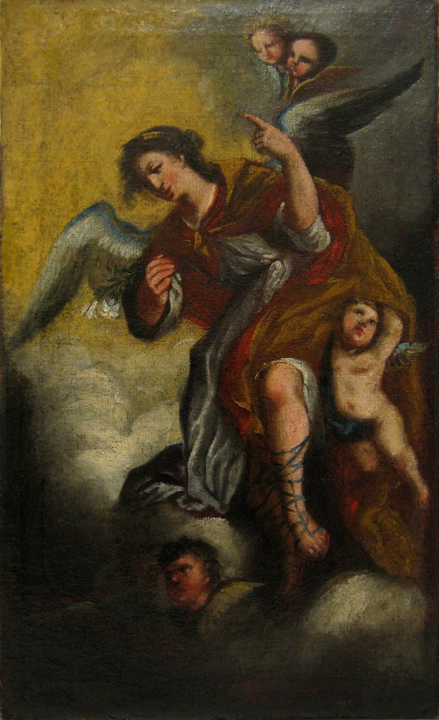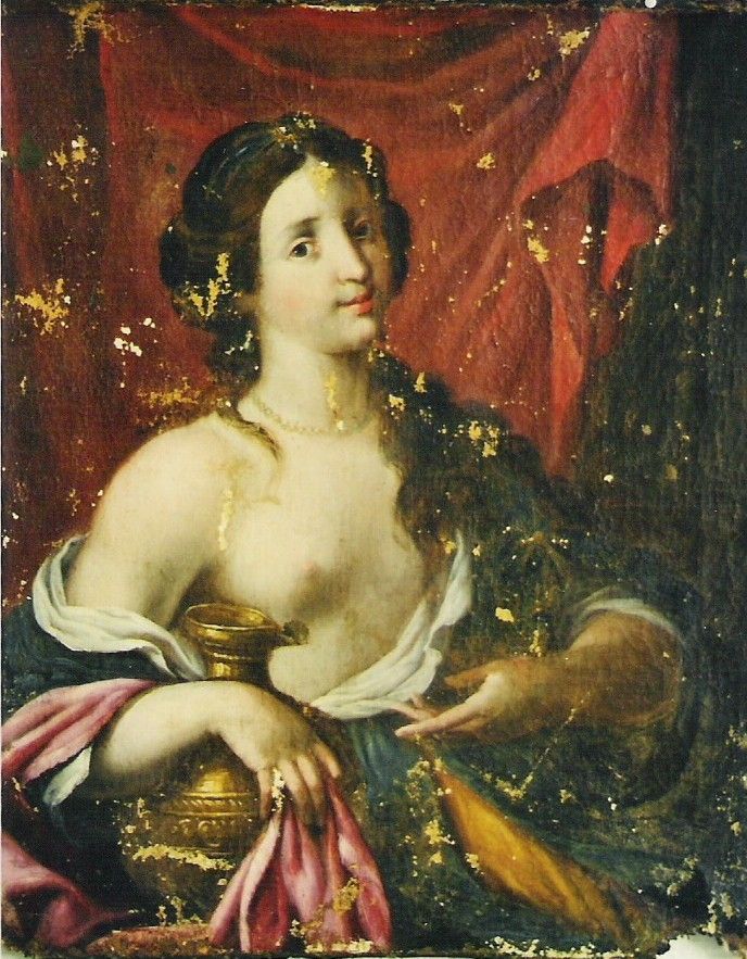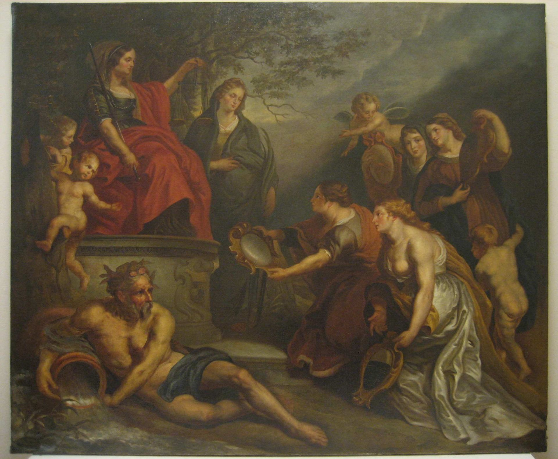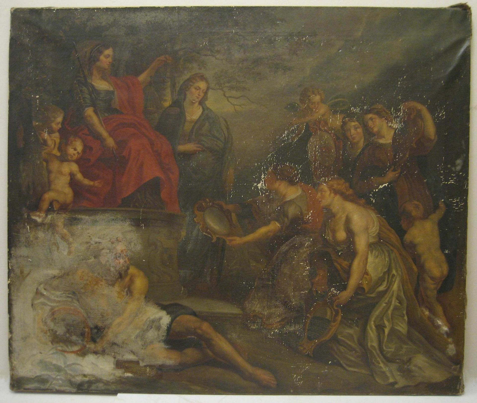 Akademischer Maler nach Rubens, Ende des 19. Jh. „Allegorie der Gerechtigkeit“, Öl auf Leinwand. Zustand vor der Restaurierung (Firnis vergilbt und z. T. milchig eingetrübt; Malschicht spröde, mit partiellen Malschichtverlusten; Leinwanddeformationen).