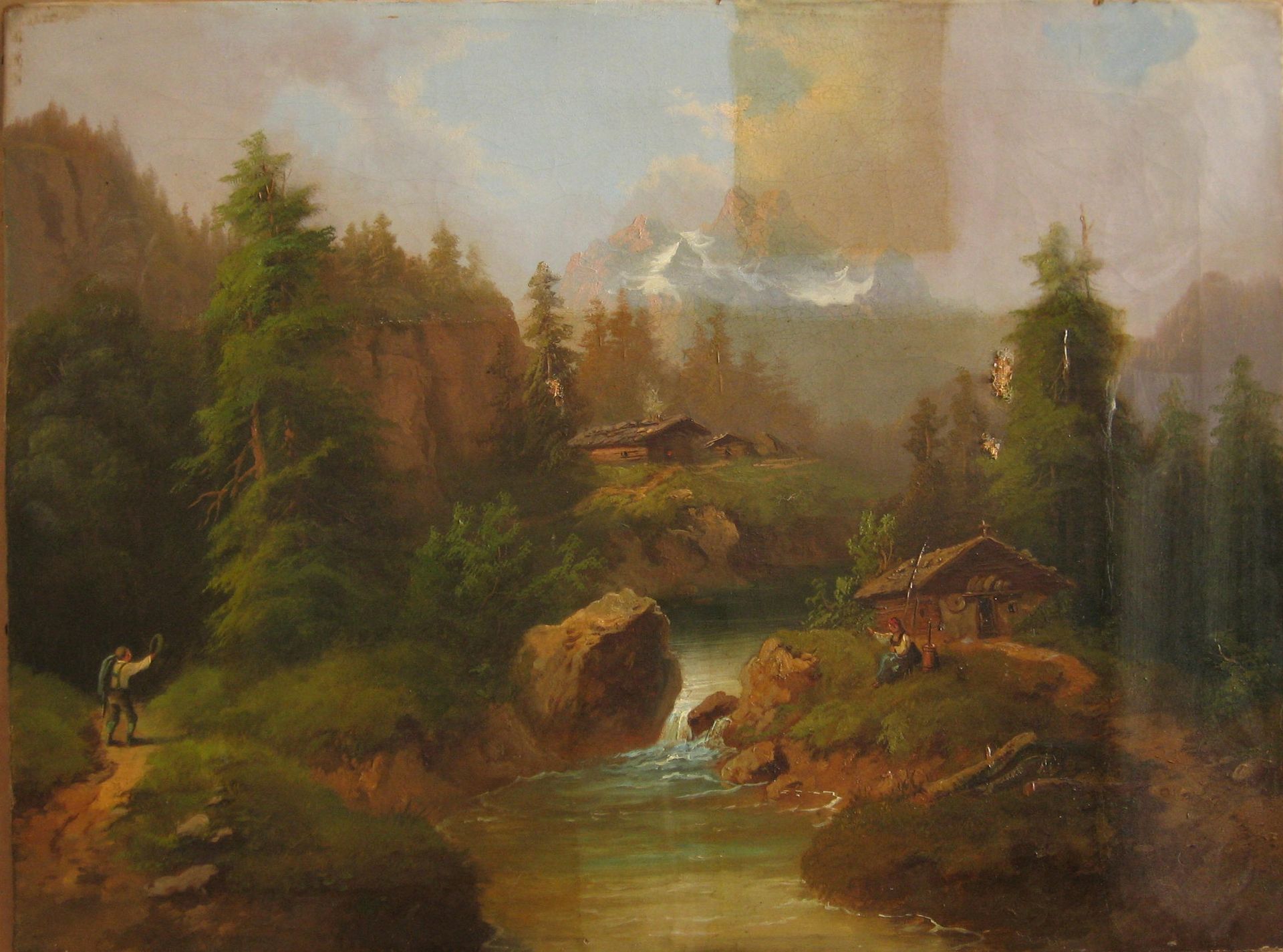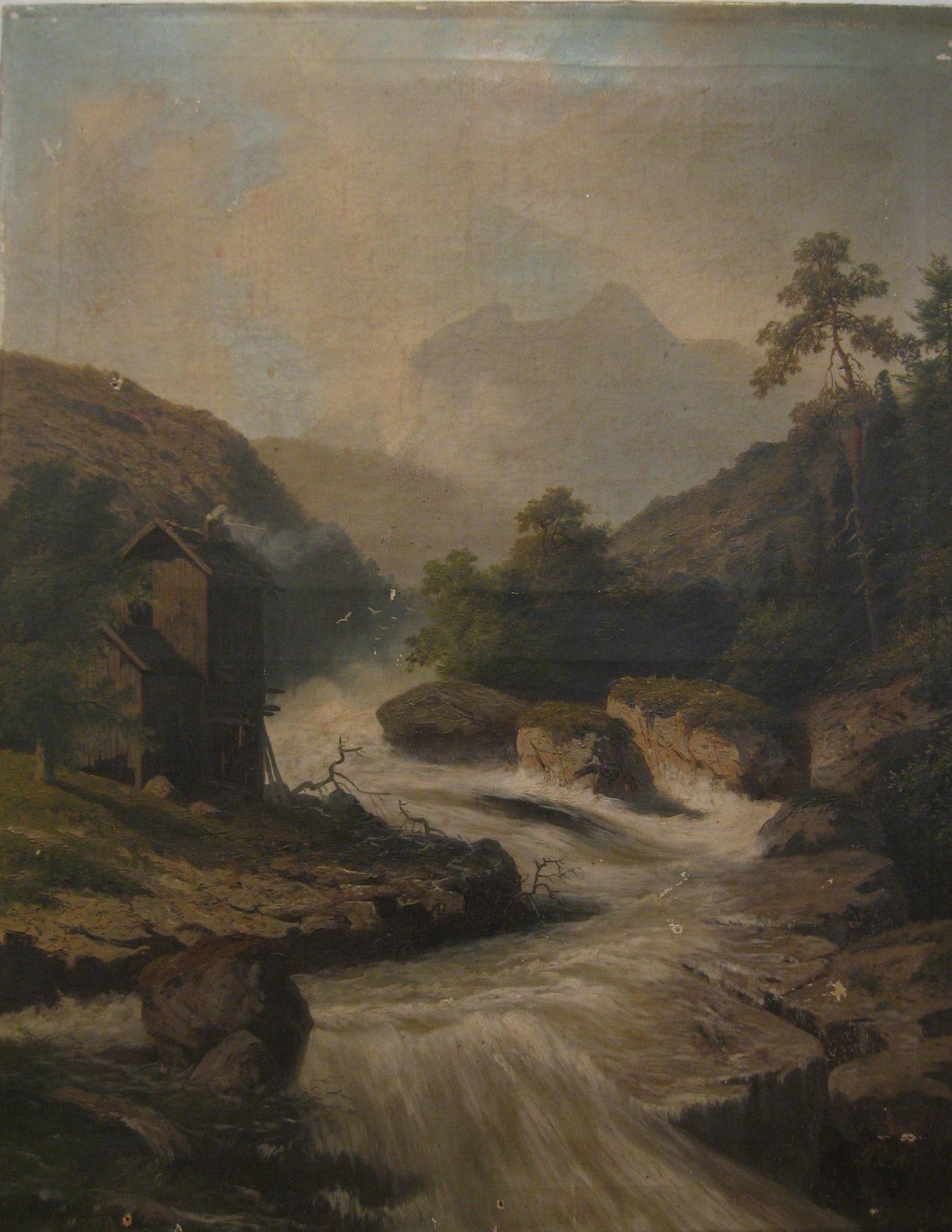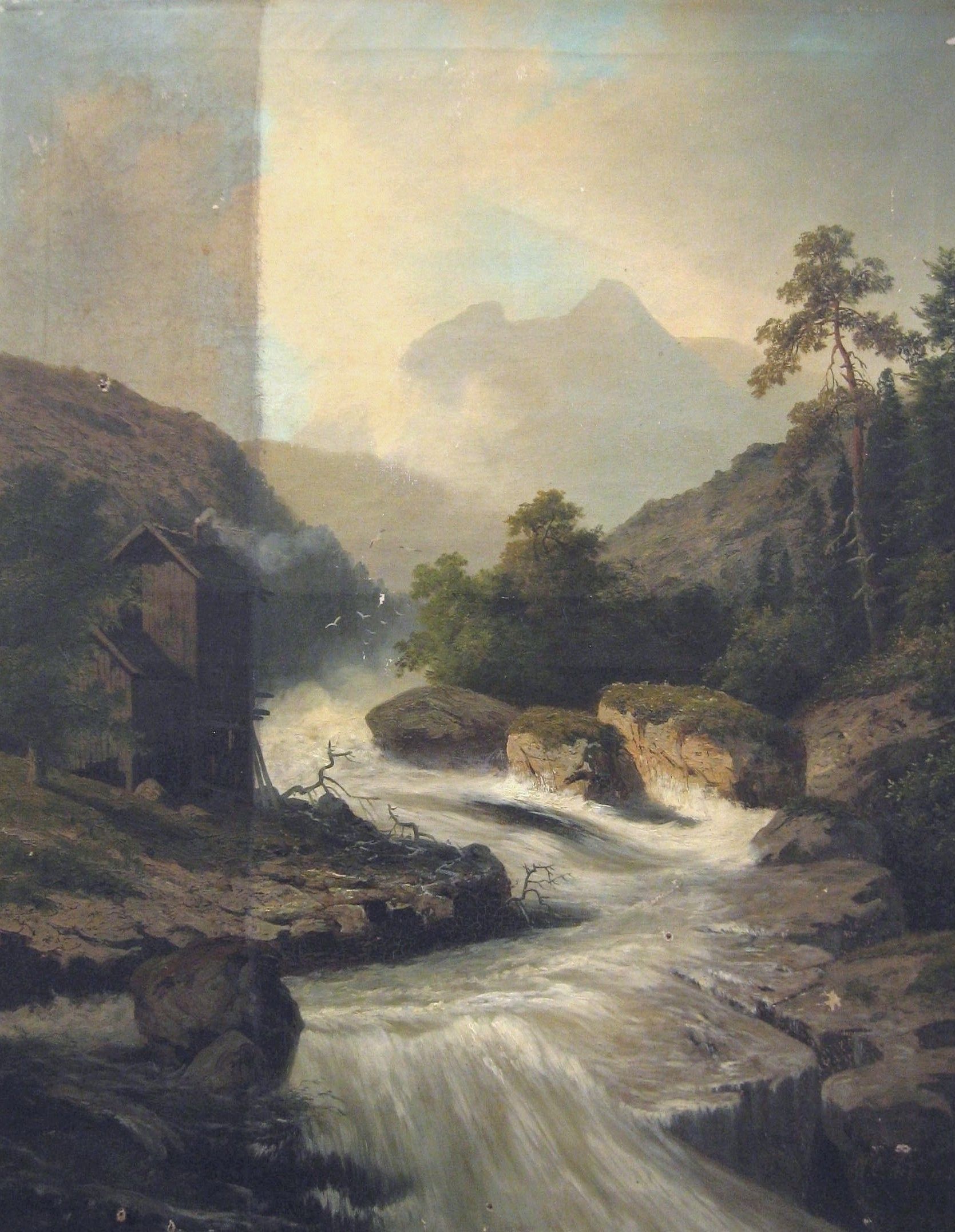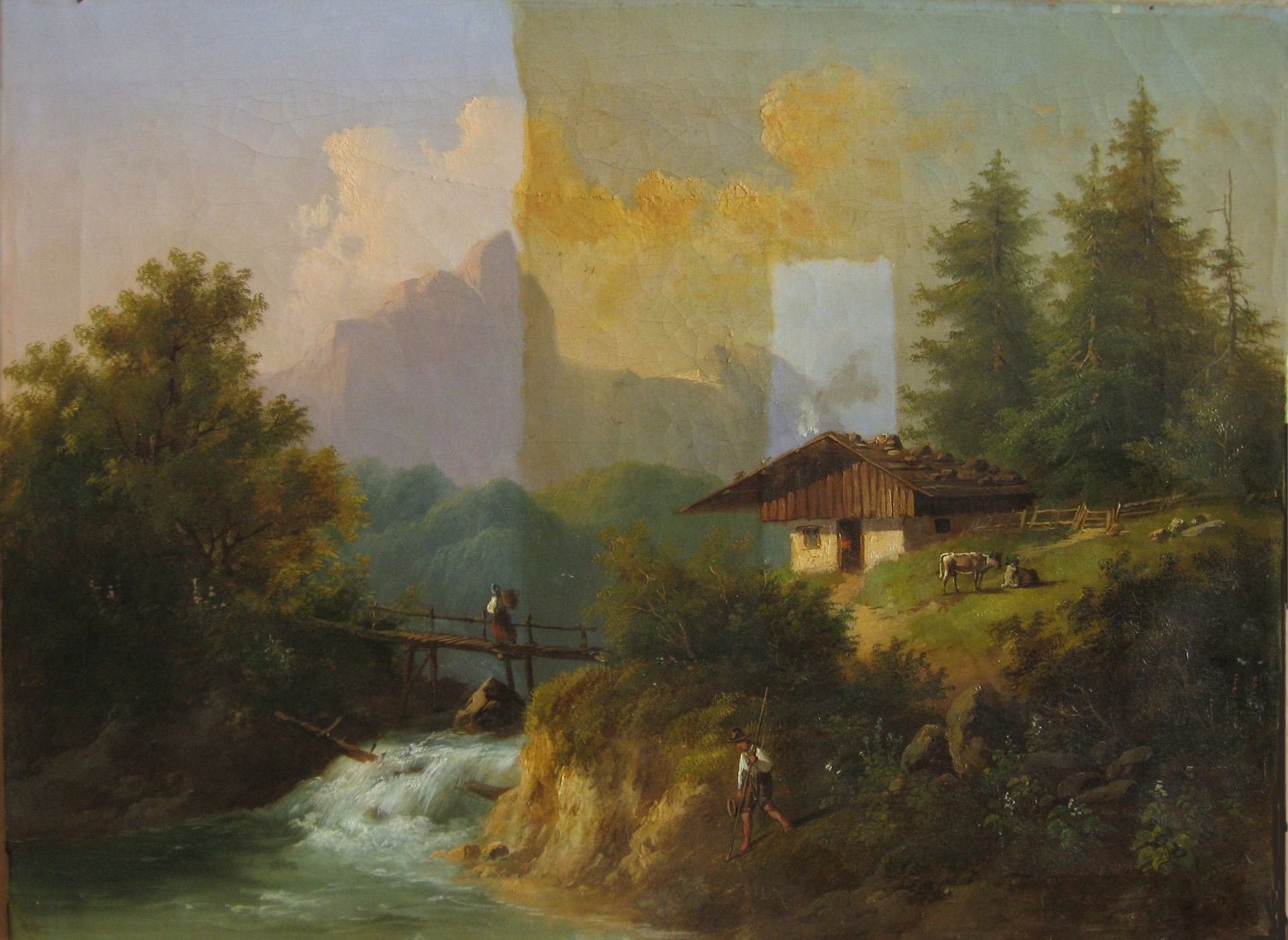 Franz Barbarini (1804-1873), 2. Hälfte des 19. Jh. "Alpenlandschaft mit Wassermühle". Zustand nach der Restaurierung.
