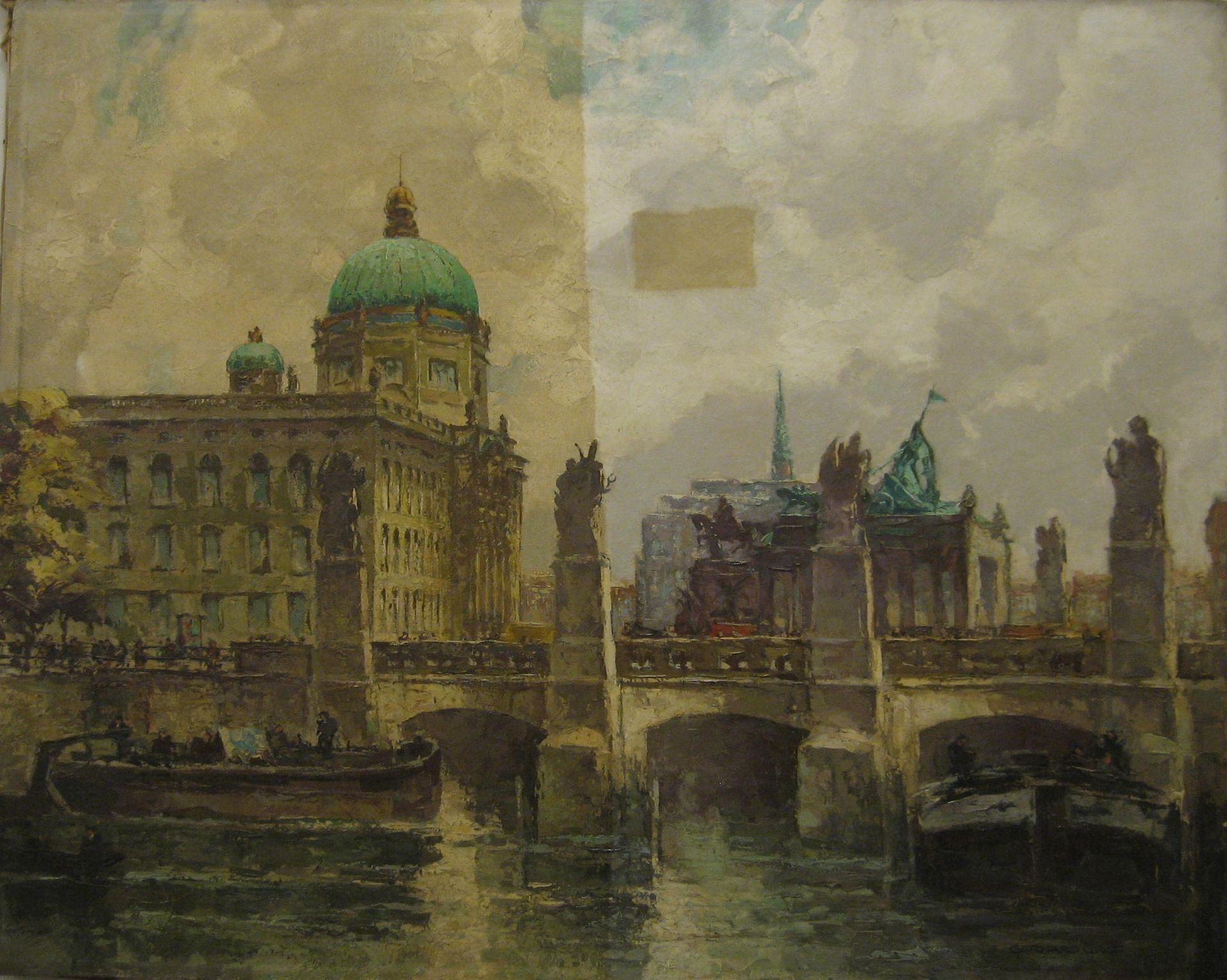 Gerhard Graf (1883-1960), um 1950 "Berliner Stadtschloss". Öl auf Leinwand. Zustand vor der Restaurierung (Malschichtoberfläche sehr stark durch Nikotinrauch verschmutzt, einzelne kleine Malschichtausbrüche).