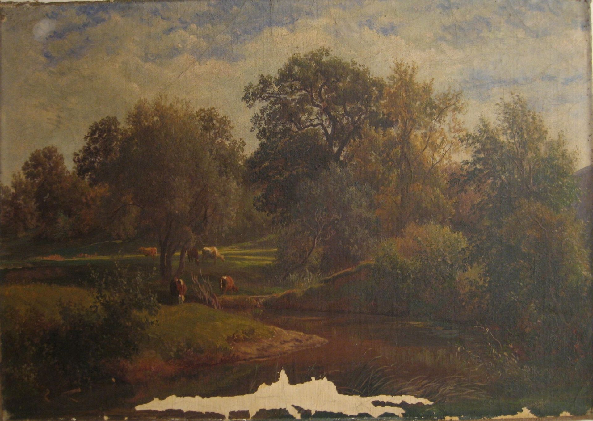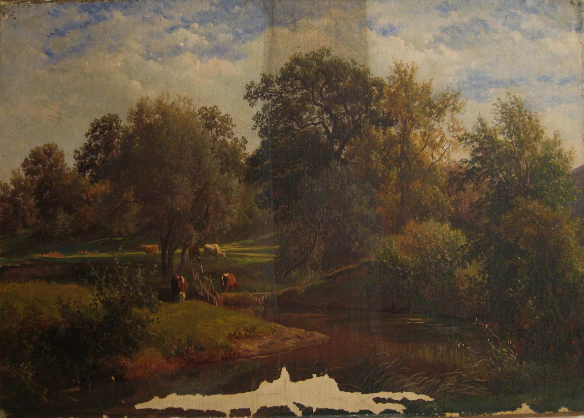 Süddeutscher Maler, vor 1900 "Landschaft mit weidenden Kühen". Öl auf Leinwand. Zustand vor der Restaurierung (Bildoberfläche verschmutzt, Firnis stark vergilbt, im unteren Bereich starke Malschichtverluste).