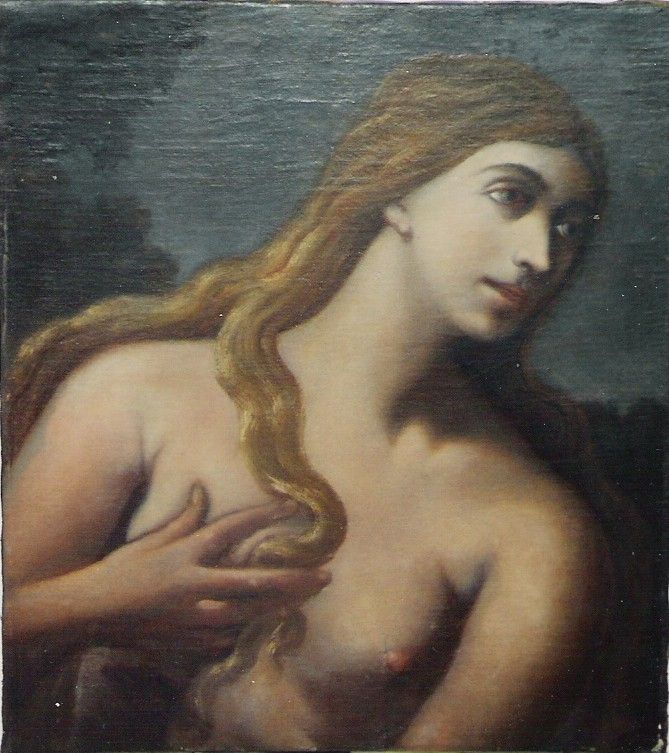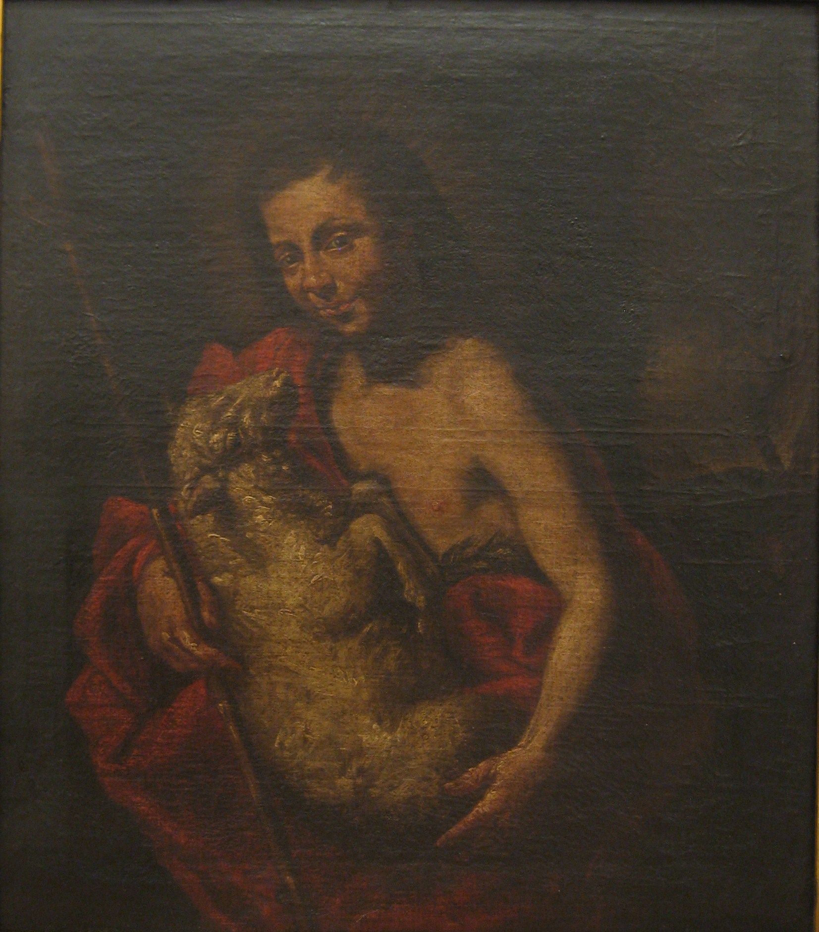 Luca Giordano (1634-1705) Umkreis, 1. Hälfte des 17. Jh. "Johannes der Täufer als Knabe". Öl auf Leinwand. Zustand vor der Restaurierung (mehrere dicke Firnisschichten stark nachgedunkelt und verschmutzt).