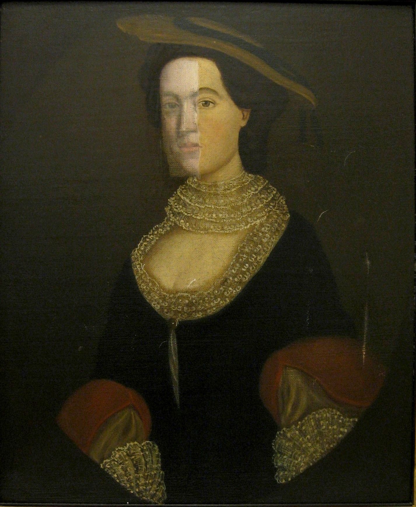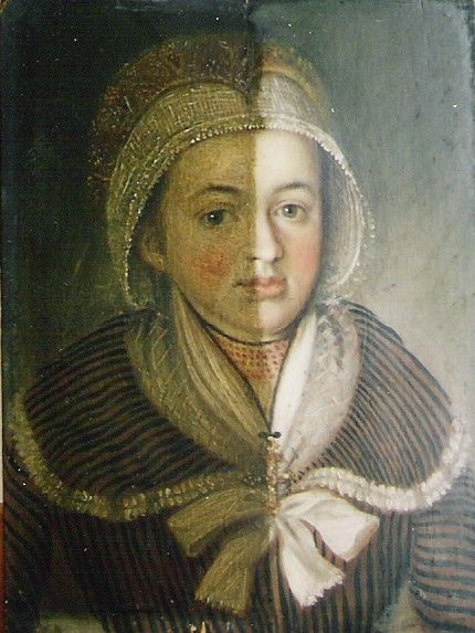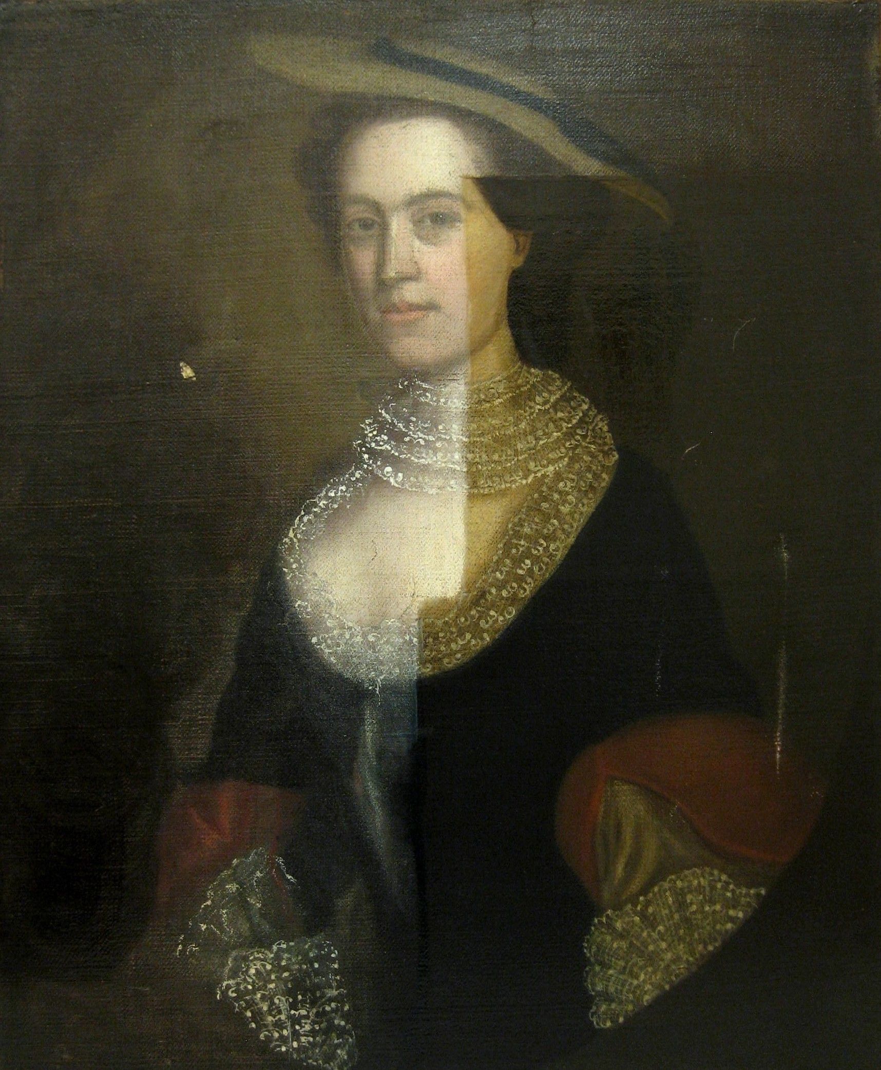 Deutscher Bildnismaler, 1. Drittel des 18. Jh. "Bildnis einer Adeligen". Öl auf Leinwand. Zustand während der Restaurierung (nach vollständiger Reinigung, Malschichtfestigung und Kittung; vor Retuschen).