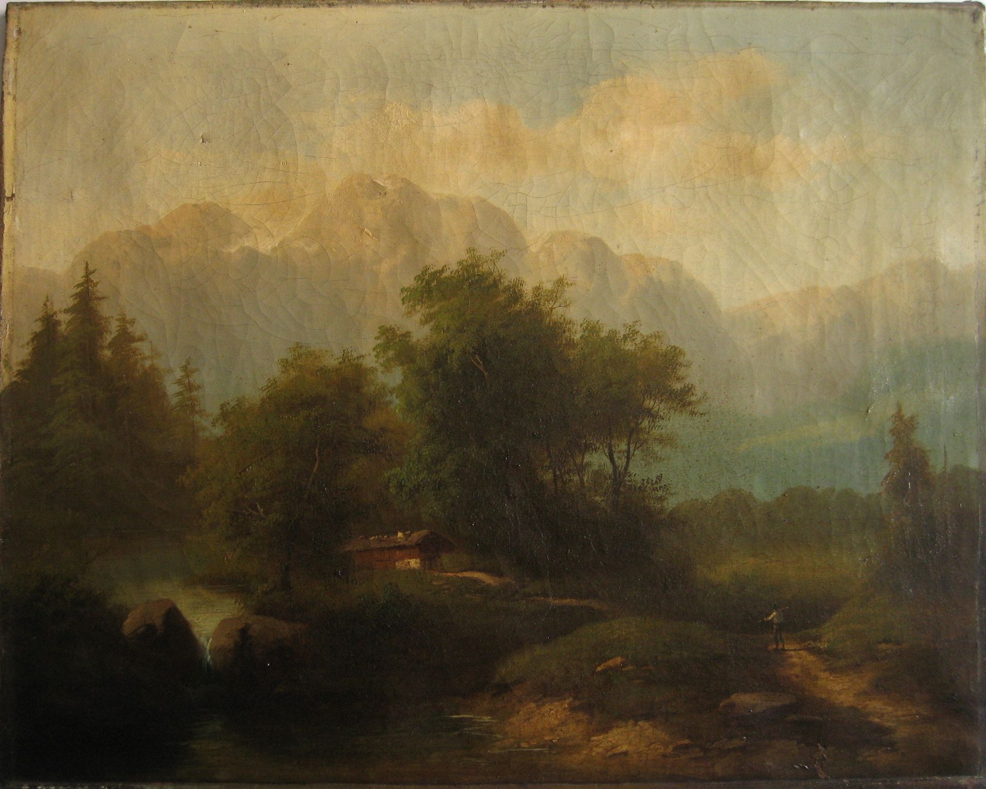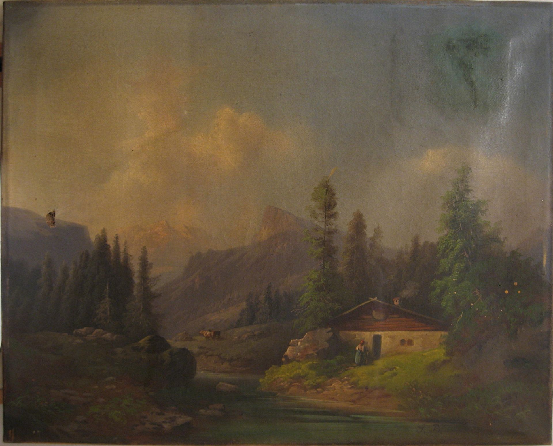 Gustav Barbarini (1840-1909), um 1880 "Gebirgslandschaft mit Hütte". Öl auf Leinwand. Zustand vor der Restaurierung (Bildoberfläche verschmutzt, Firnis stark vergilbt; im Himmelbereich mehrere Übermalungen und rechts oben ein unterklebter Riss).