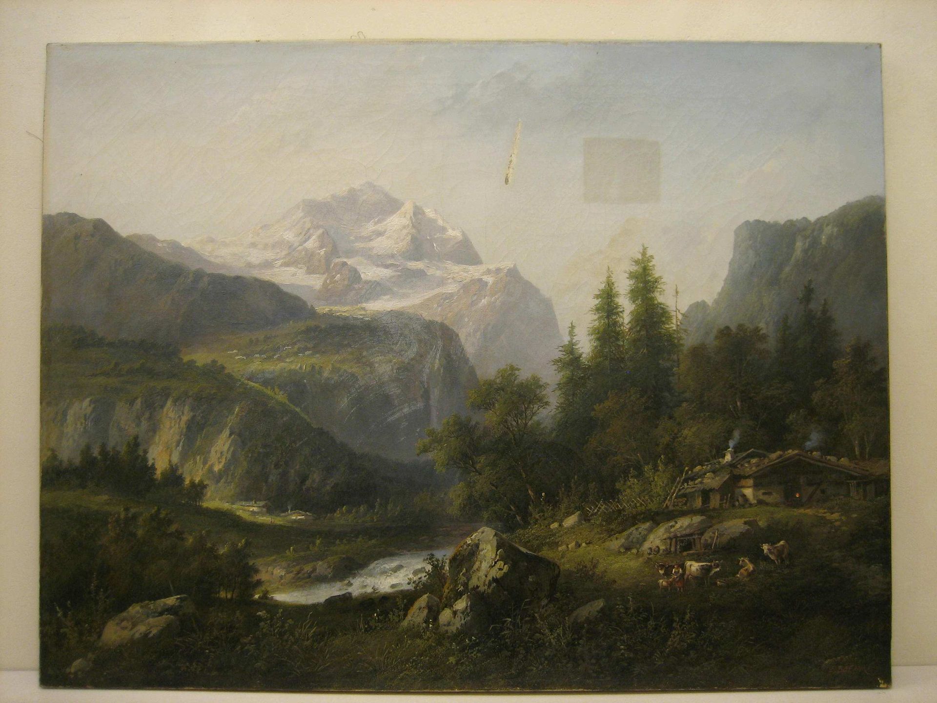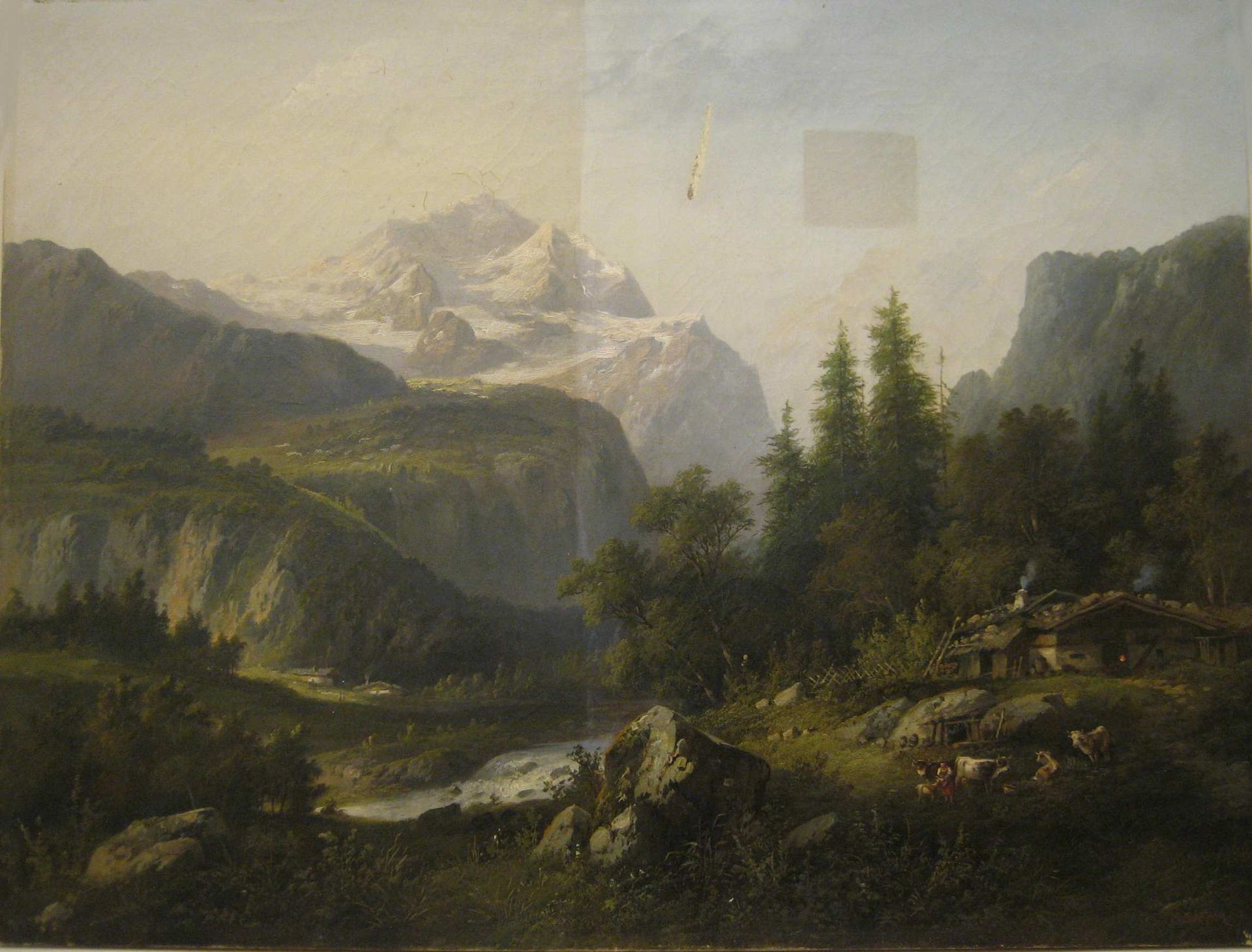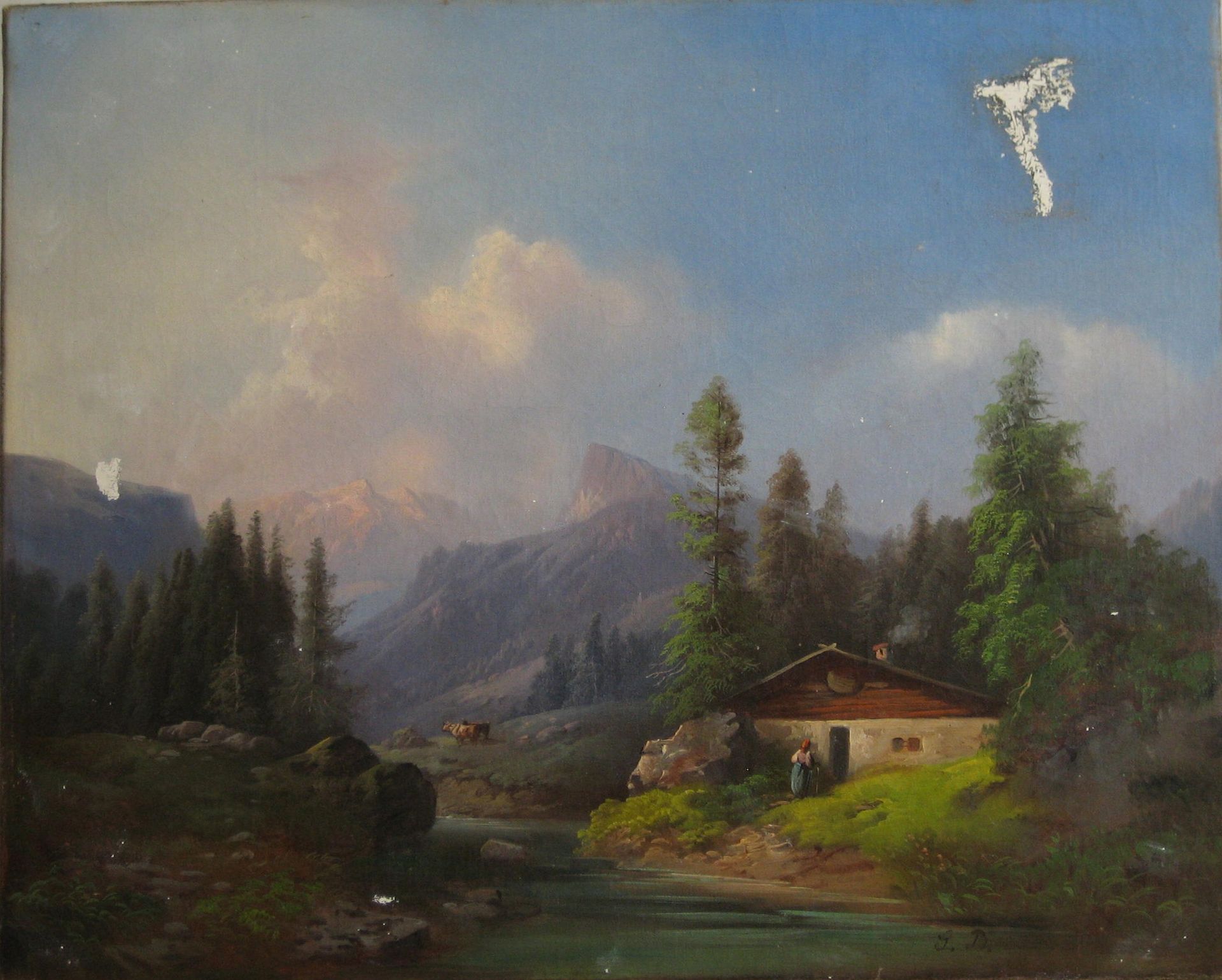 Gustav Barbarini (1840-1909), um 1880 "Gebirgslandschaft mit Hütte". Zustand nach der Restaurierung.