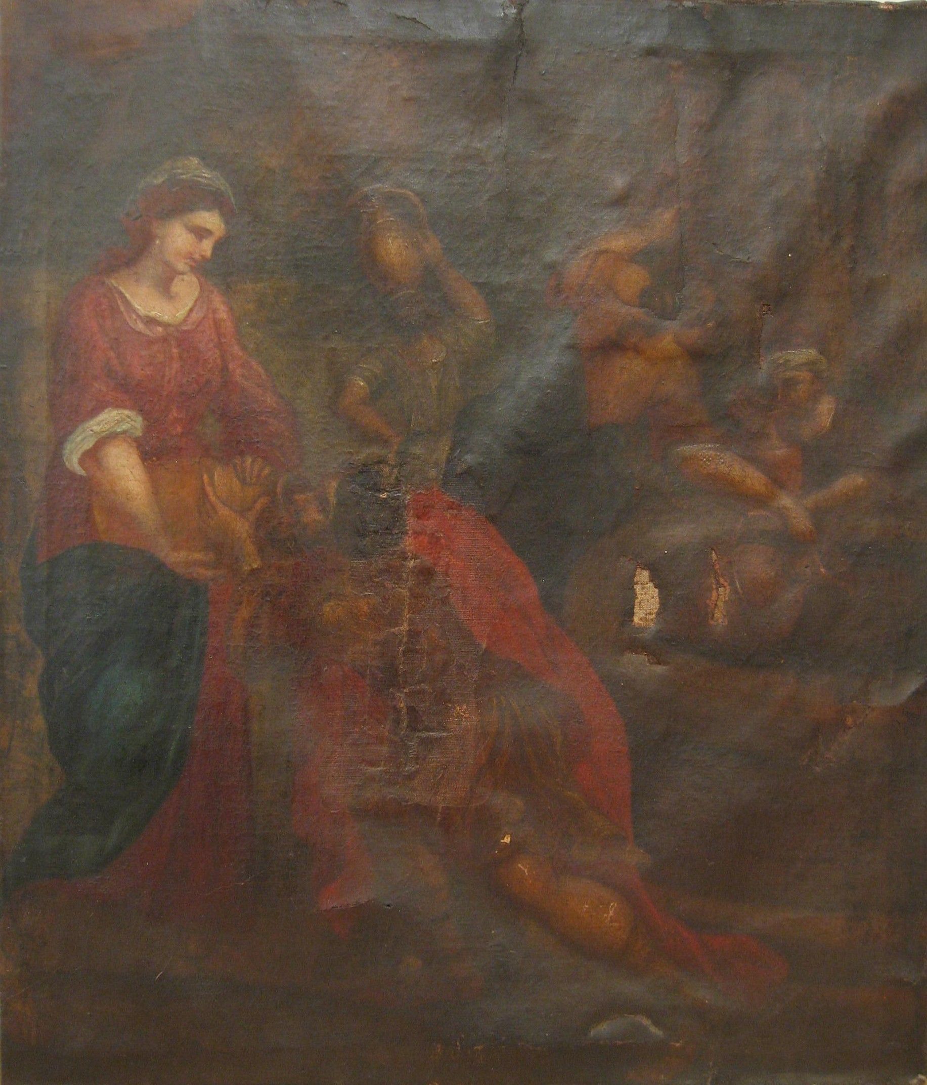 Akademischer Maler, wohl französisch, 19. Jh. “Tod der Dido“. Öl auf Leinwand, maroufliert. Zustand während der Restaurierung (nach Teilreinigung; mittig eine ca. 29 cm lange Kittung freigelegt).