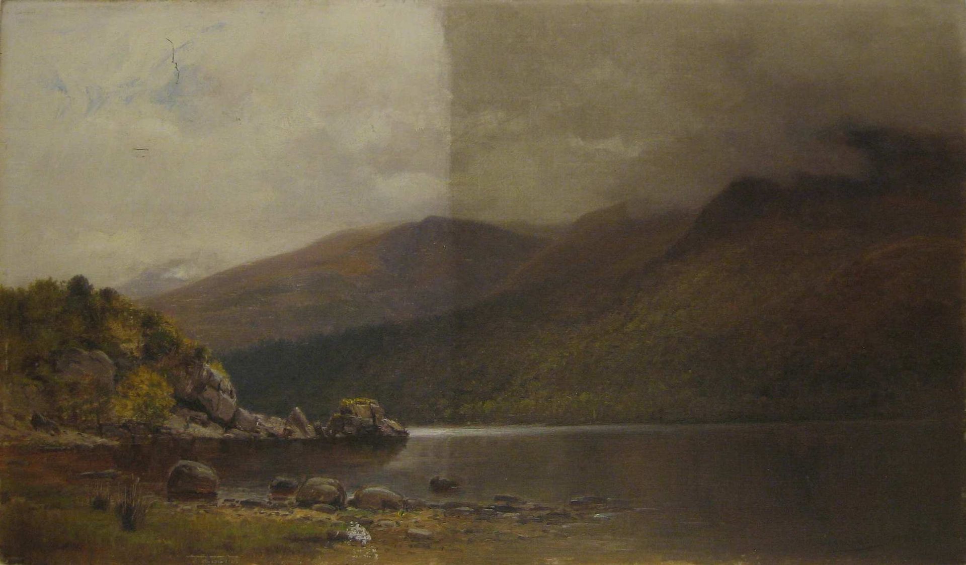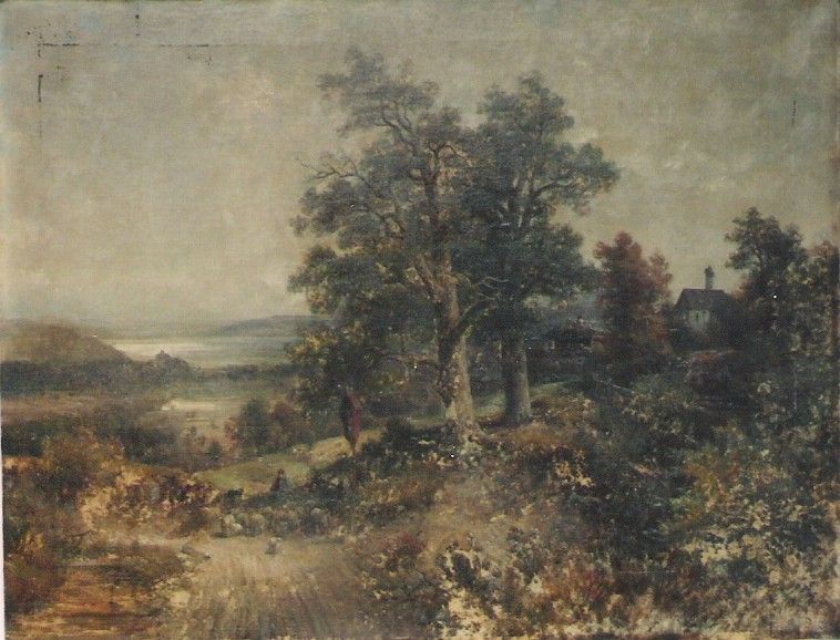 Alexander Williams (1846-1930), vor 1900 “Irische Landschaft”. Öl auf Leinwand, maroufliert. Zustand vor der Restaurierung (Bildoberfläche stark durch Ruß verschmutzt, einzelne Malschichtfehlstellen).