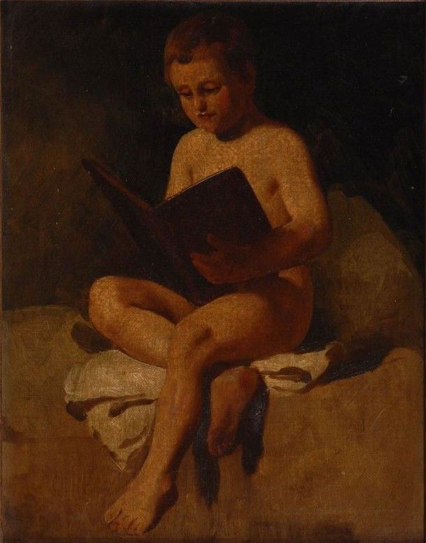 Unbekannter Maler, 18. Jh. "Lesender Knabe". Öl auf Leinwand, doubliert. Zustand vor der Restaurierung (Gemäldeoberfläche verschmutzt, Firnis stark vergilbt).