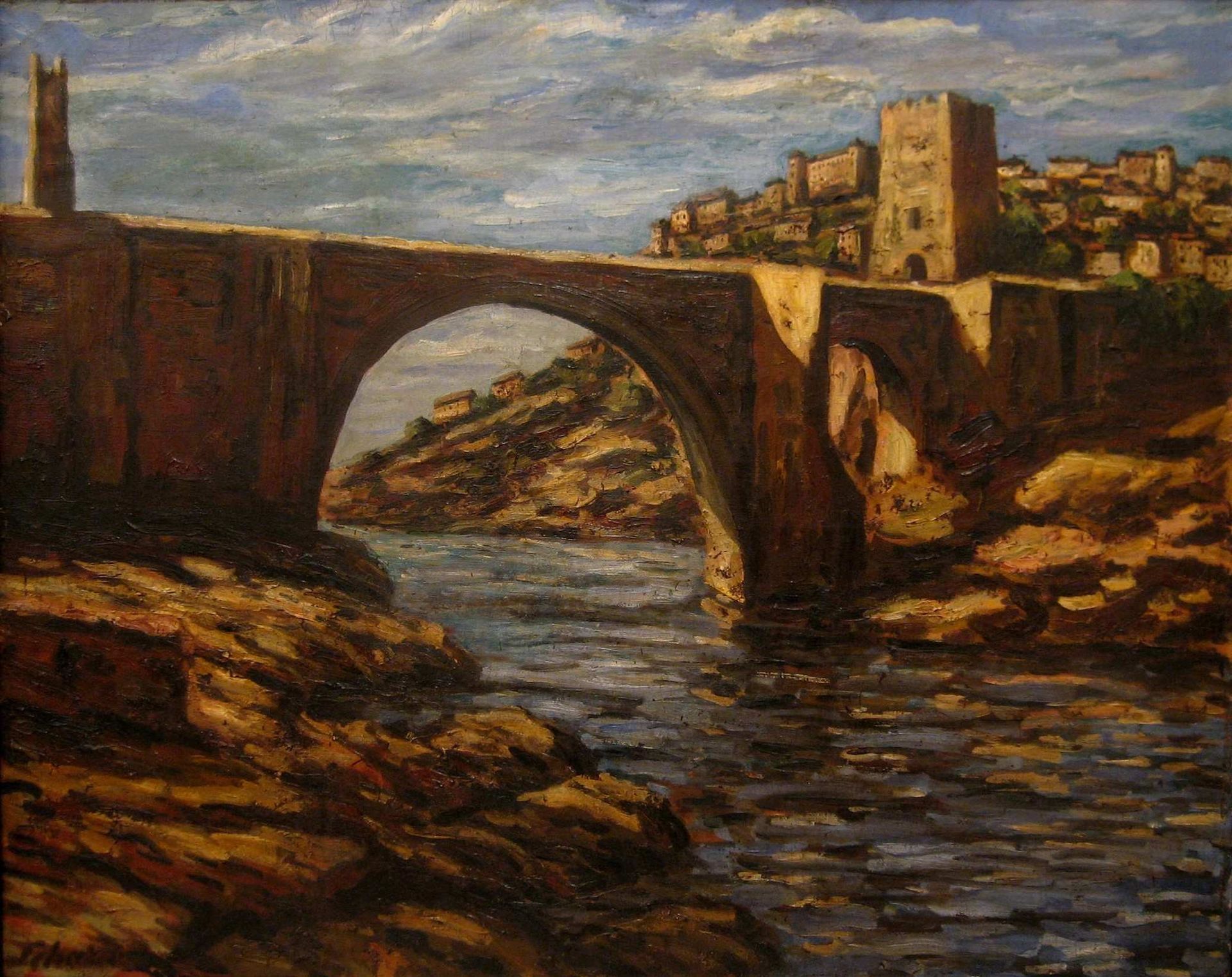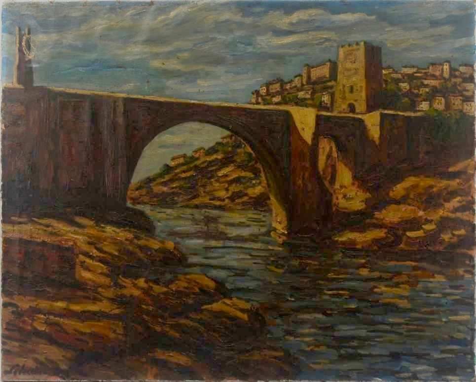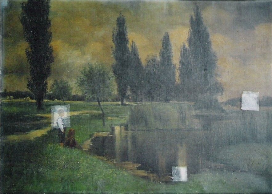 Gustave Colin (1828-1910), um 1890 "Landschaft mit Wassermühle". Öl auf Leinwand. Zustand vor der Restaurierung (Malschicht extrem verschmutzt durch Rußablagerungen).