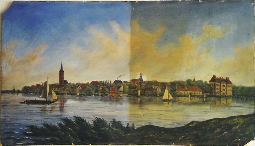 Deutscher Biedermeiermaler, 1830 "Ansicht von Brandenburg an der Havel". Öl auf Eisenblech. Zustand während der Restaurierung nach Teilreinigung (starke Malschichtausbrüche, besonders im unteren Bereich; Firnis stark vergilbt, Bildoberfläche verschmutzt).