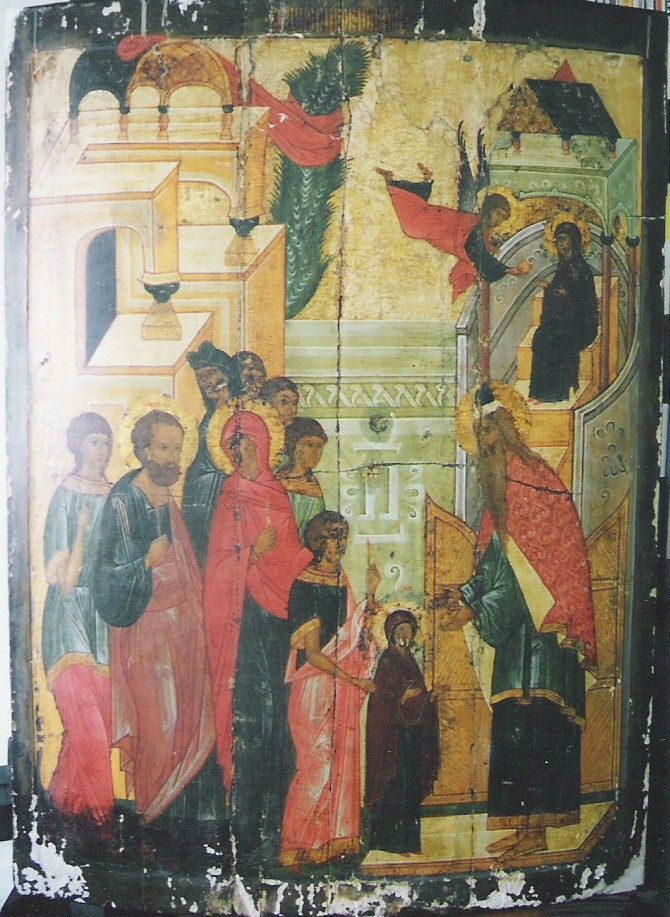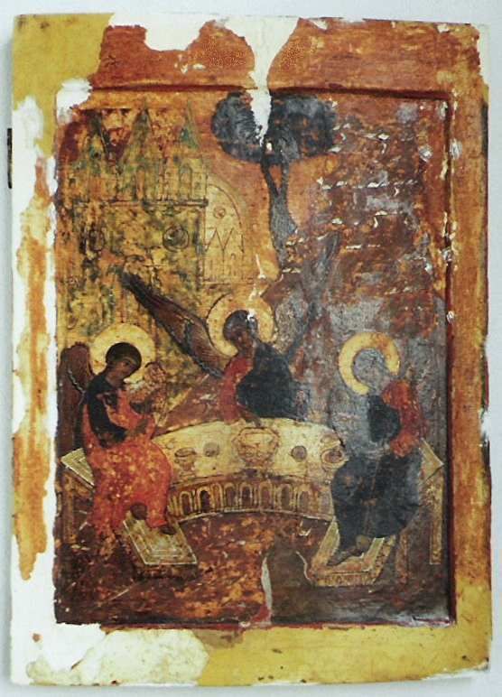 Russischer Ikonenmaler nach Andriej Rublow, 17. Jh. "Die Hl. Dreifaltigkeit". Eitempera auf Holz. Zustand vor der Restaurierung (Spuren vorangegangener Restaurierungsversuche; großflächige alte Kittungen; Malschicht sehr stark verputzt).