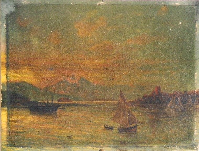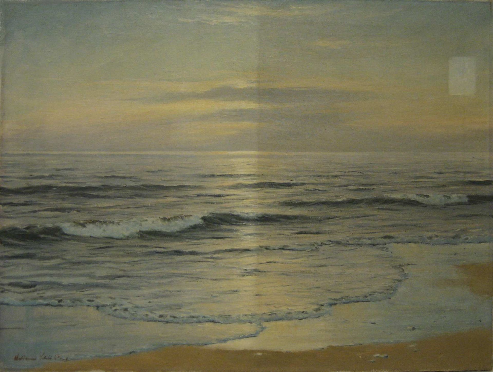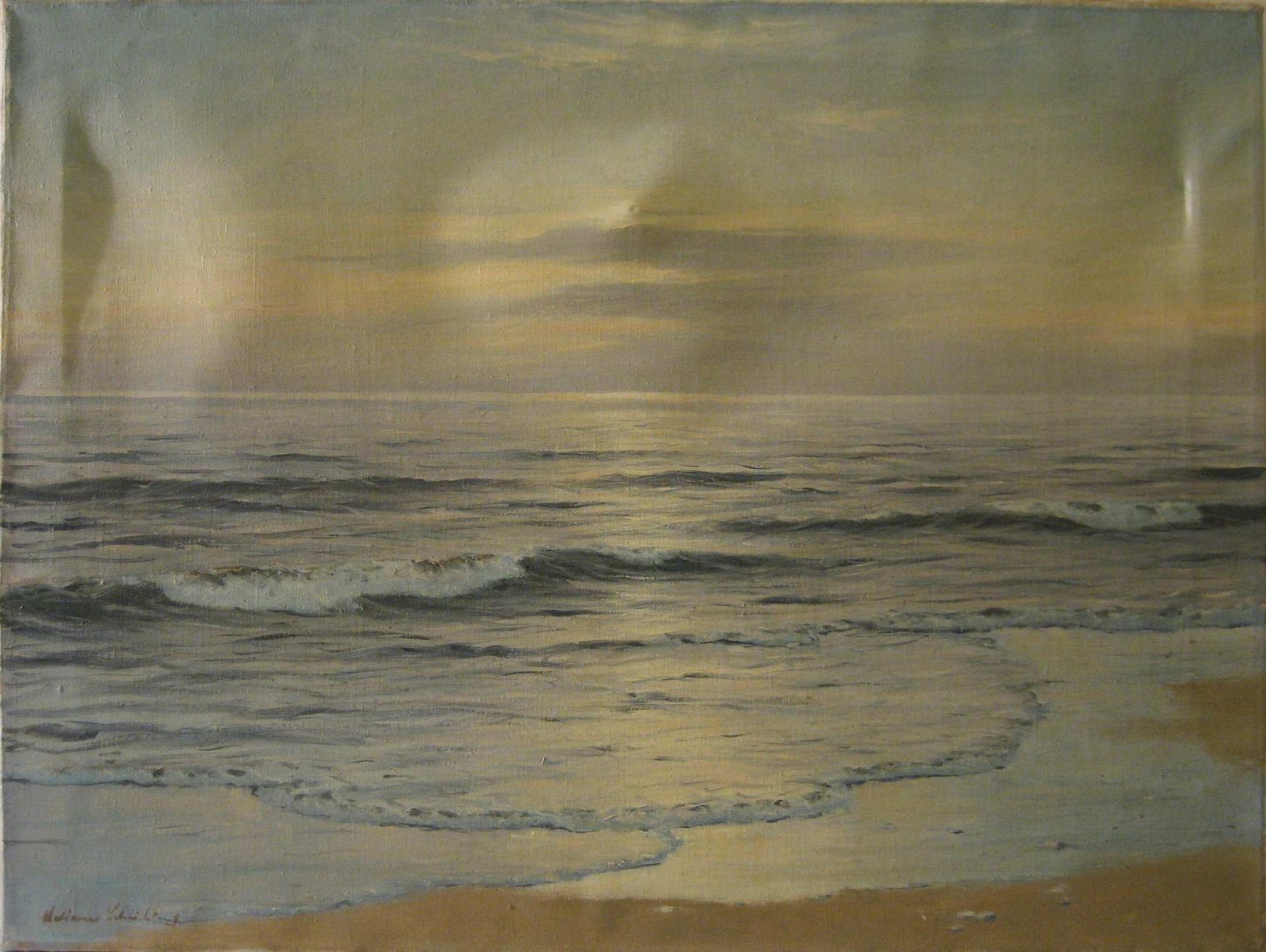 Waldemar Schlichting (1896-1970), nach 1960 "Sonnenuntergang an der Ostsee". Öl auf Leinwand. Zustand vor der Restaurierung (Bildoberfläche verschmutzt, Leinwanddeformationen, wie Abdrücke, Beulen und Dellen).