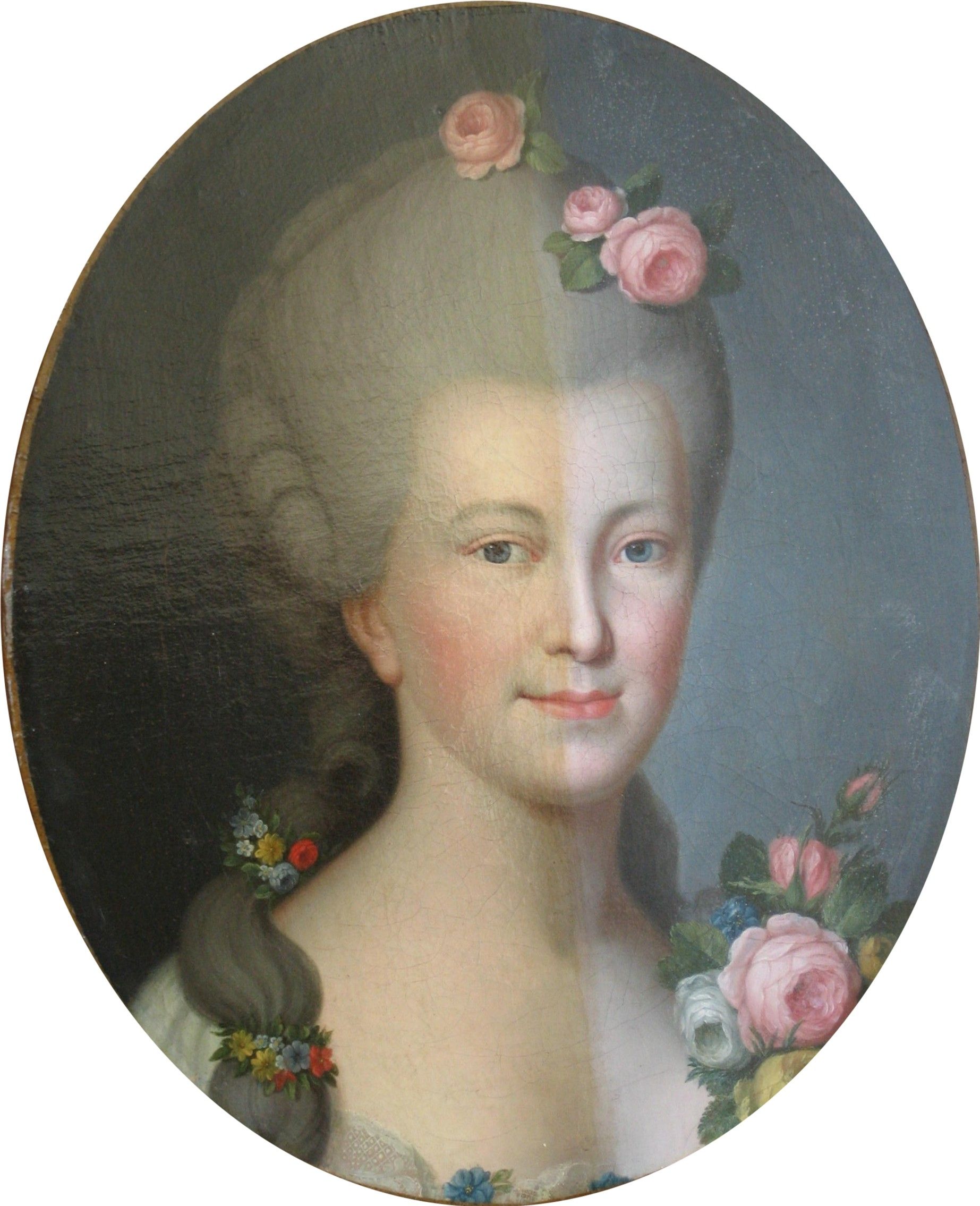 Louis de Silvestre (1675-1760) Umkreis, nach 1743 "Bildnis der Königin Maria Josepha von Polen". Öl auf Leinwand. Zustand während der Restaurierung (nach Teilabnahme der Übermalungen und des Firnisses; im freigelegten Inkarnatbereich starke Abreibungen).
