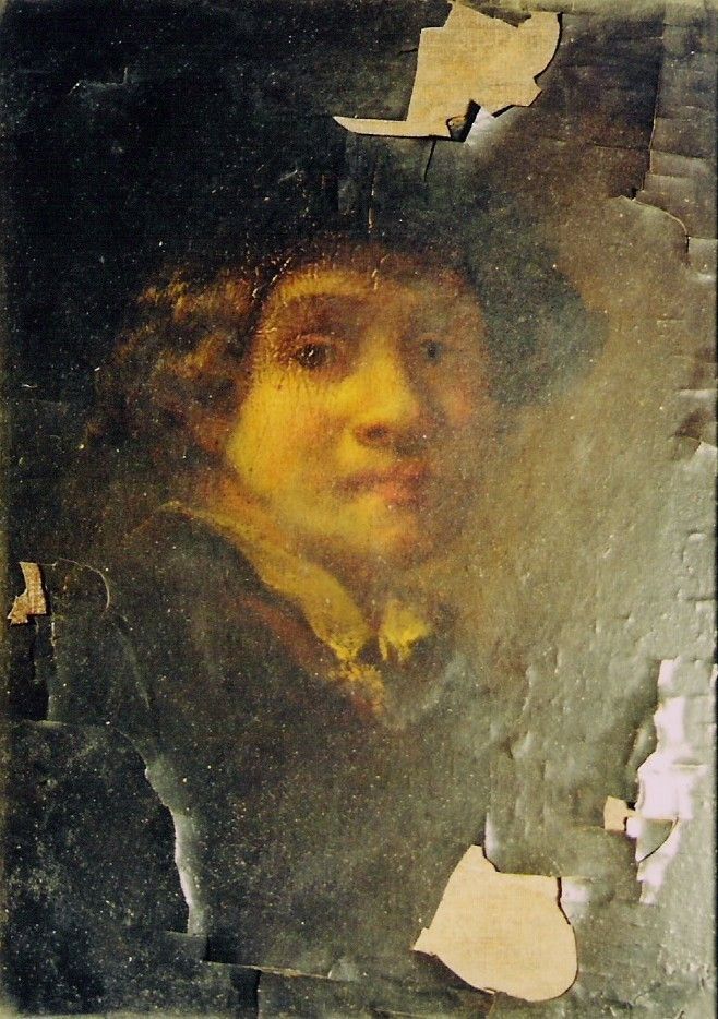 Bildnismaler, 17. Jh. "Robert I. Baron von Signau". Öl auf Leinwand. Zustand während der Restaurierung (nach Abnahme des Gemäldes vom defekten Spannrahmen und nach Planierung der Umschlagränder nach Teilreinigung; alte Kittungen teilweise entfernt).