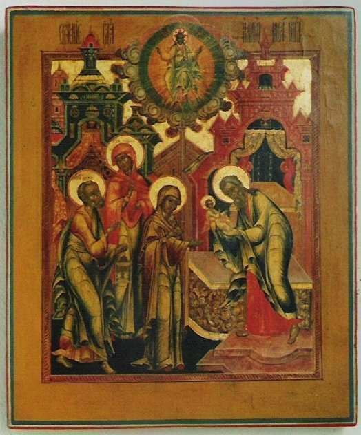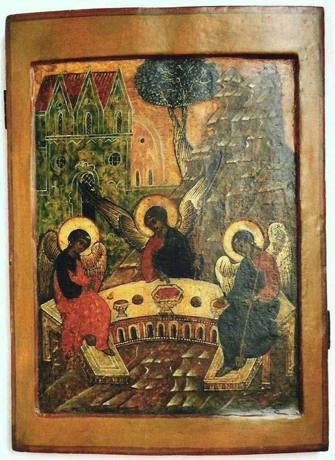 Russischer Ikonenmaler nach Andriej Rublow, 17. Jh. "Die Hl. Dreifaltigkeit". Eitempera auf Holz. Zustand nach der Restaurierung (alte Kittungen ergänzt und überarbeitet; Komposition partiell rekonstruiert, Verputzungen und Fehlstellen retuschiert).