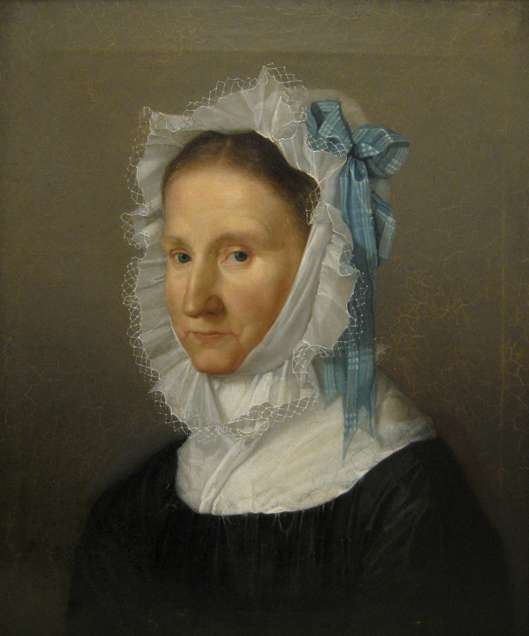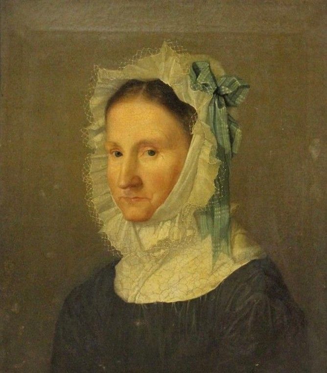 Biedermeier Maler, um 1830 "Bildnis eines Mädchens mit Haube und Halsschmuck". Öl auf Holztafel. Zustand vor der Restaurierung (Bildoberfläche stark verschmutzt, Firnis vergilbt).