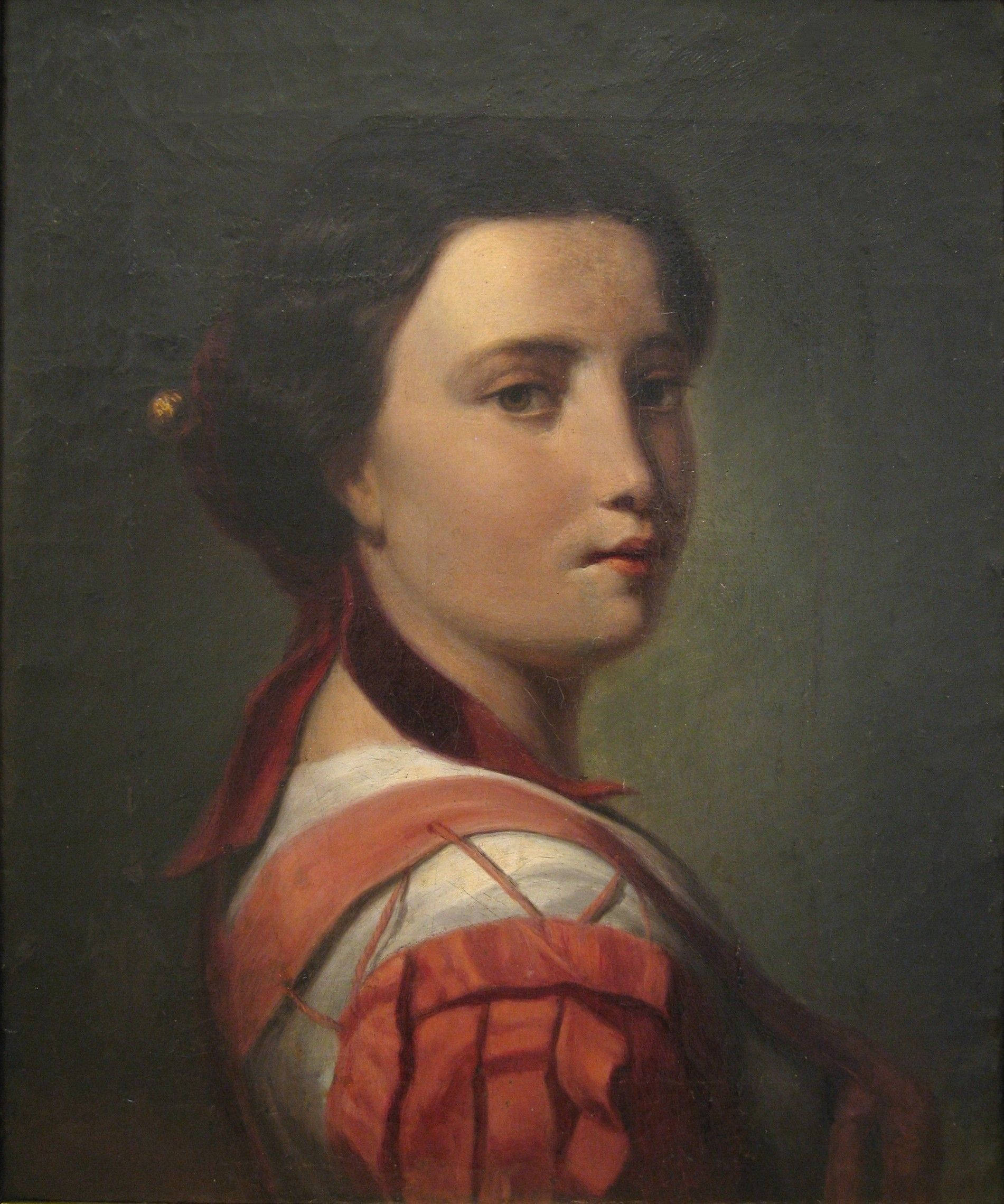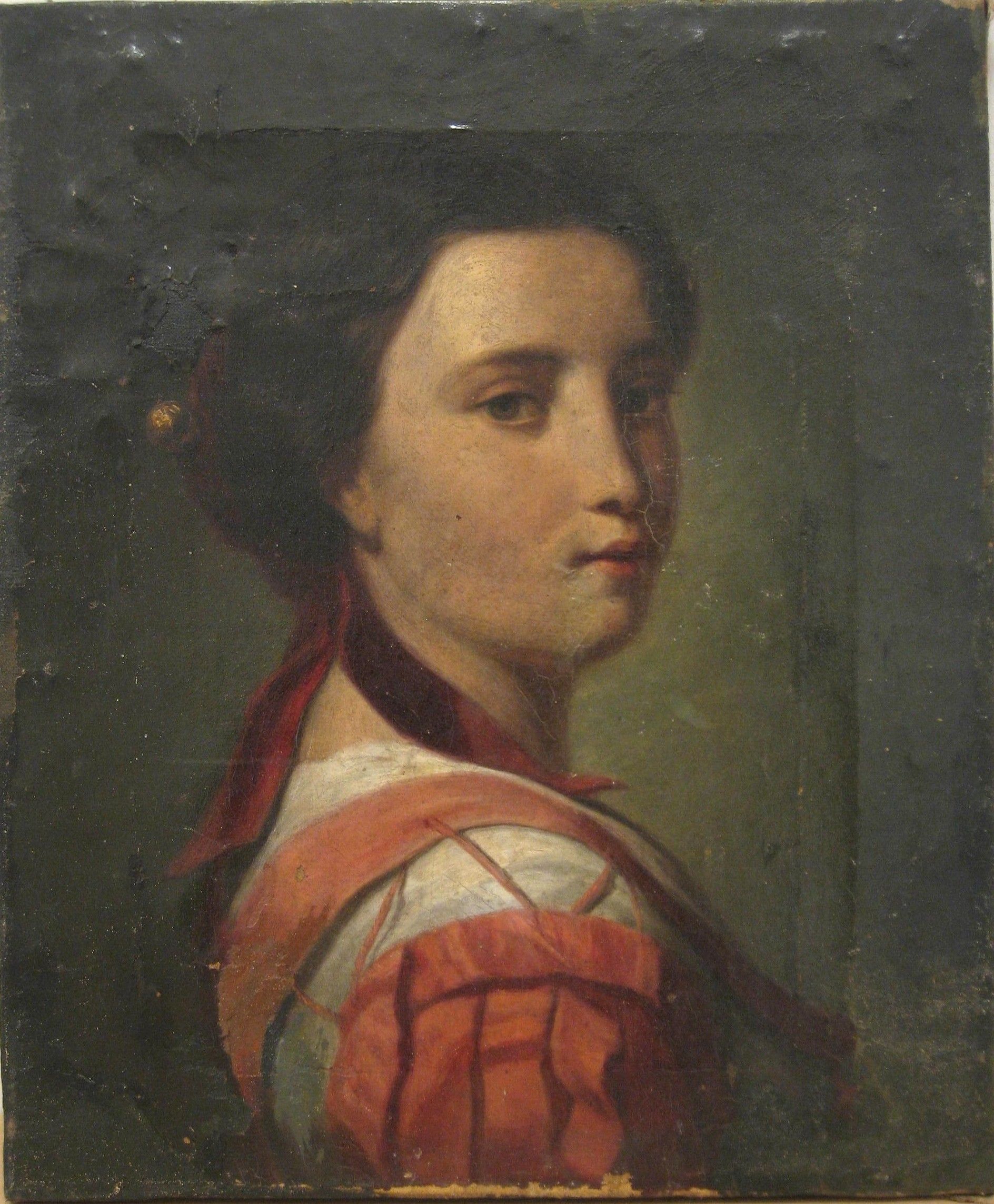 Französischer Maler, nach 1850 "Junge Römerin mit Krug". Öl auf Leinwand. Zustand vor der Restaurierung (starke Leinwanddeformationen; Firnis stark vergilbt, einzelne Übermalungen).