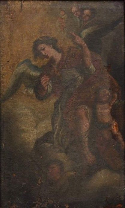 Flämischer Maler, 17. Jh. "Allegorische Darstellung" (Fragment). Öl auf Leinwand. Zustand vor der Restaurierung in übermaltem Zustand (das Bild wurde im Laufe des 19. Jh. beschnitten, doubliert und vollständig übermalt).
