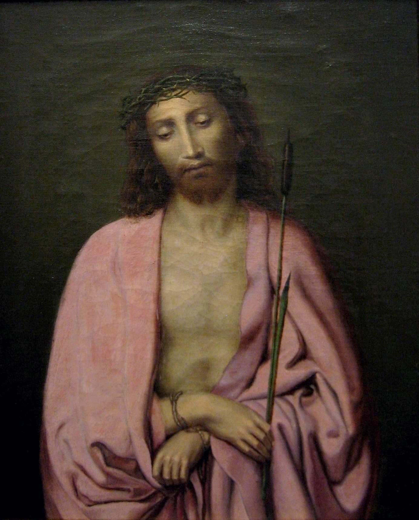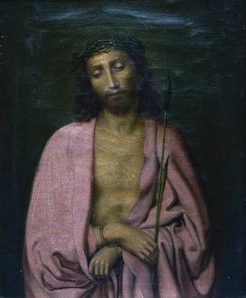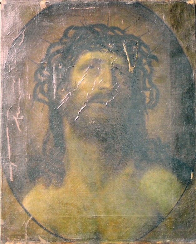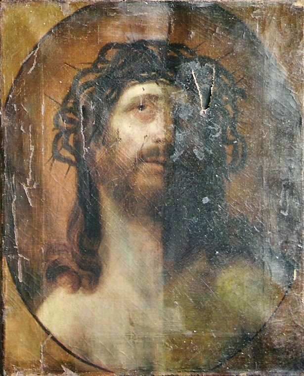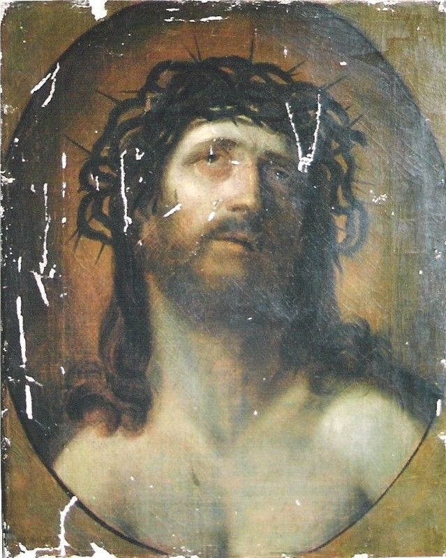 Guido Reni (1575-1624) Nachfolger, wohl 17. Jh. "Christus mit der Dornenkrone". Öl auf Leinwand. Zustand vor der Restaurierung (Firnis vergilbt, mehrere längliche Malschichtverluste und Runzeln; Malschicht insgesamt instabil; V-förmiger Riss).