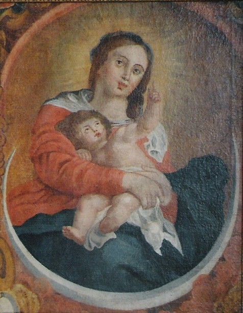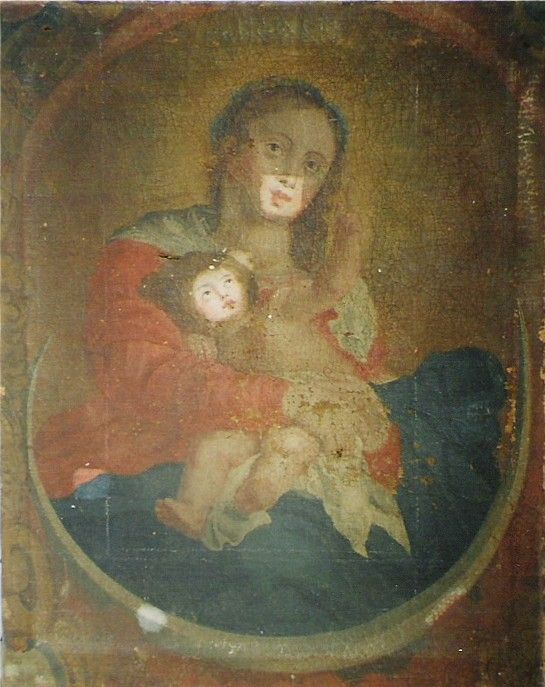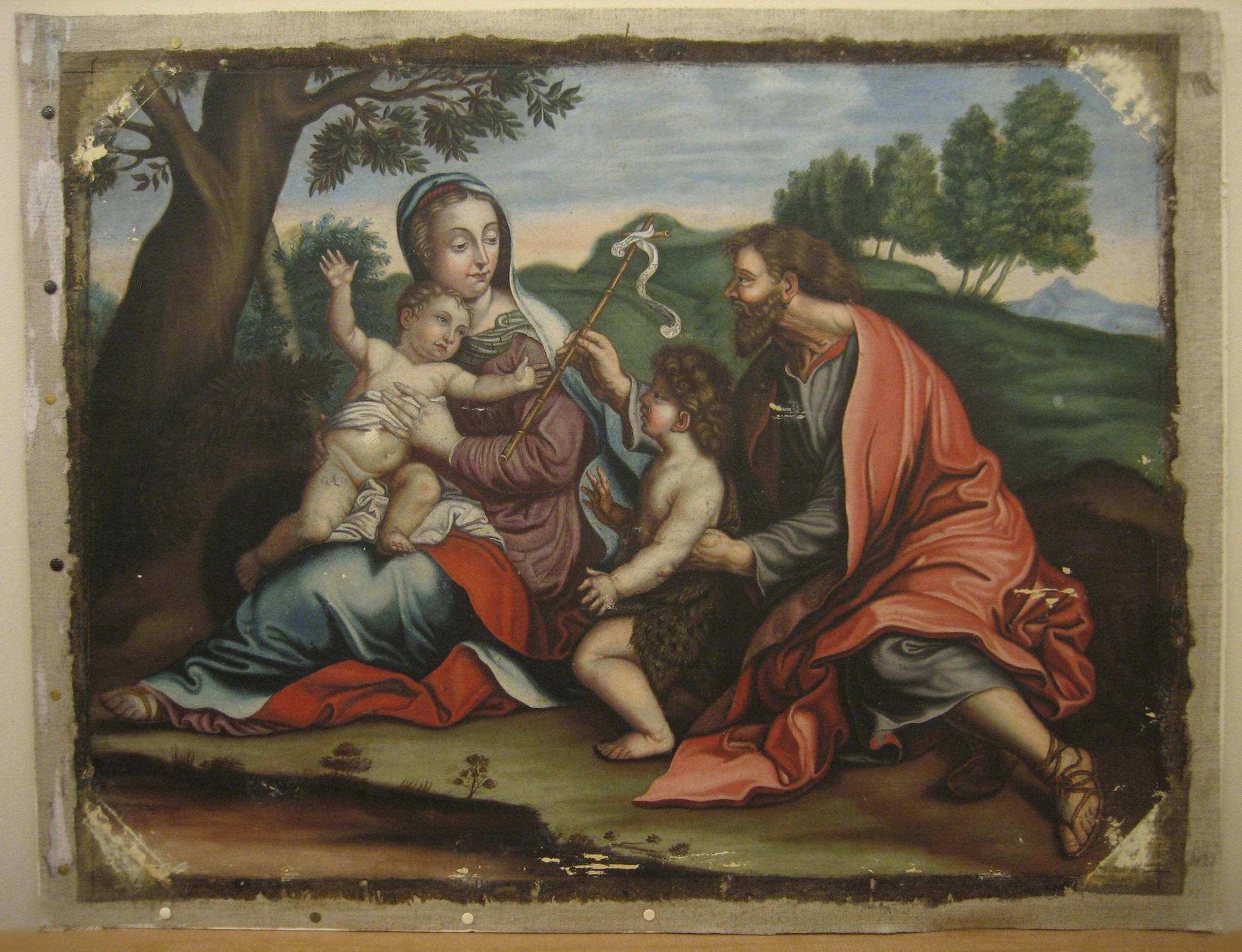 Kirchenmaler, 18. Jh. “Hl. Familie mit Johannes d. Täufer”. Öl auf Leinwand. Zustand vor der Restaurierung (Bildoberfläche verschmutzt, Firnis vergilbt, alte Reparaturen und Retuschen, Leinwanddeformationen; ursprünglich rechteckiges Format).