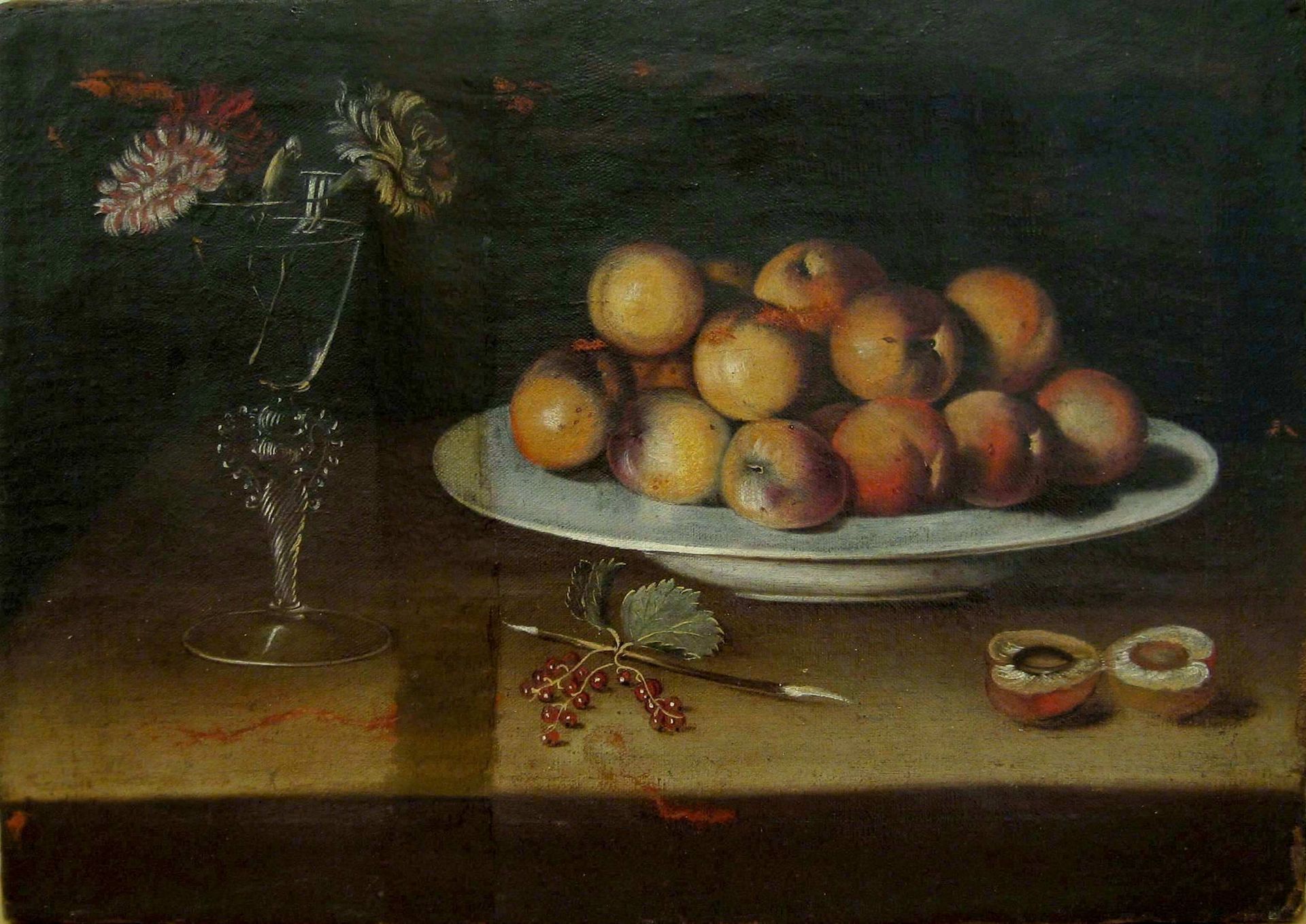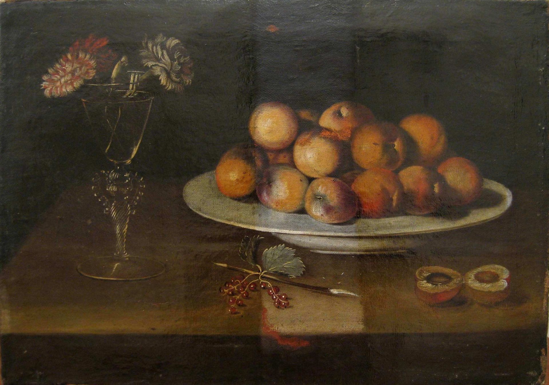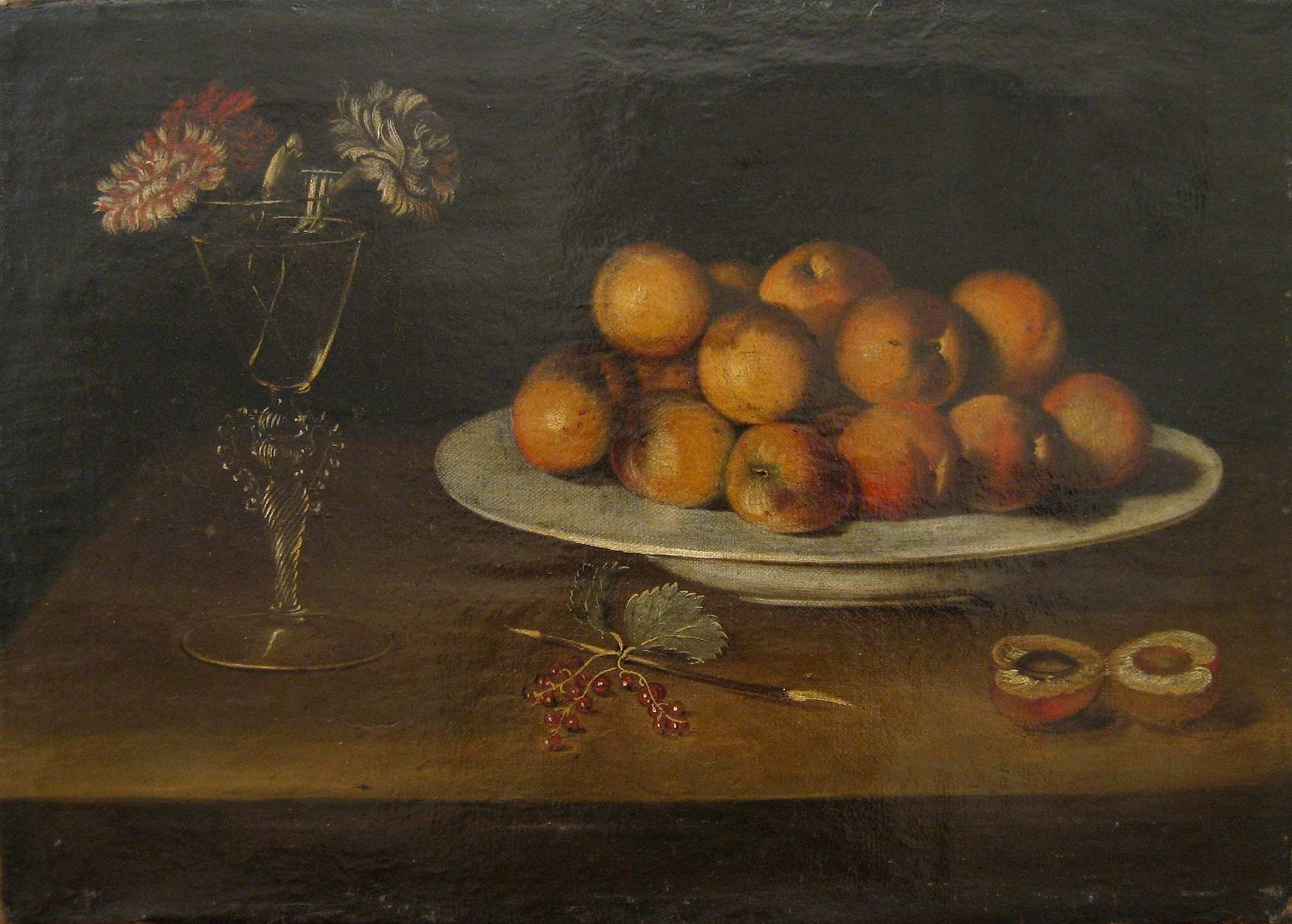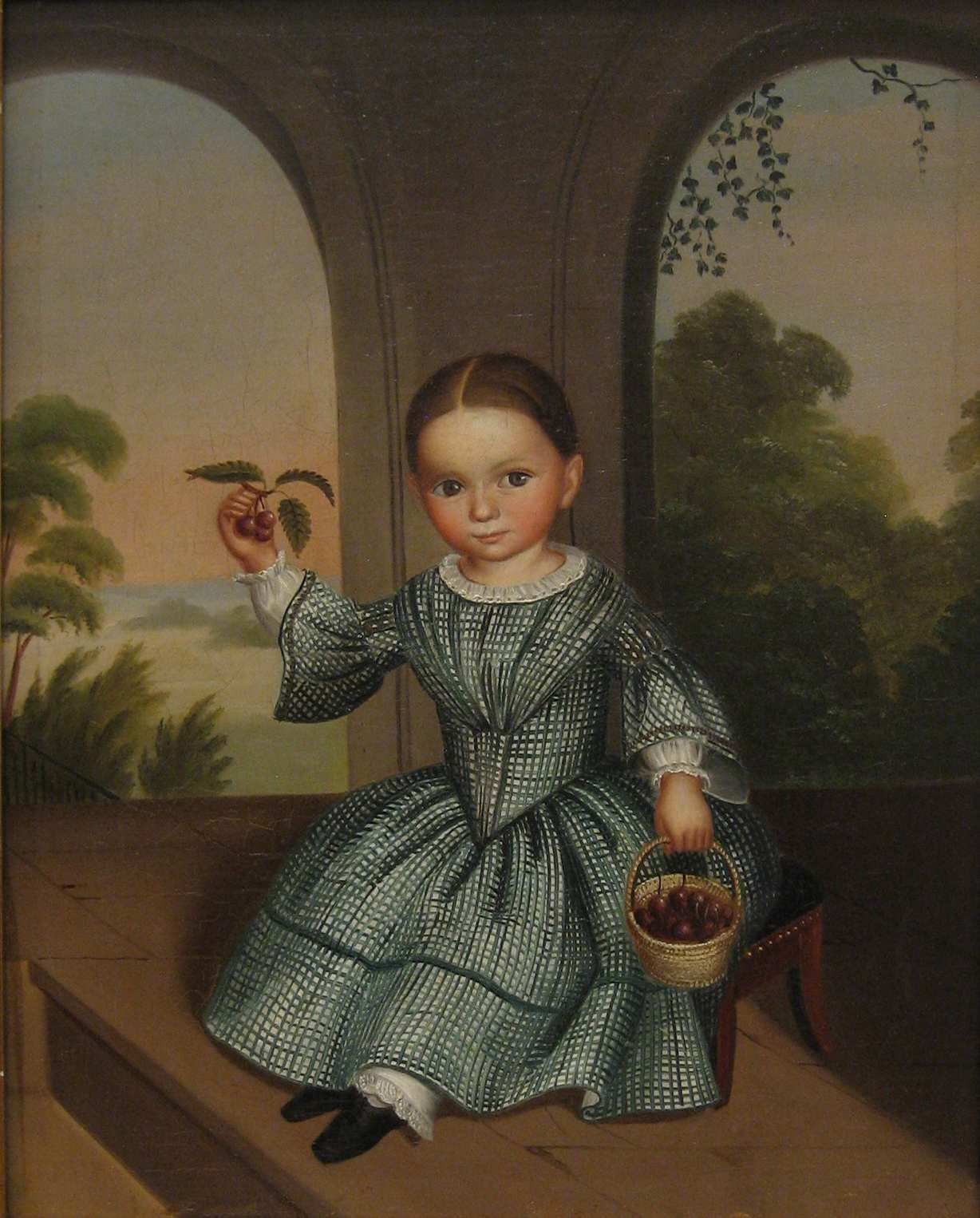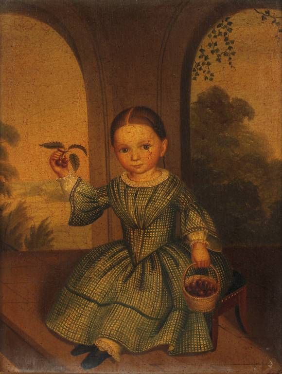 Deutscher Biedermeiermaler, um 1820-30 "Bildnis eines Mädchens mit Kirschenkorb". Öl auf Leinwand. Zustand vor der Restaurierung (Bildoberfläche verschmutzt, eingefärbter Firnis stark nachgedunkelt).