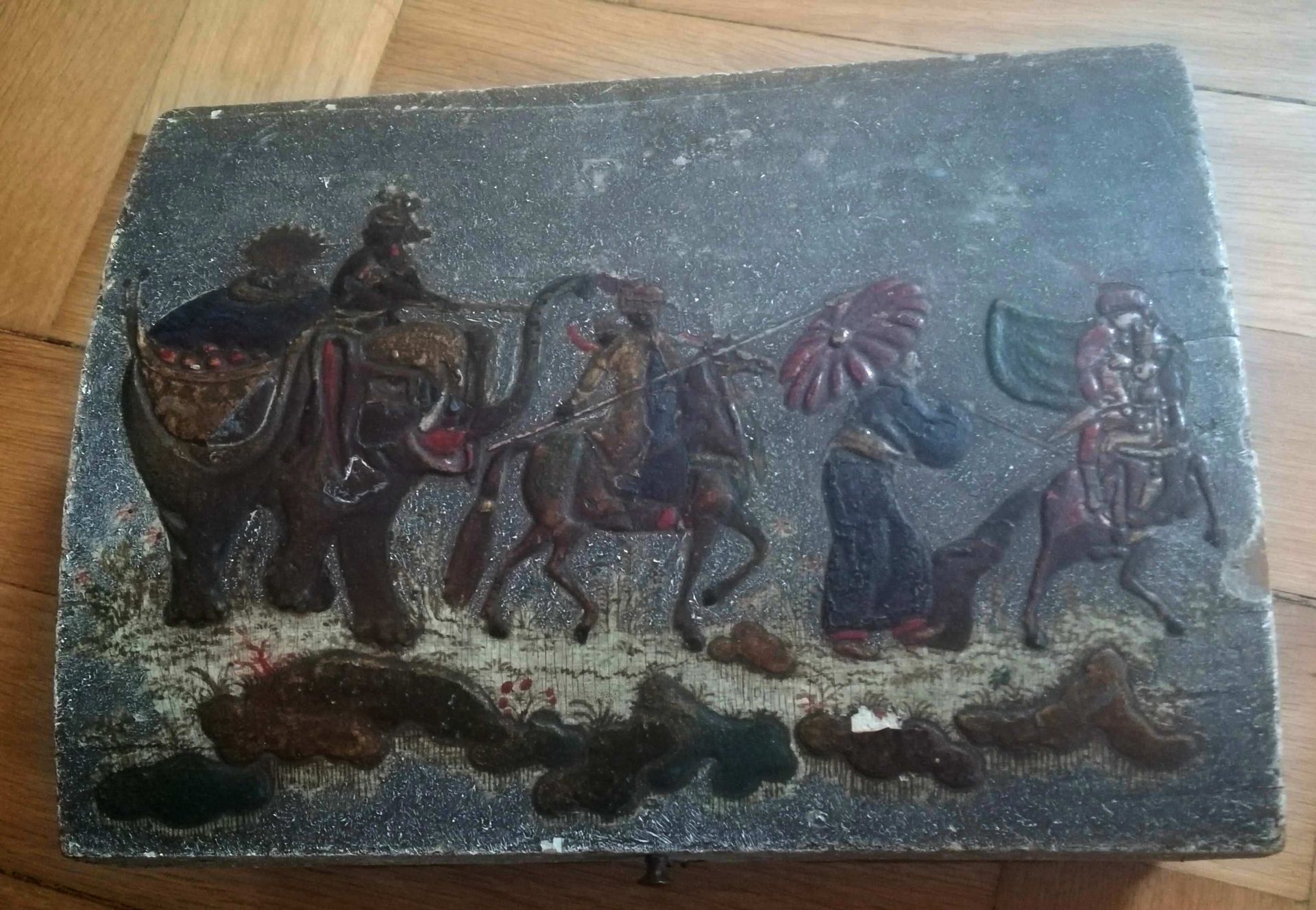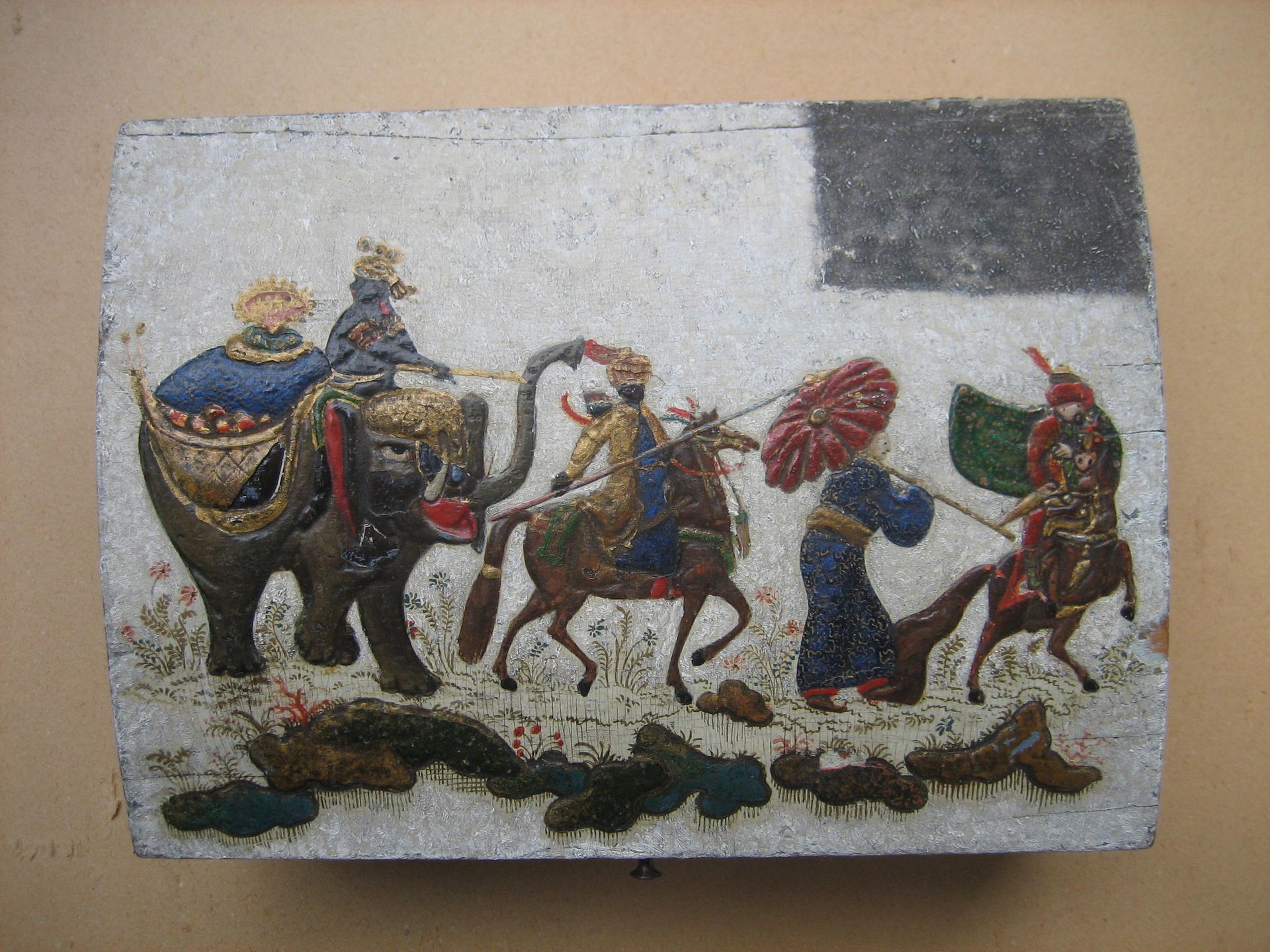 Sachsen, 18. Jh. Rokoko-Holzkästchen, weiß gefasst, mit buntem reliefartigem Chinoiserie-Dekor. Zustand vor der Restaurierung (starke Verschmutzungen durch Ruß; einzelne Fassungs- und Dekorausbrüche; Deckelholzriss).